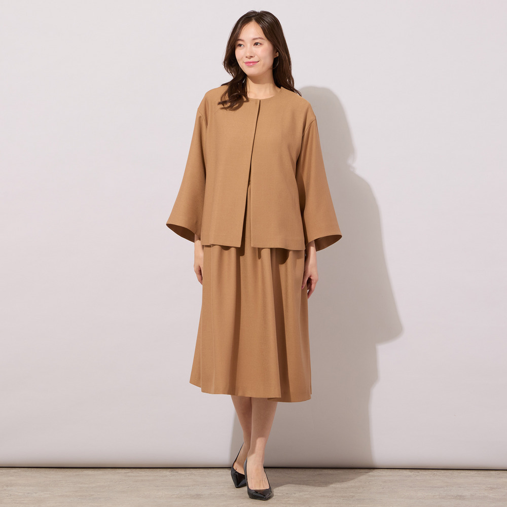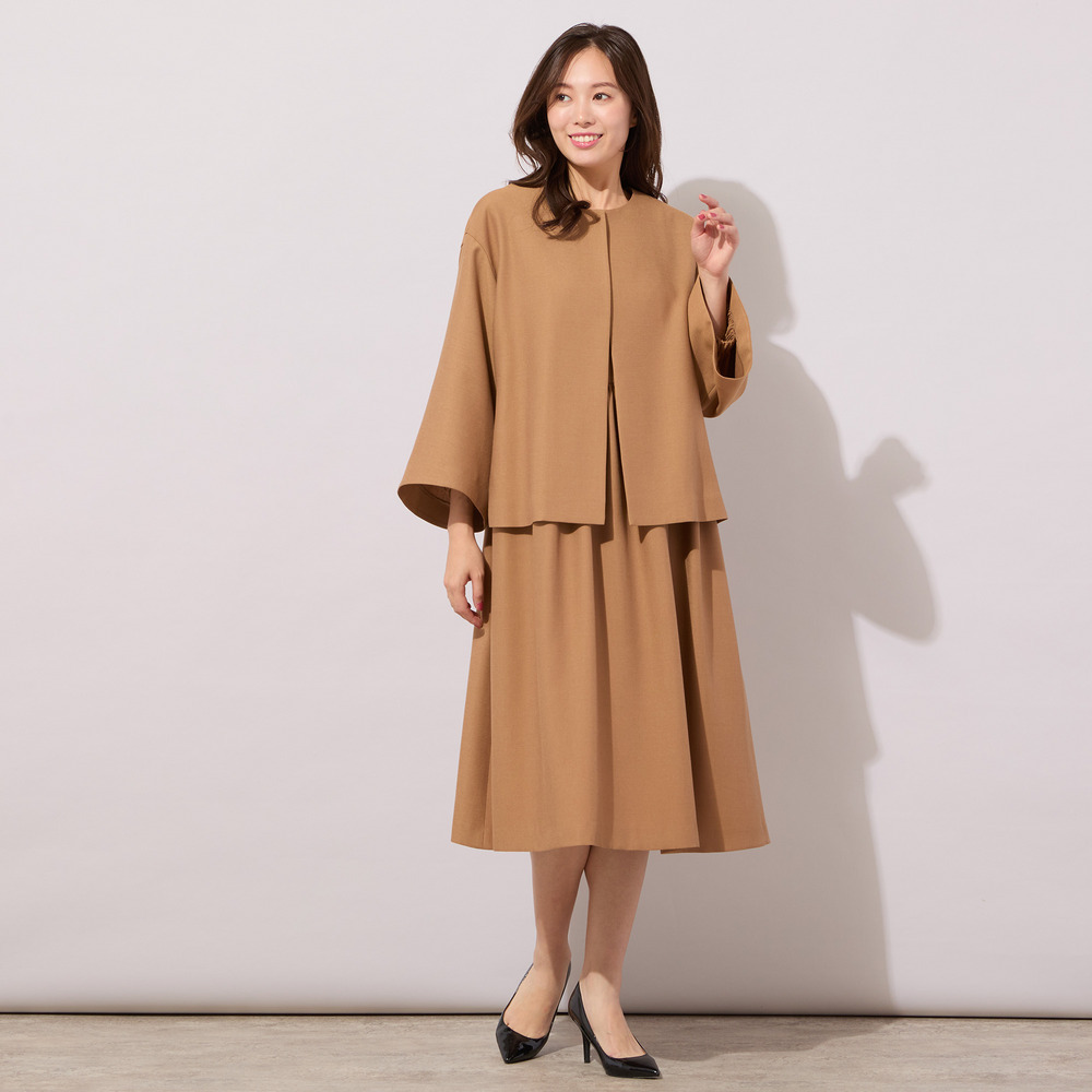オフ、ベージュ、ブラックのベーシックなカラー展開で、ベージュ、ブラックは同素材のドレスの展開もあります。