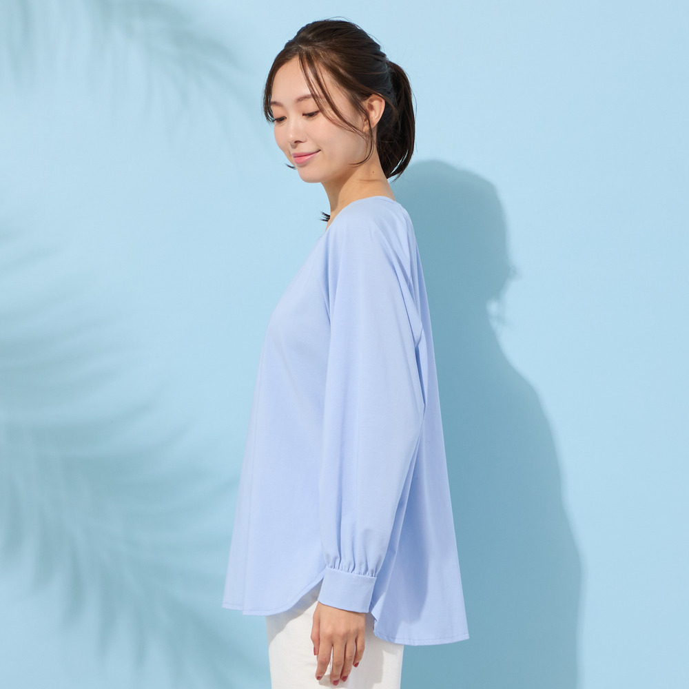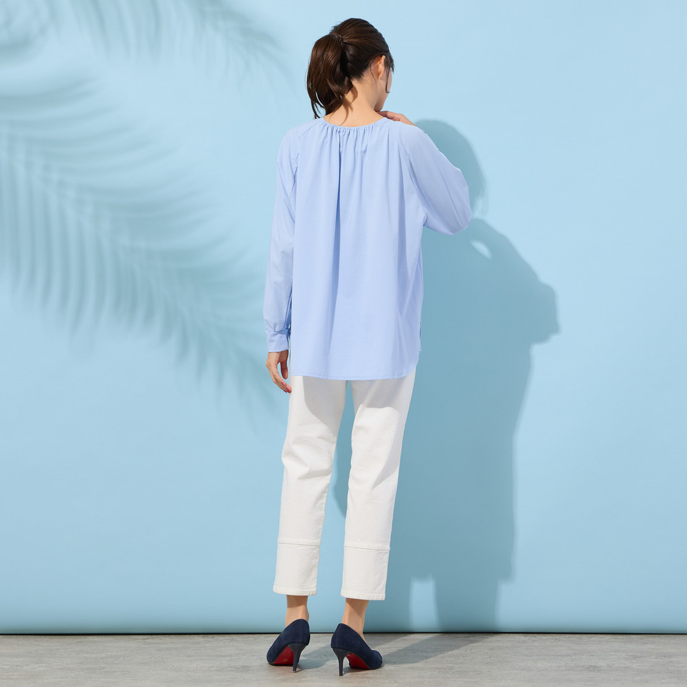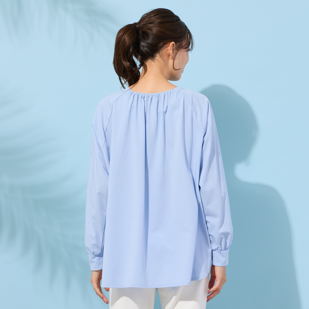 後ろ襟ぐりにゴムでギャザーを寄せてあり、襟ぐりがキュッとコンパクトなのに着脱もスムーズで快適。