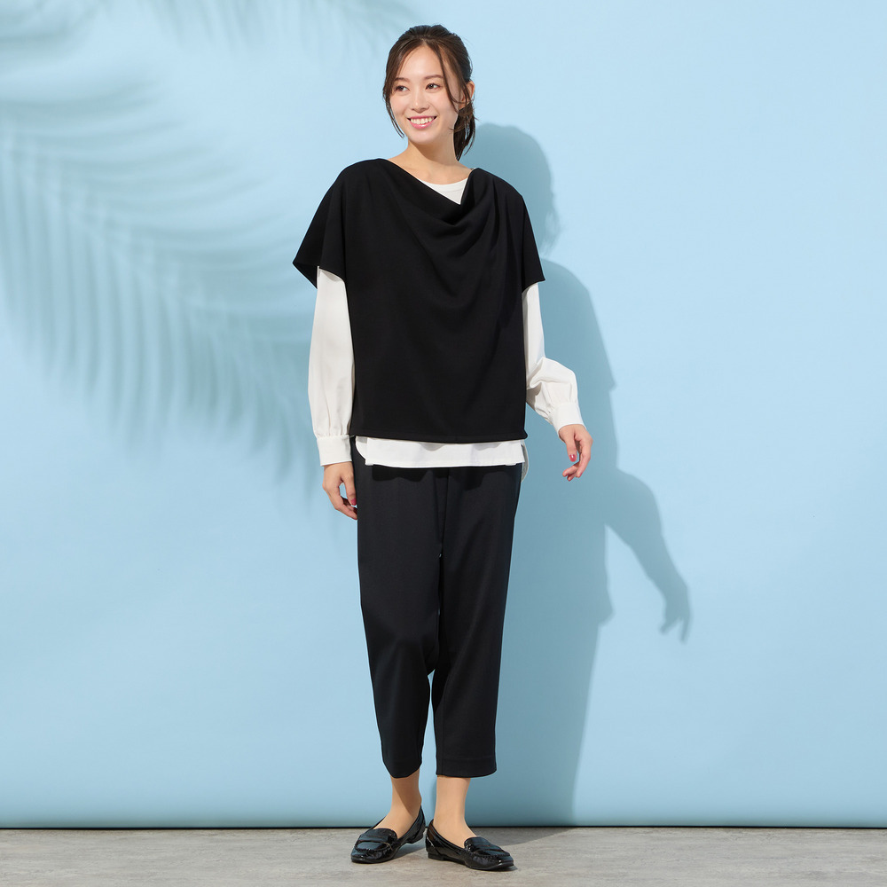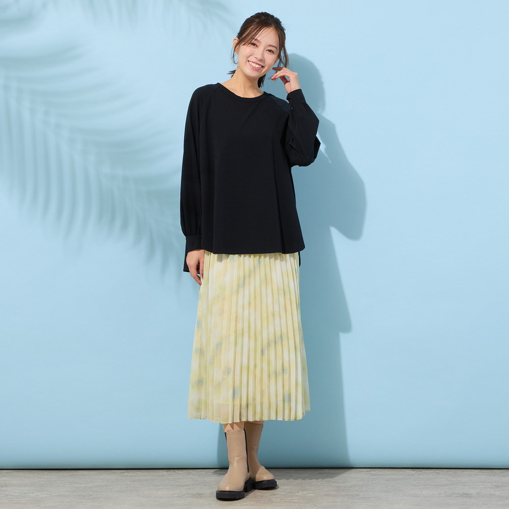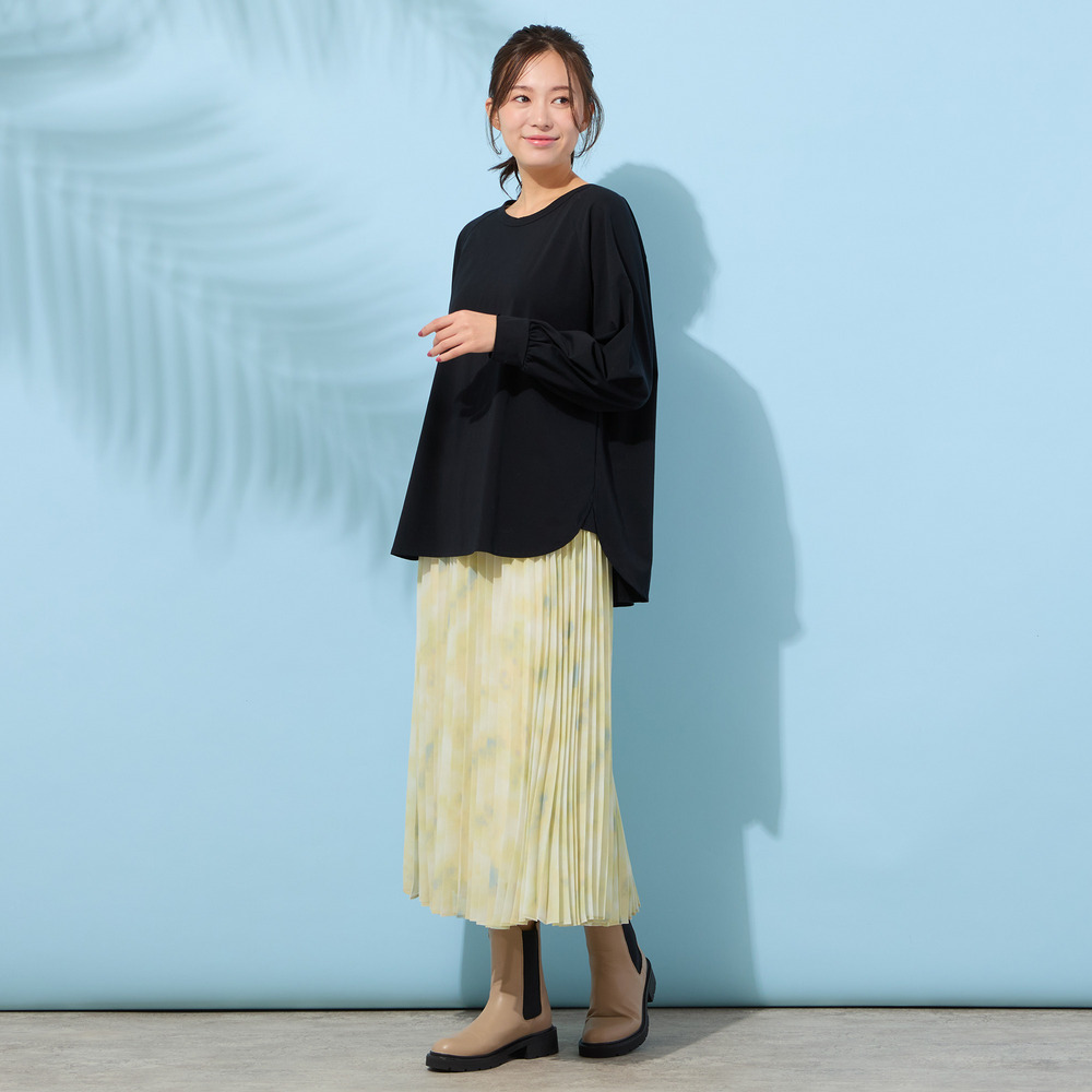 無地なので何にでも合わせやすく、スカート、パンツどちらとも相性の良い丈感がうれしいですね。