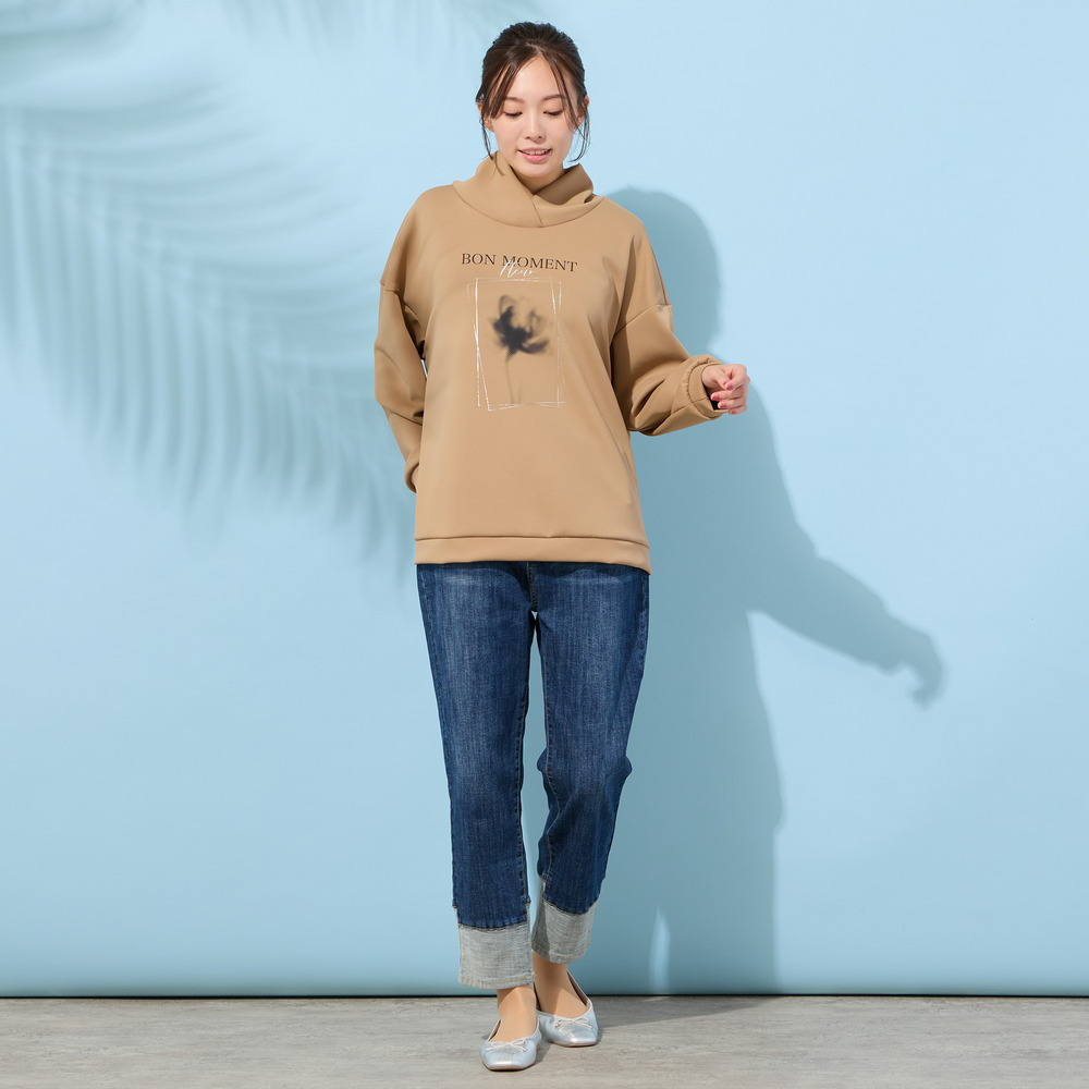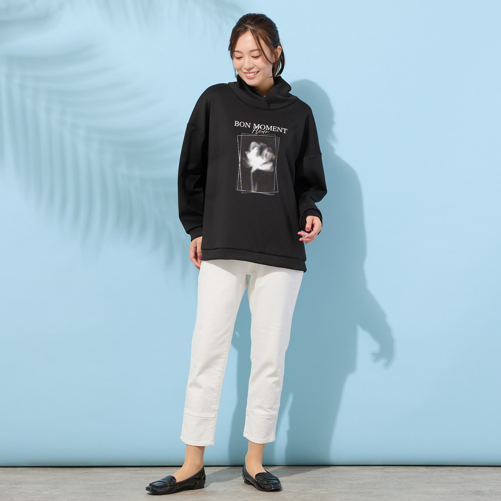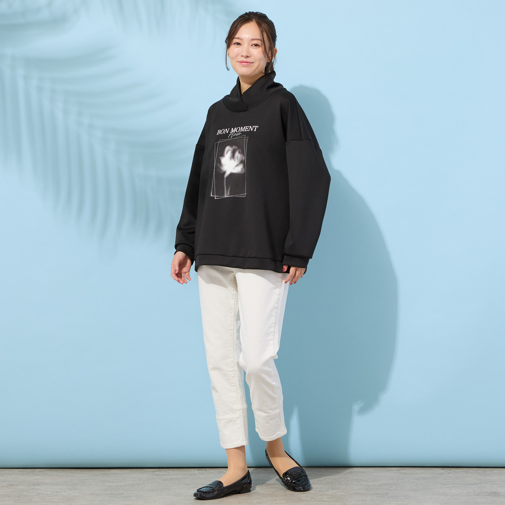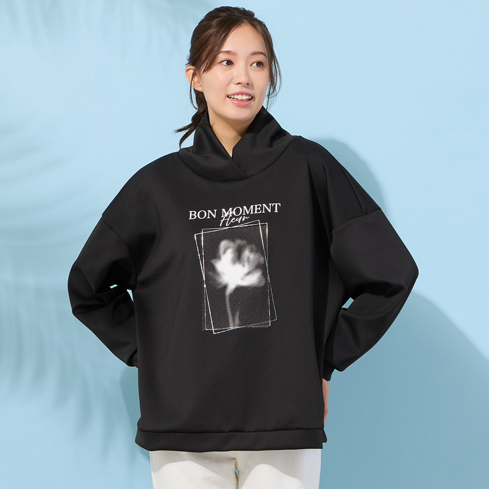 ■胸元のフラワープリントがポイントのハイネックトップ■