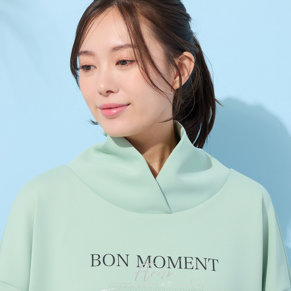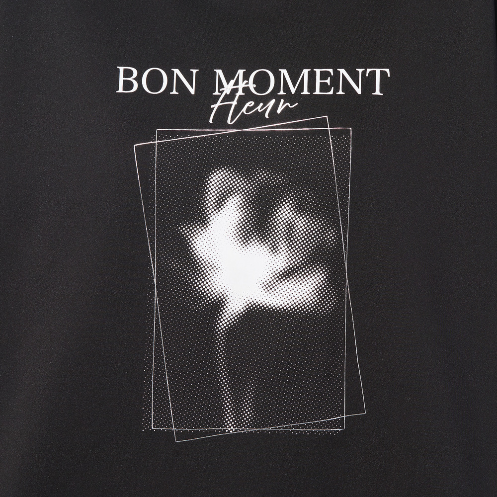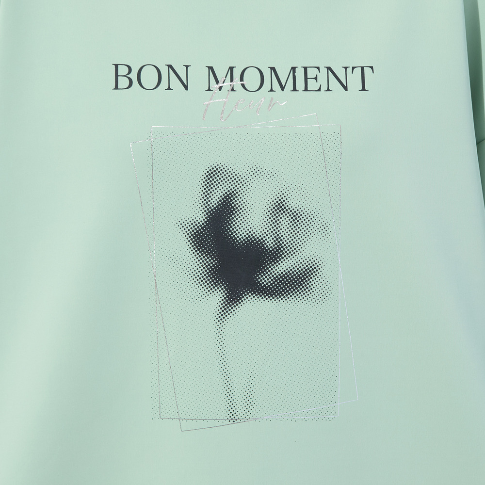 フランス語で『楽しい時間』という意味の『BON MOMENT』の文字と、ぼんやりとしたシルエットで描かれた、一輪のフラワープリントが印象的。