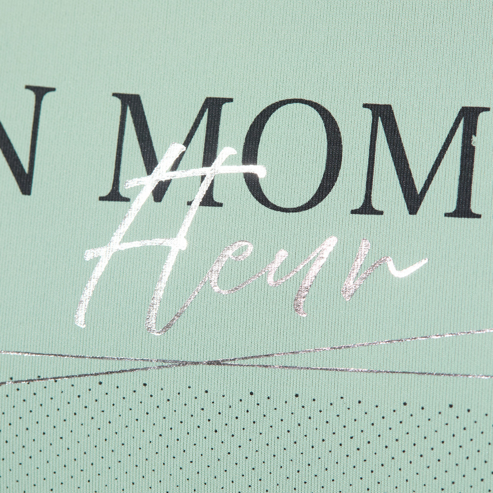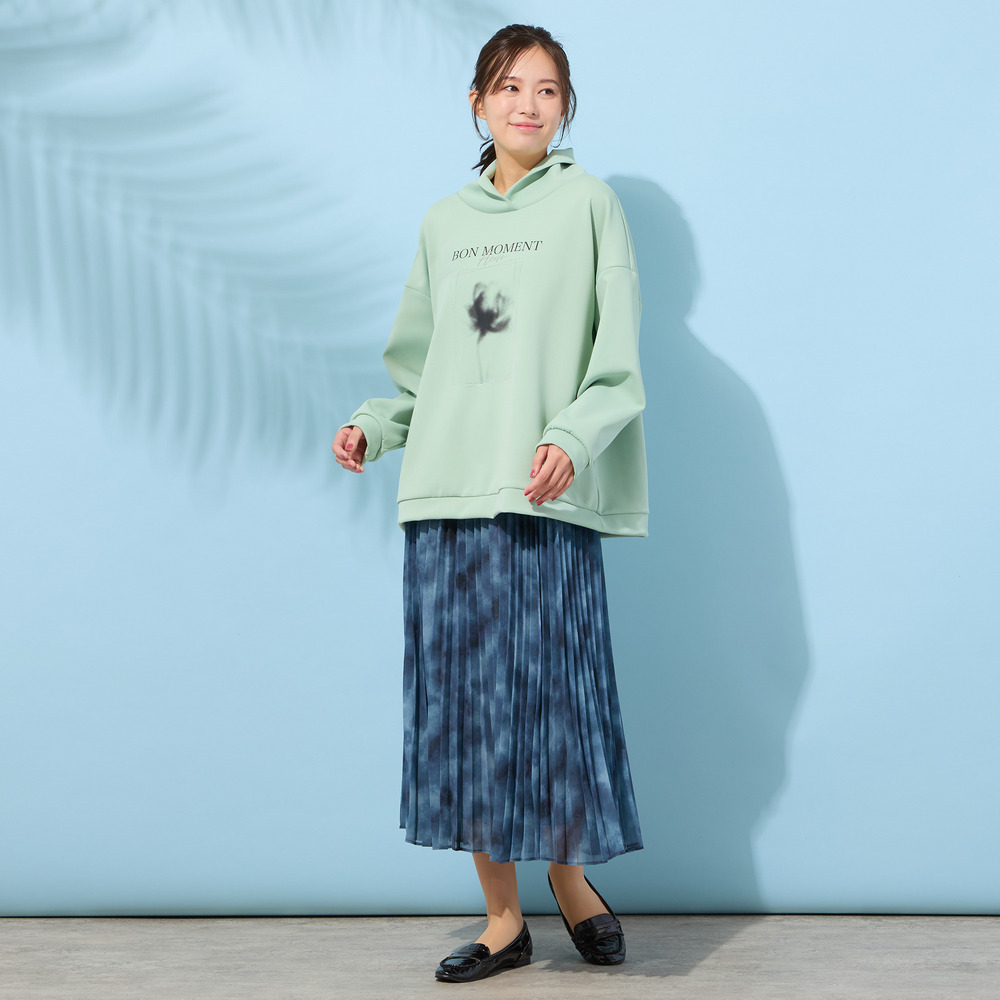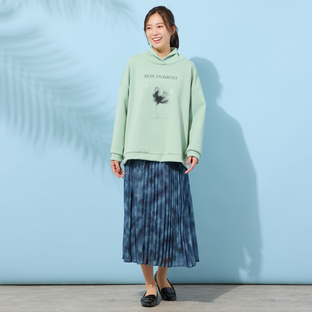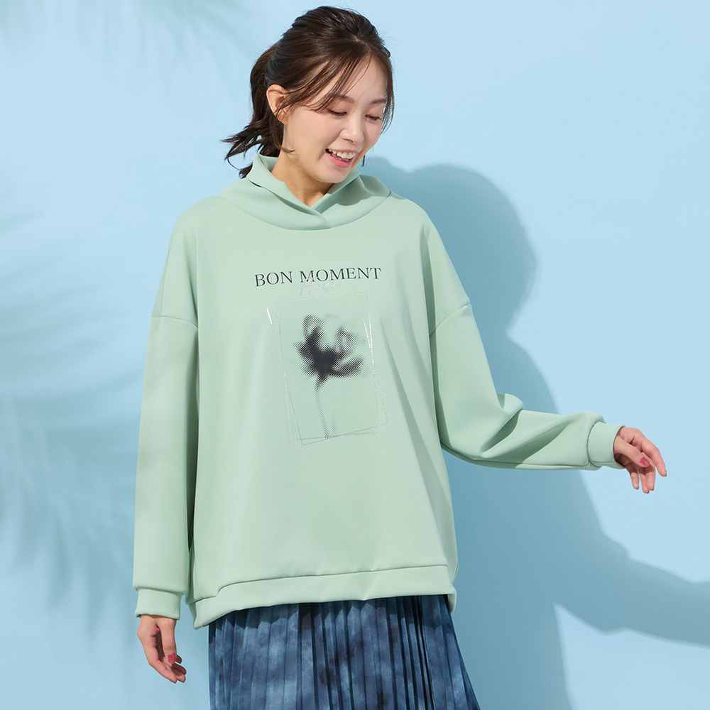 フランス語で『楽しい時間』という意味の『BON MOMENT』の文字と、ぼんやりとしたシルエットで描かれた、一輪のフラワープリントが印象的。