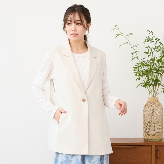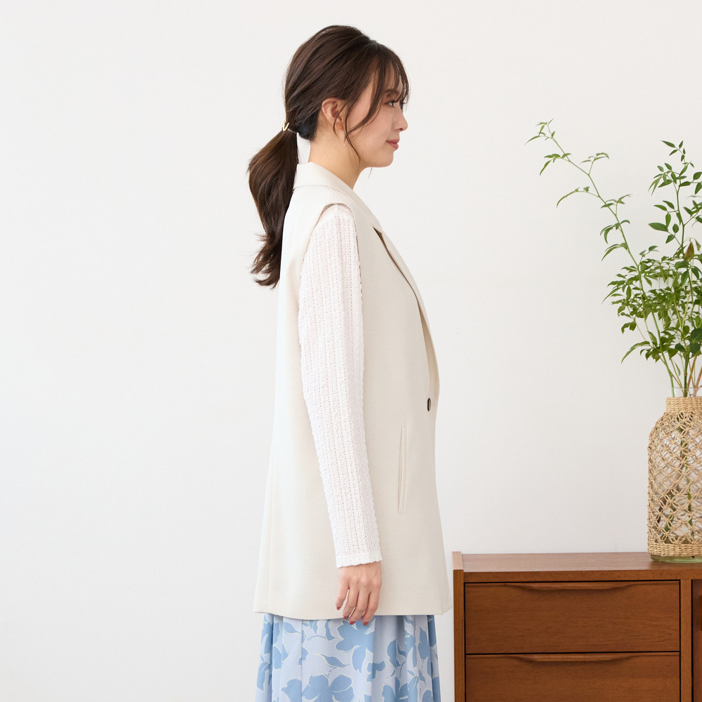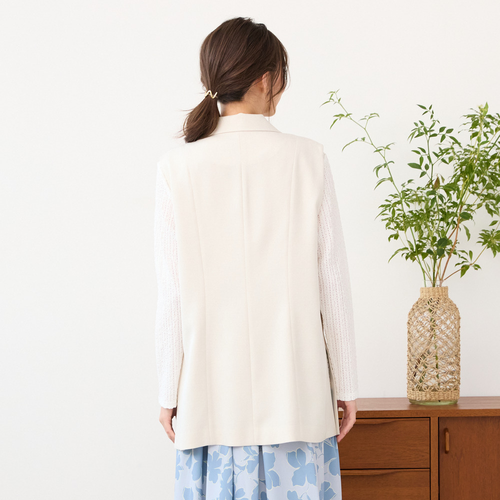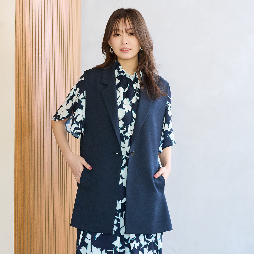 麻っぽいのにシワになりにくく、紫外線防止機能付きの素材を使用したジレ。