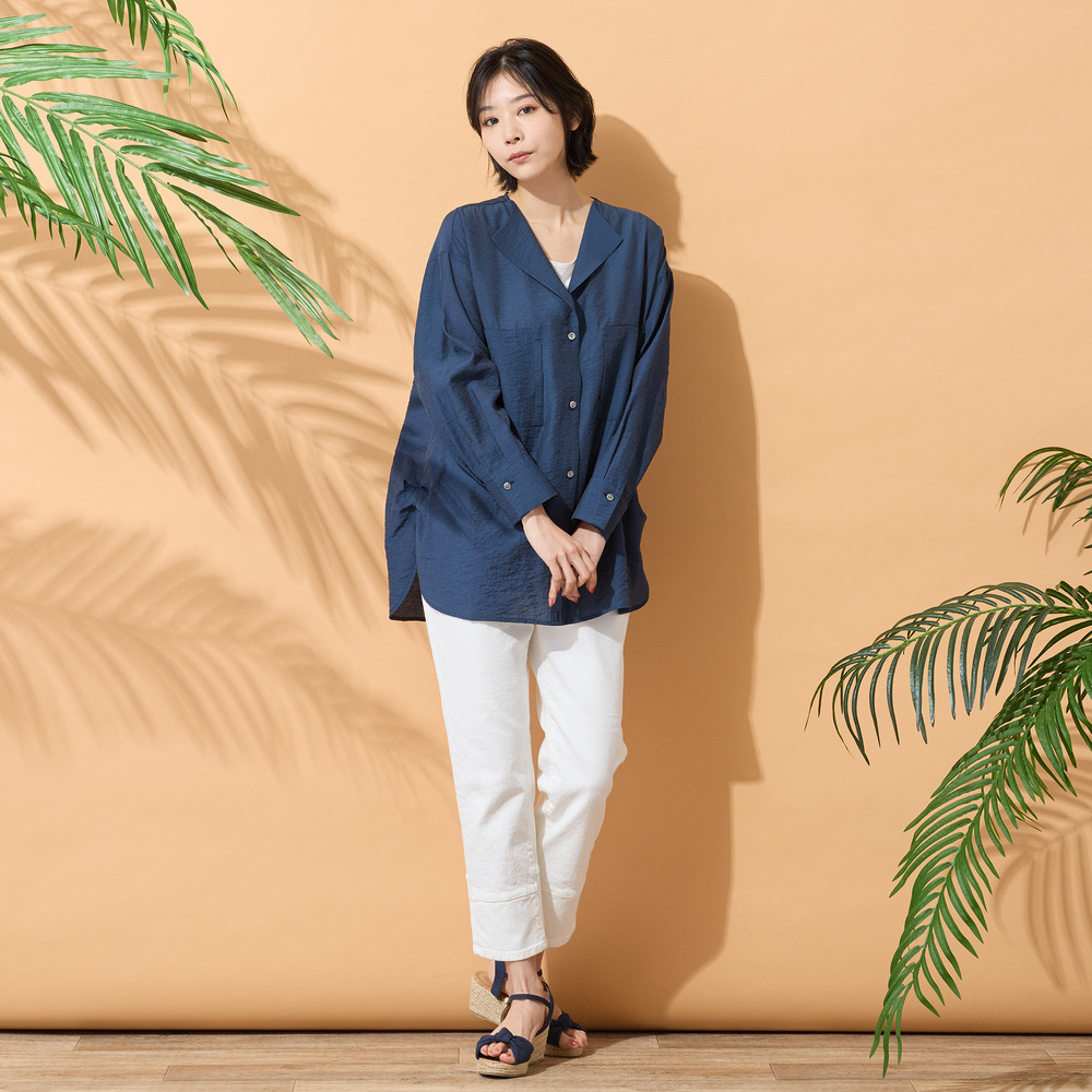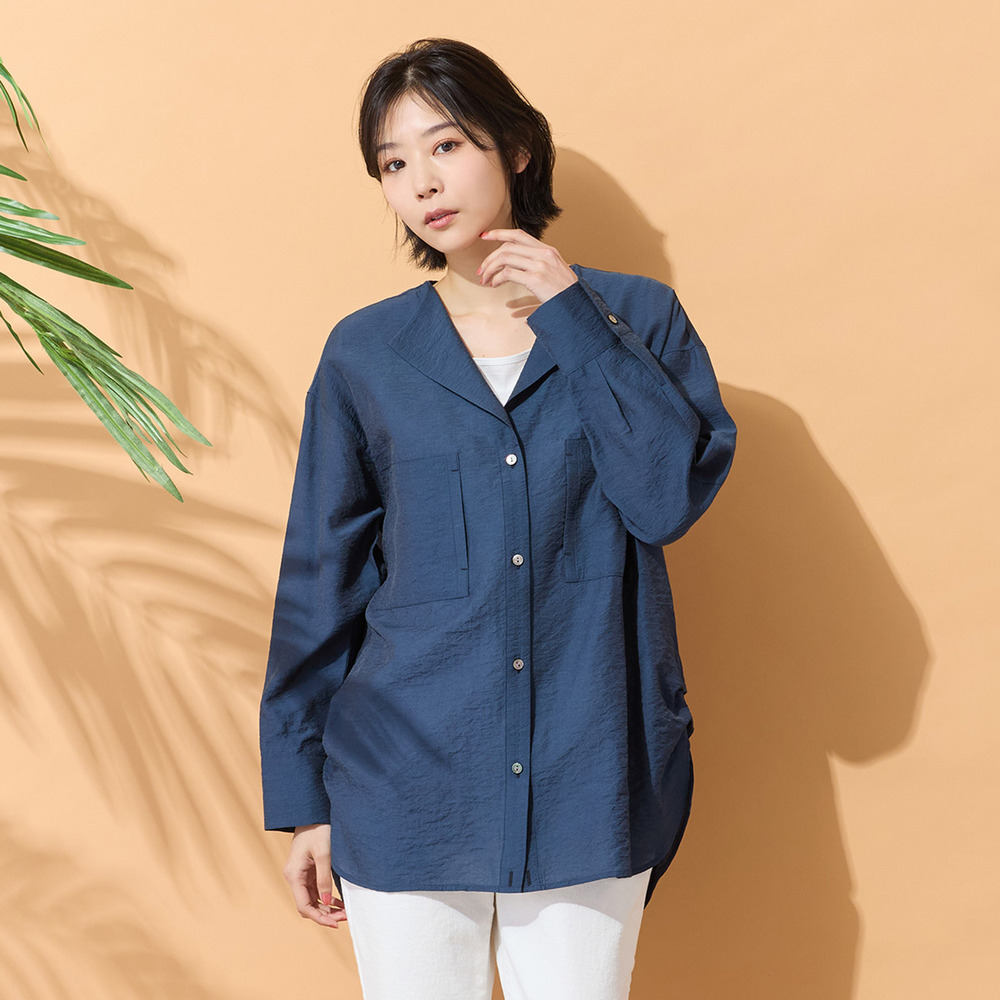 抜け感のあるウイングカラー風の、折り返しラペル・ノーカラーデザインでデコルテすっきリ見え。