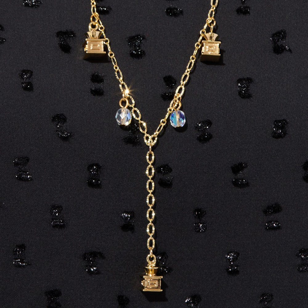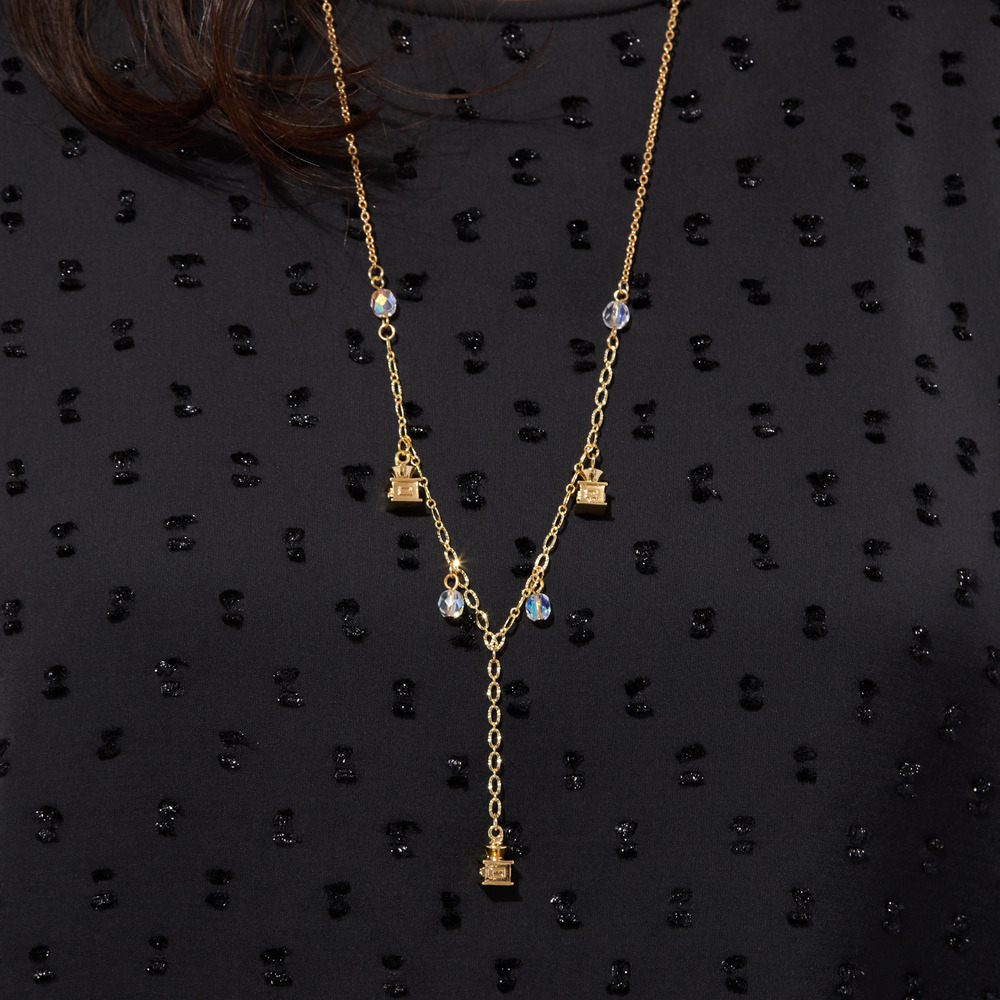 2種類のチェーンを使用し、四角い箱上のパーツとビジューを配置したネックレス。