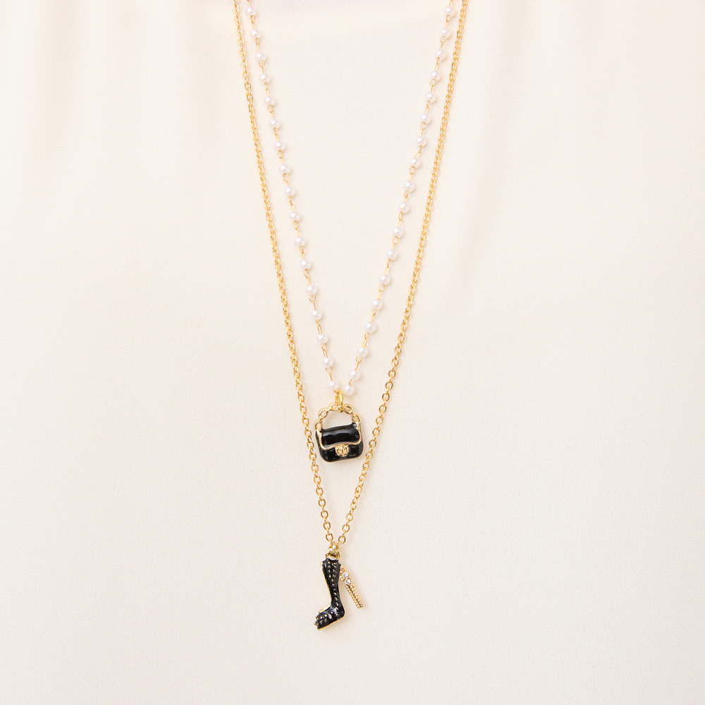 2種類のチェーンを使用し、それぞれパンプスとバッグのモチーフを付けたネックレス。
