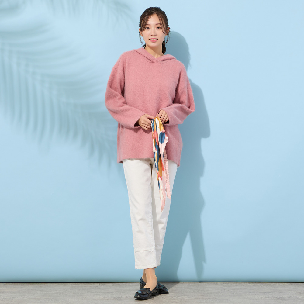 ピンクベースのマルチカラーで、1点投入するだけで、一気に華やかに仕上がるストールです。