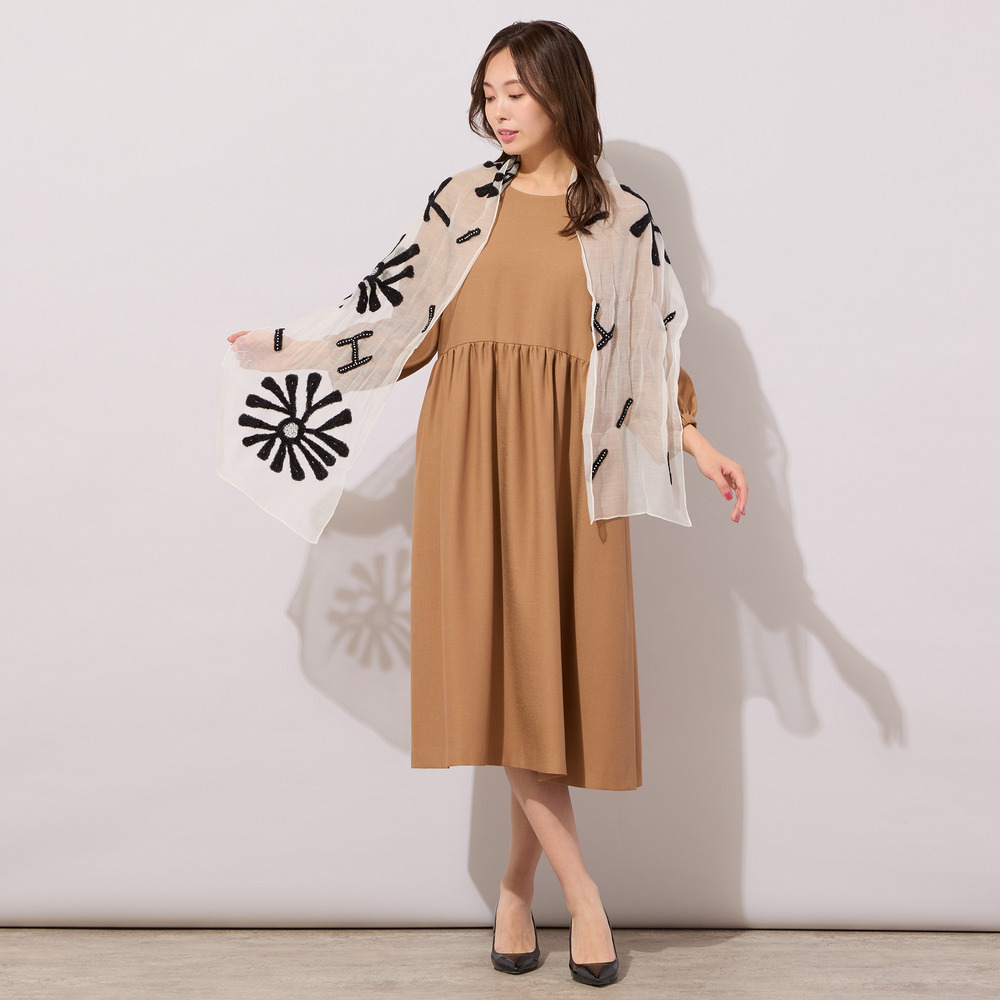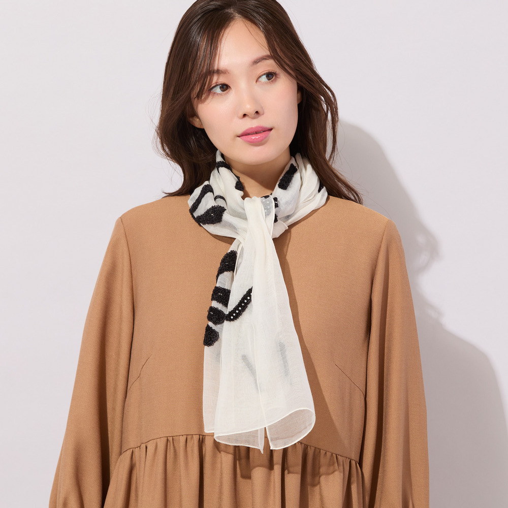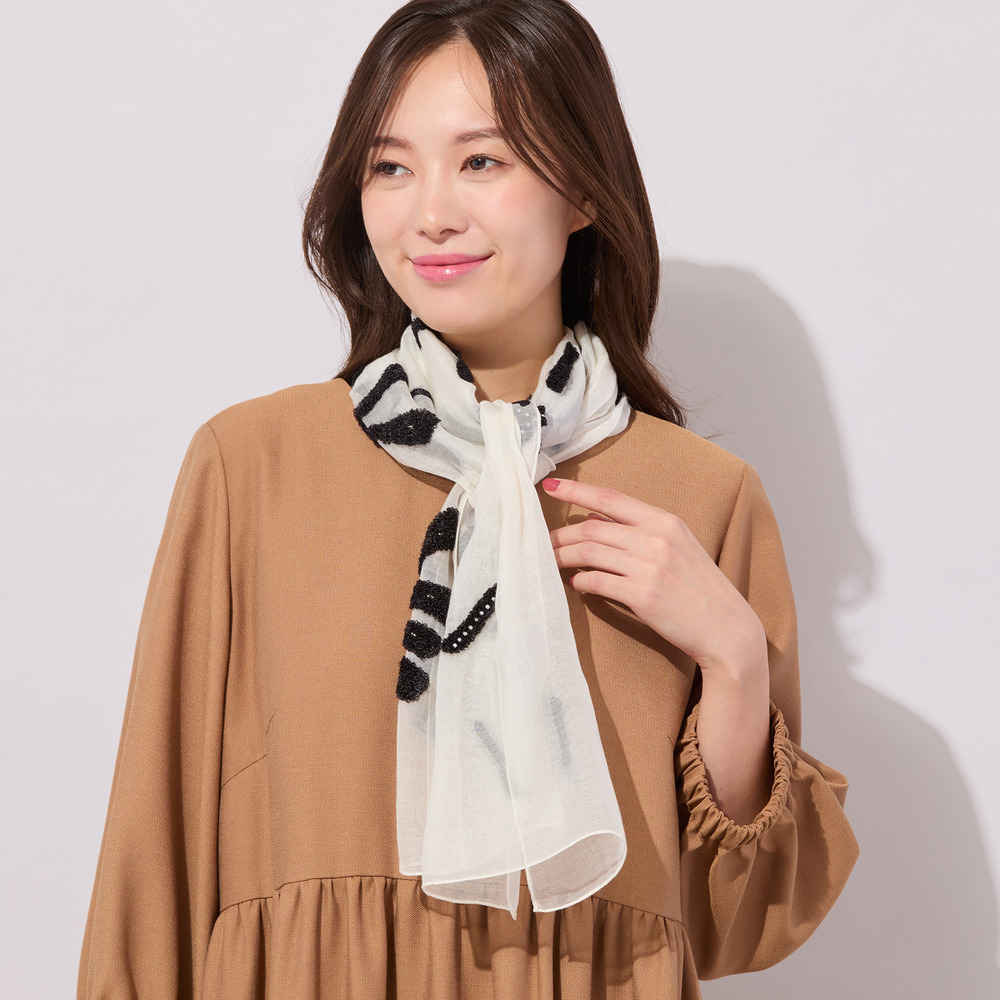 どちらも、1点投入するだけで、一気に華やかに仕上がるストールです。