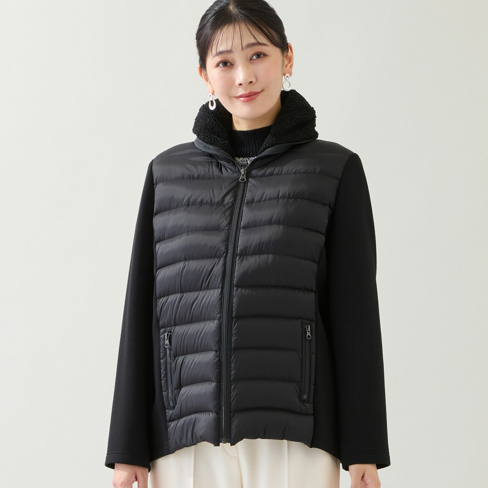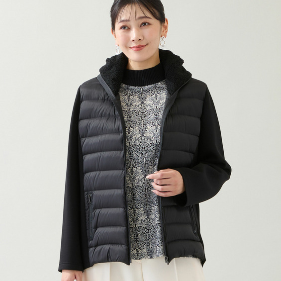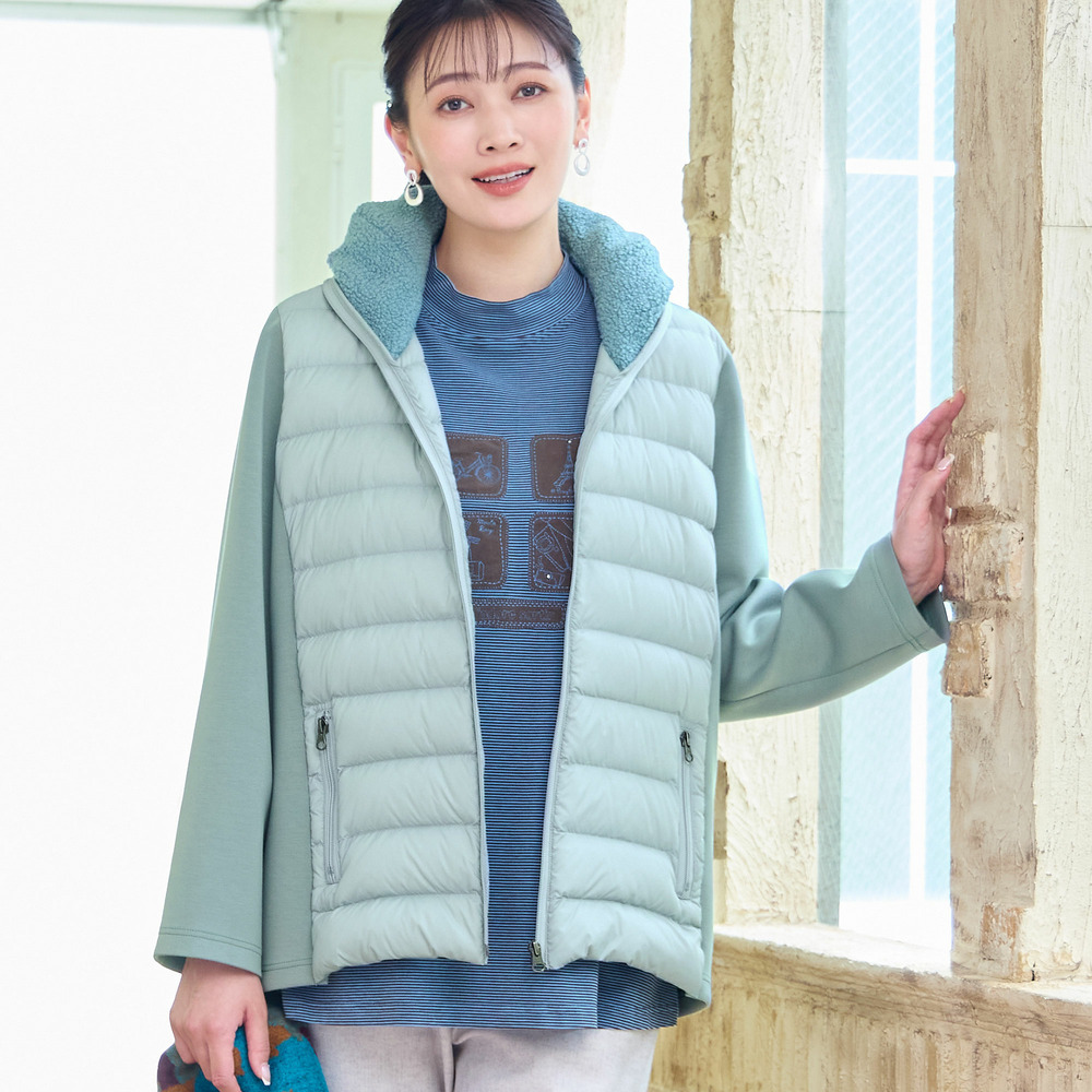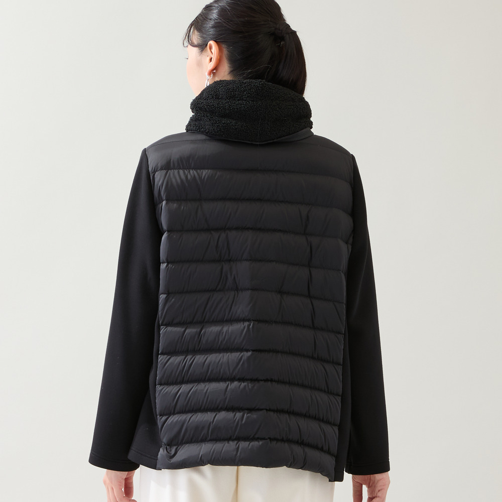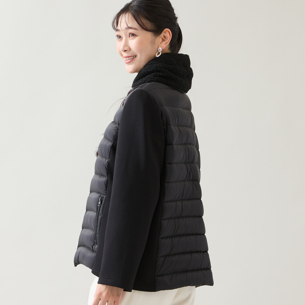身頃は薄手のタフタを使用したキルト、脇や袖は伸びのいいダンボールニット、そして襟にはボアを使用した3つの素材使いがお洒落なデザインアウター。