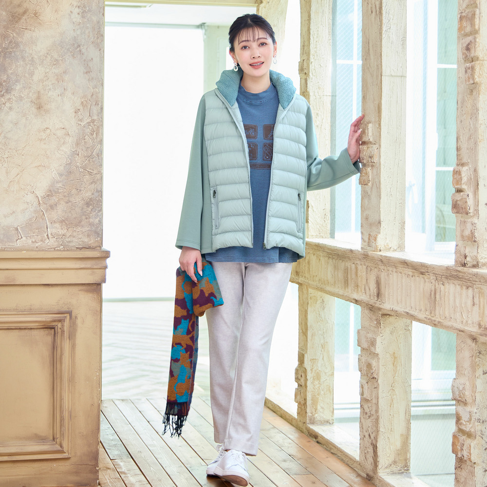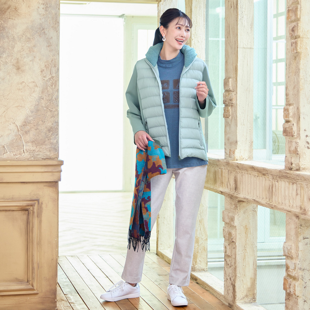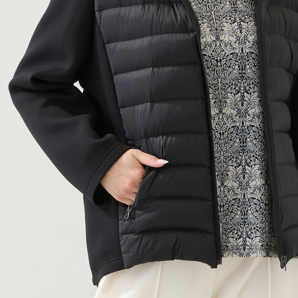 身頃のキルト部分はダウン入りで暖かく、脇や袖が伸縮するので動きやすさは◎。