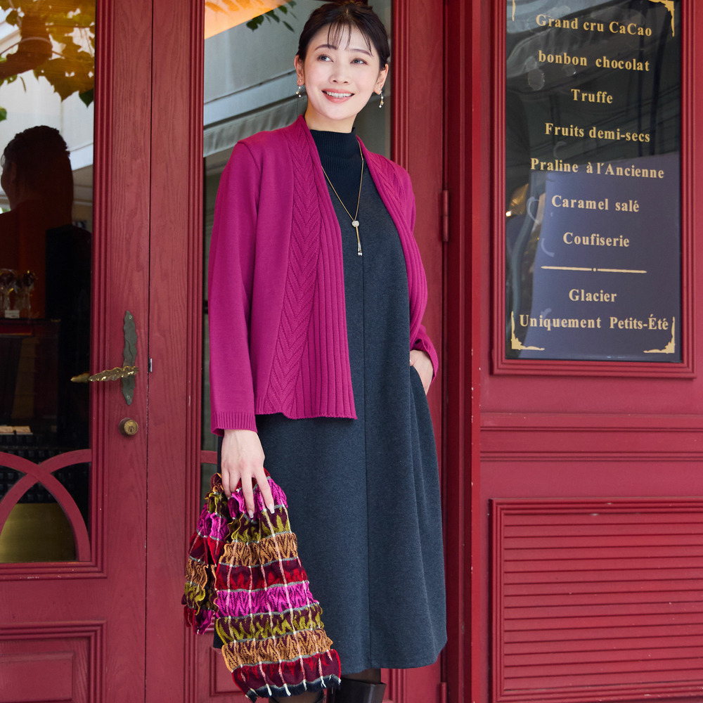 モデル着用のようにワンピースに羽織ったり、シャツとの重ね着をお楽しみいただけます。