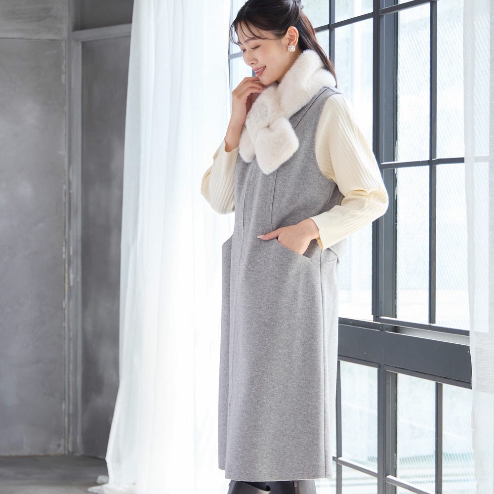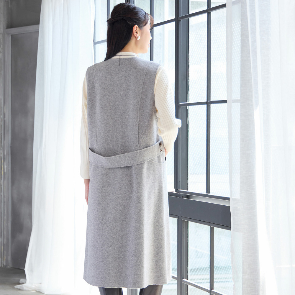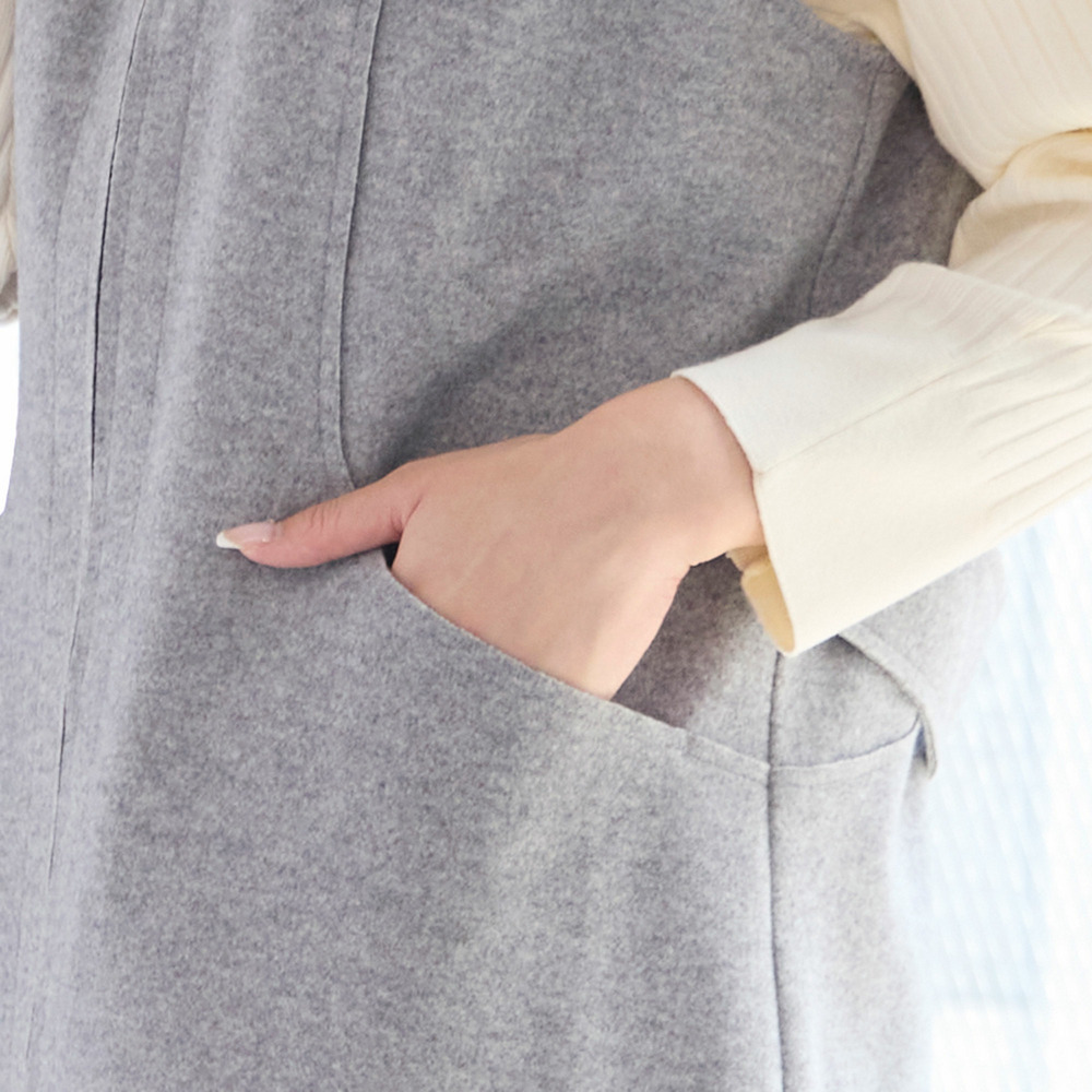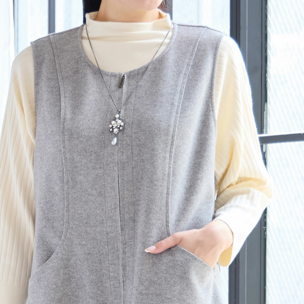 前はファスナーで全開できるので、ロングベストとしても着まわせる2WAYデザイン。
