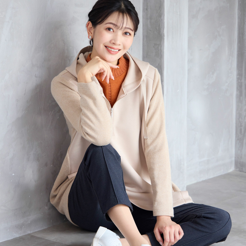 一枚で着てもリラックス感があり素敵ですが、モデル着用のようにハイネックインナーを合わせるとお洒落度がアップ!