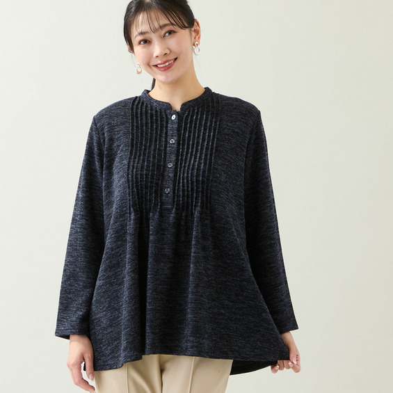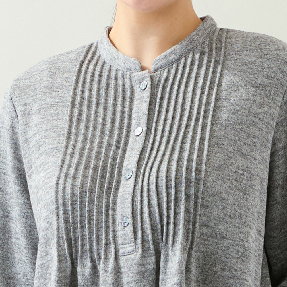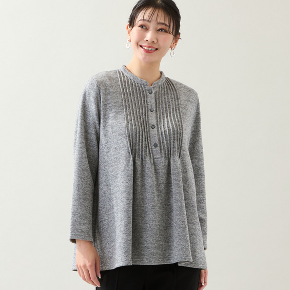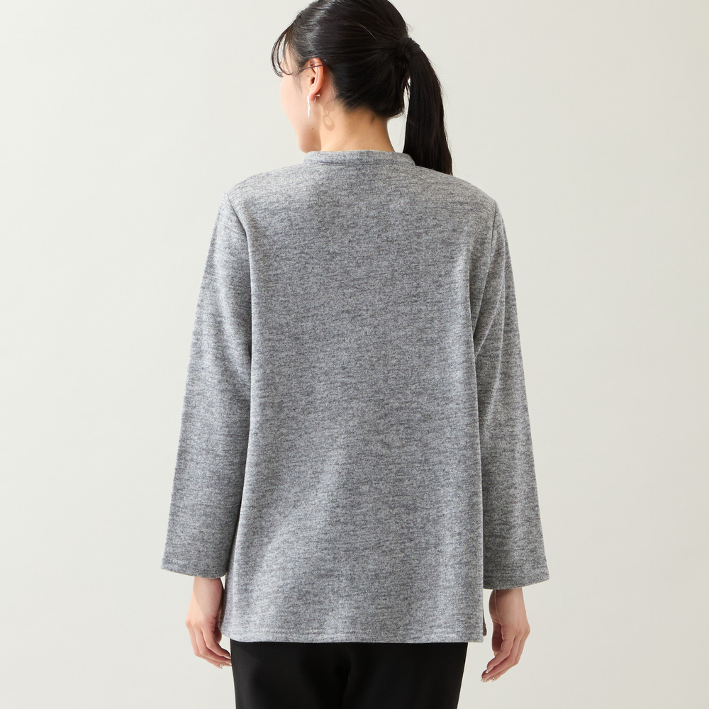 表はミックス感のある杢調の素材、裏面は起毛加工をした着ると暖かいカットソー。