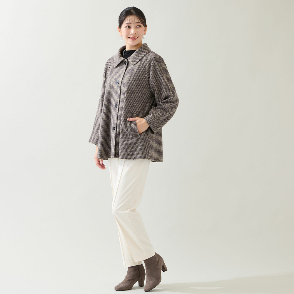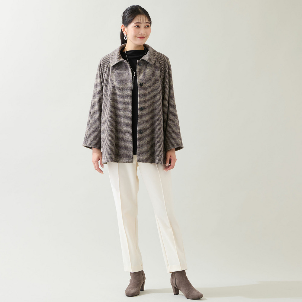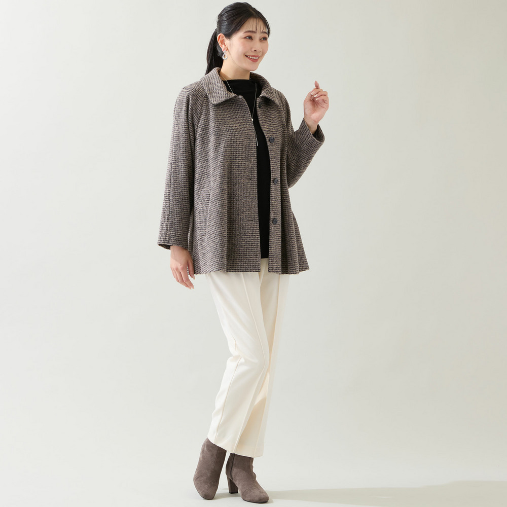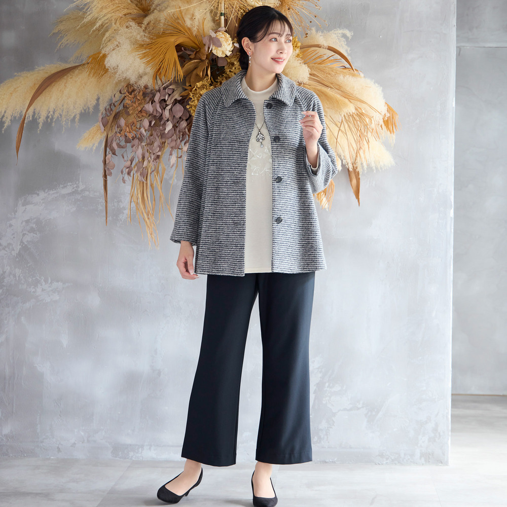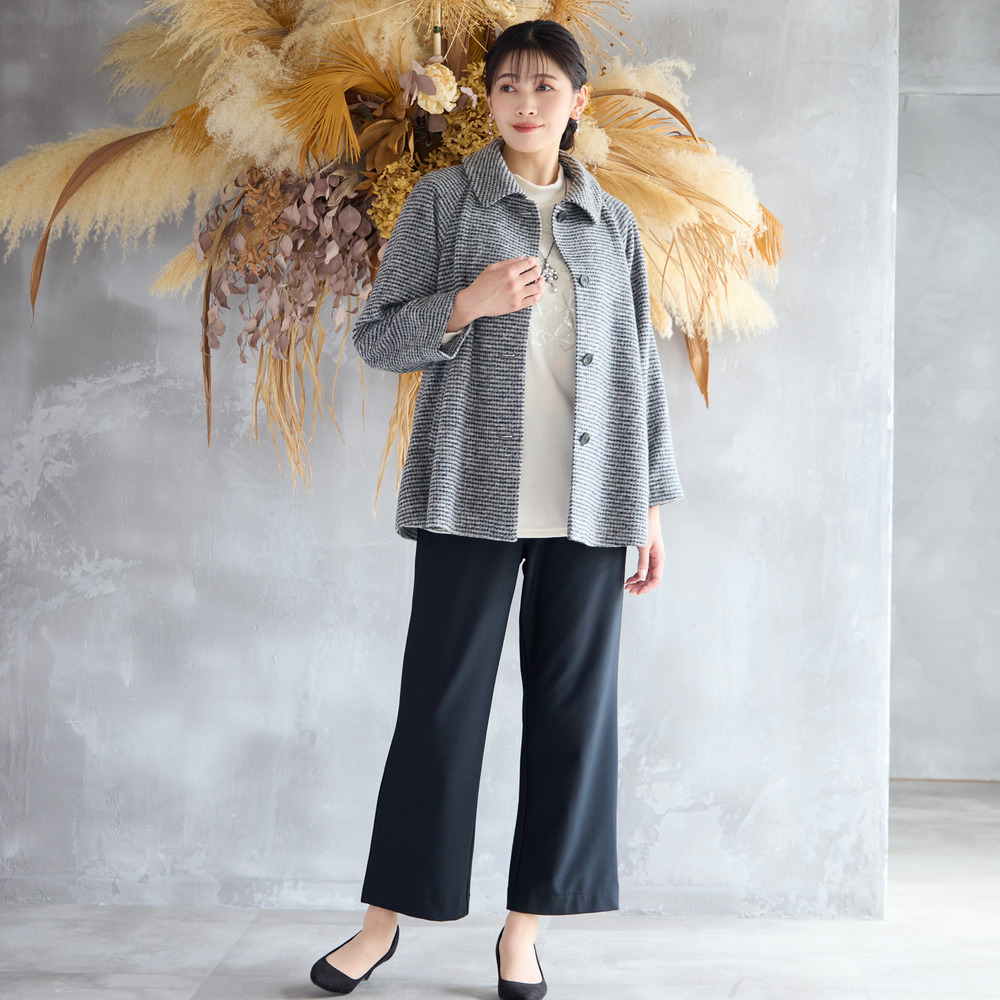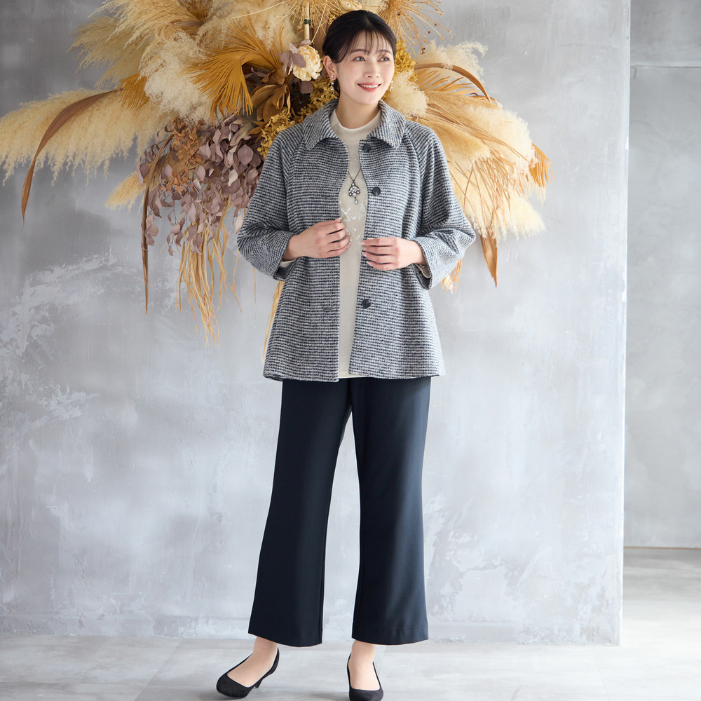 長すぎない着丈でパンツスタイルはもちろん、スカートやワンピースとのコーディネートもお楽しみいただけます。