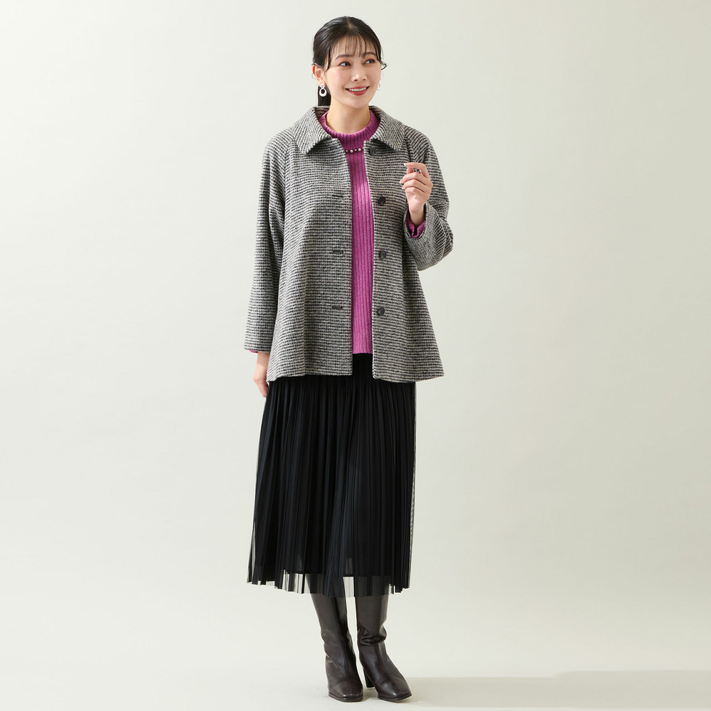 ボトムを選ばない着丈で着まわせ、ピンクはコーディネートの差し色にピッタリのカラーです。