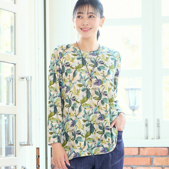 • 【洗える・日本製・L~3Lサイズ】テレコニットリーフ柄カットソー1