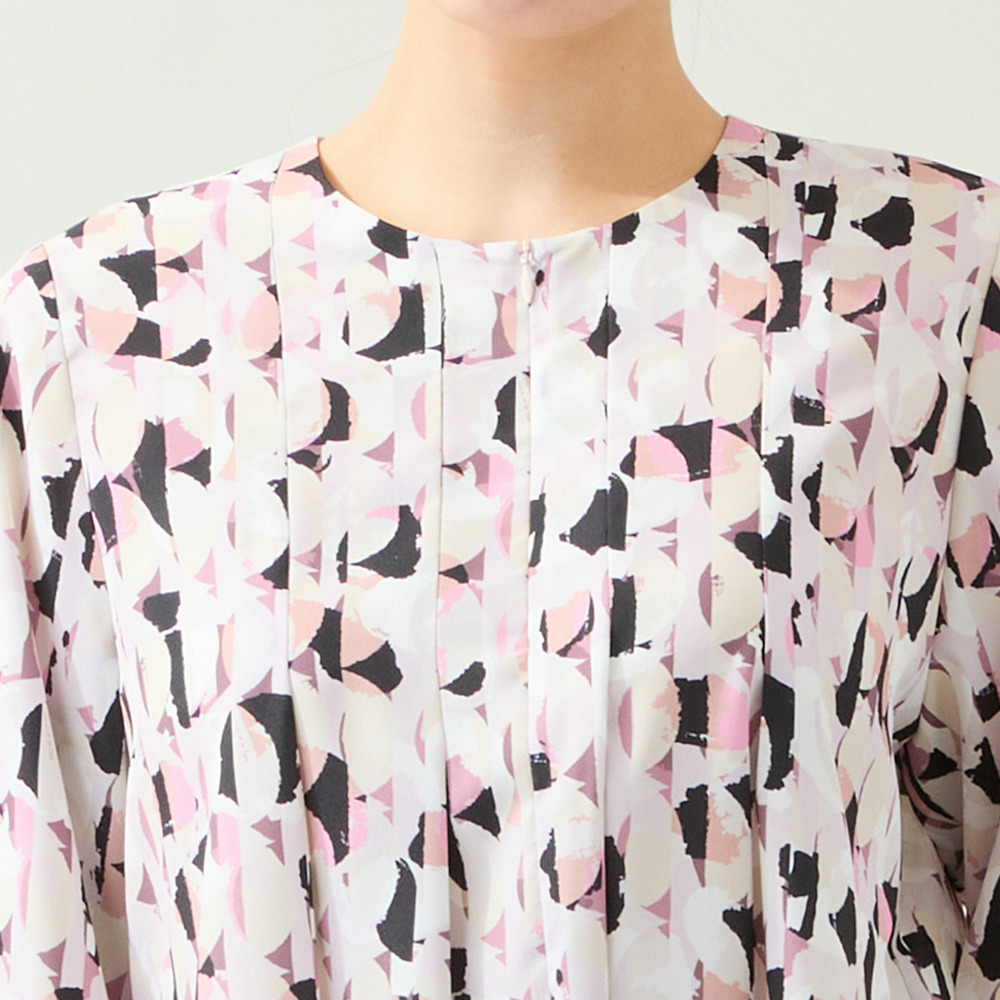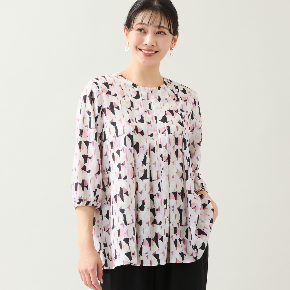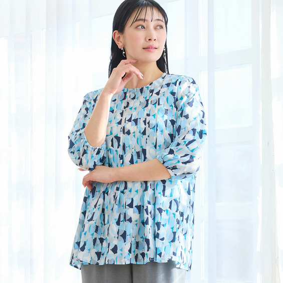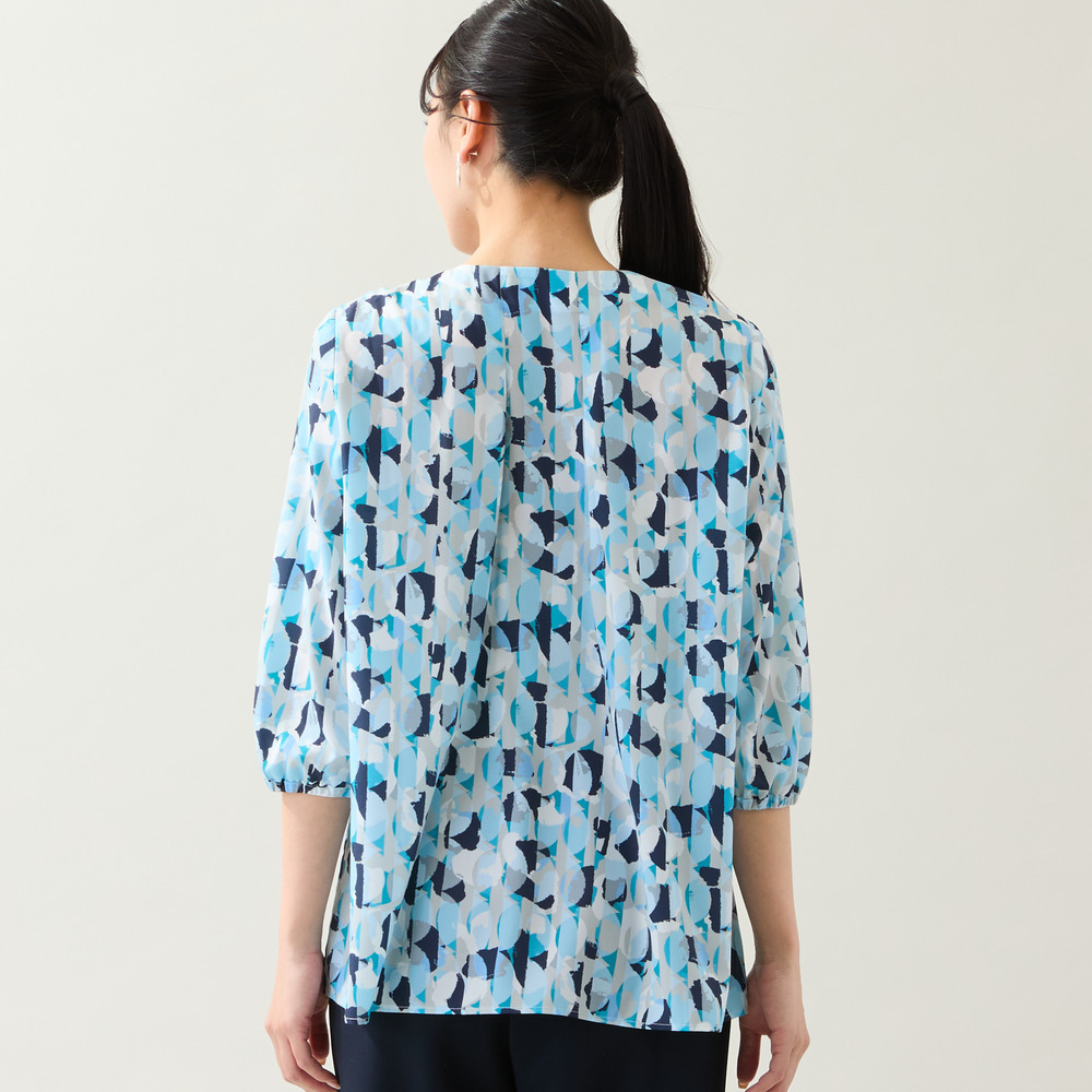 薄手でつるっとしたデシンに幾何柄をのせたブラウスです。