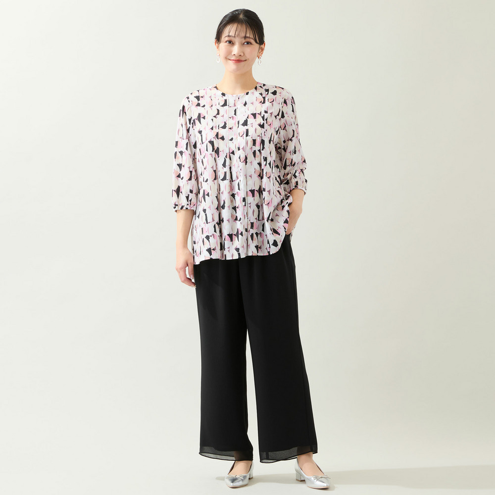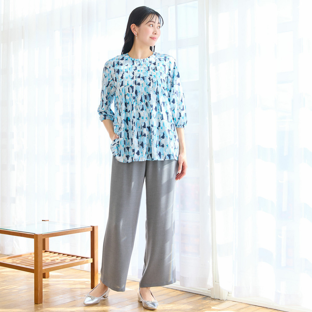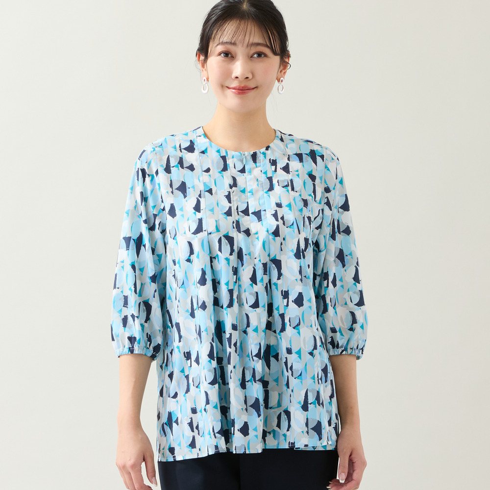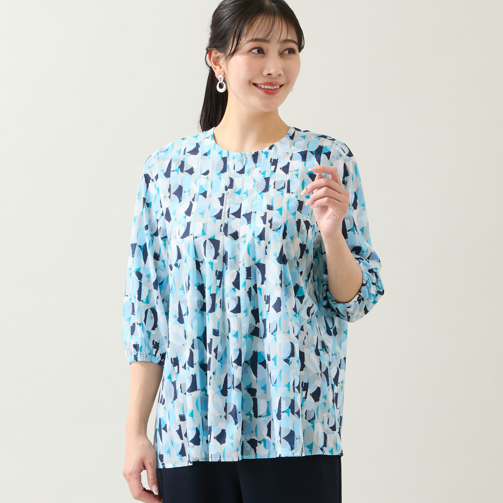 薄手でつるっとしたデシンに幾何柄をのせたブラウスです。