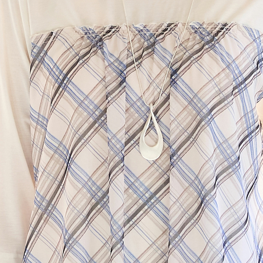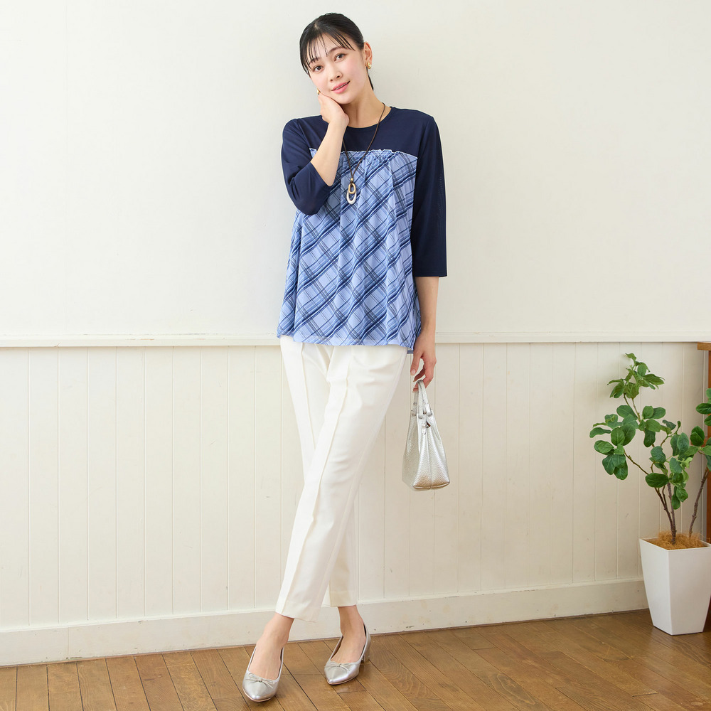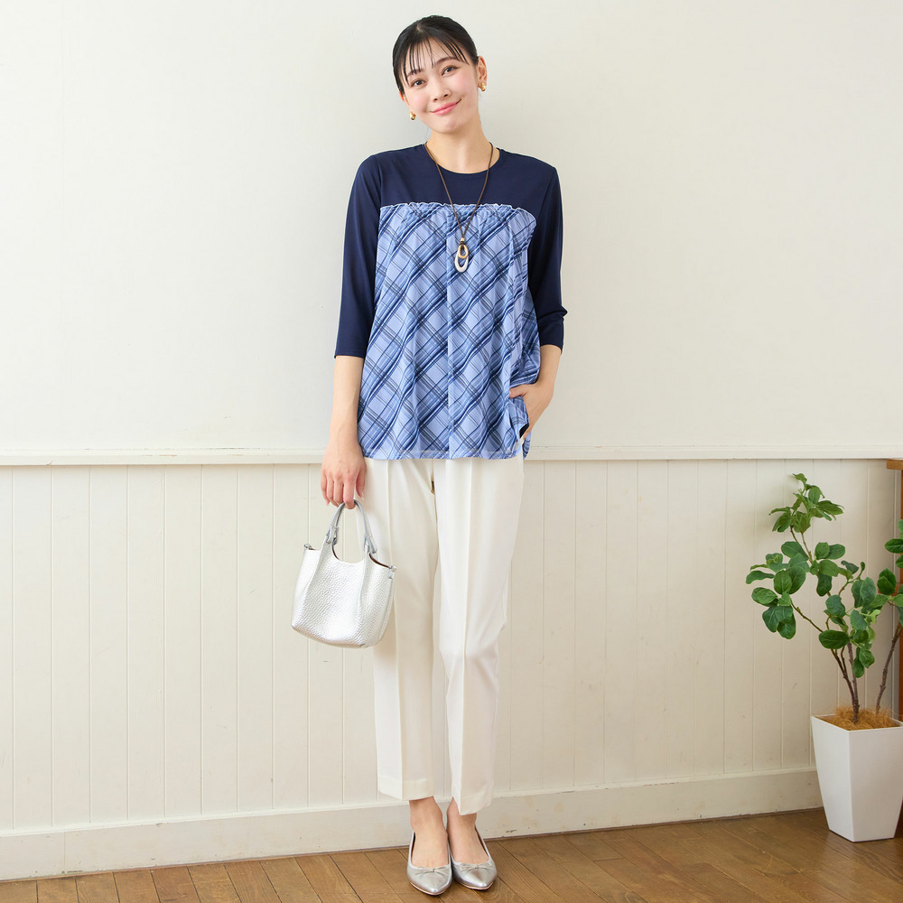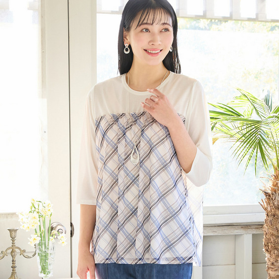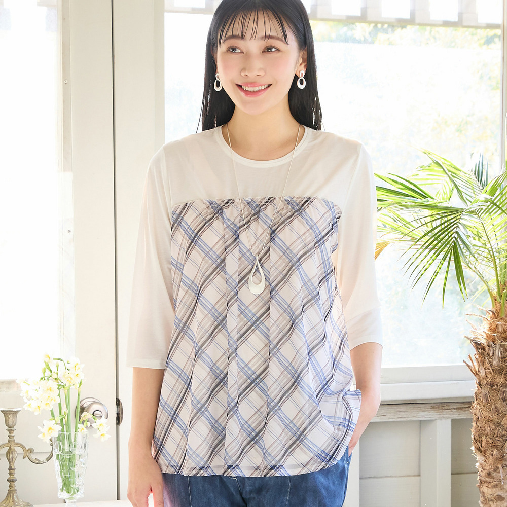 チェック柄のチュールが軽やかで、カジュアルな中にも甘さを添えてくれるデザイン。