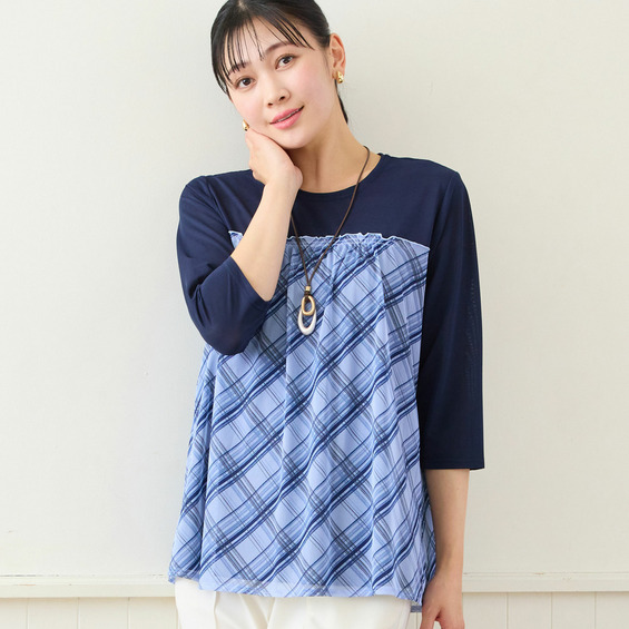 柔らかい風合いの天竺カットソーにチュールを重ねたトップスです。