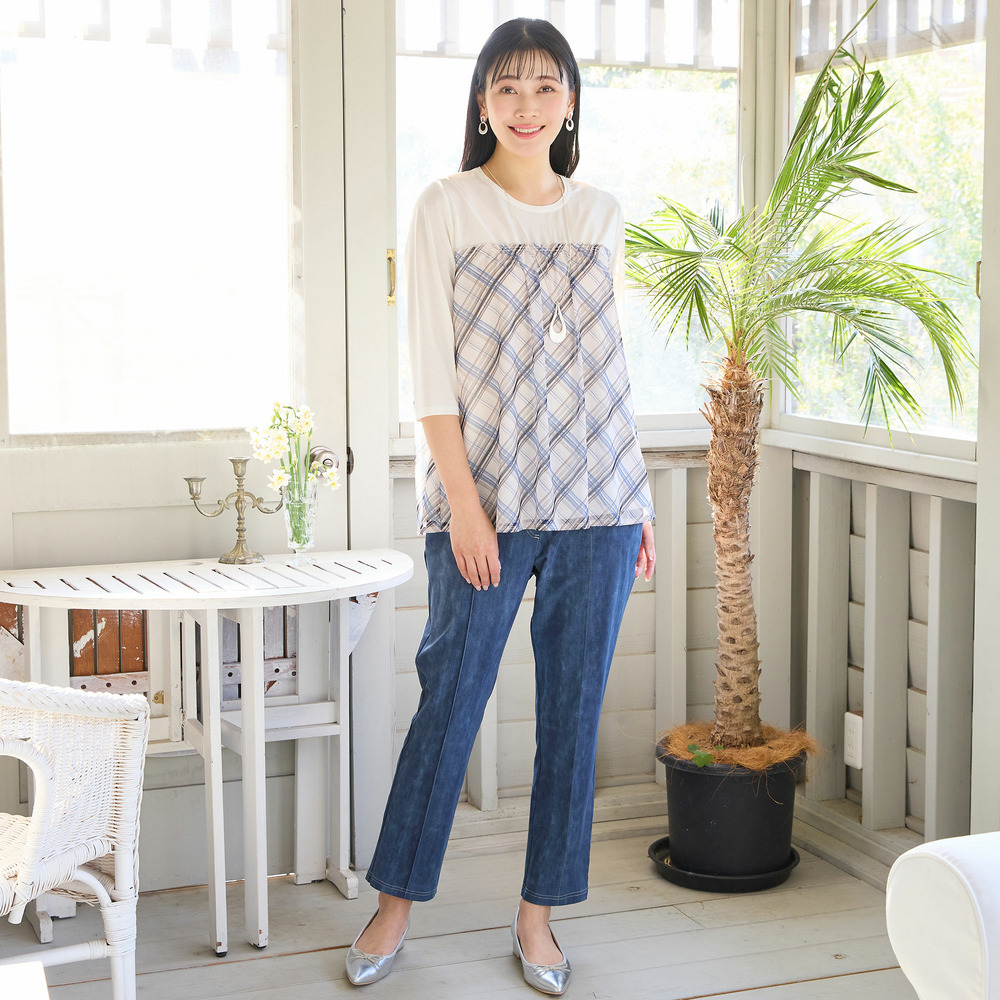 デニム柄のパンツとの甘カジュアルな着こなしがおすすめです。