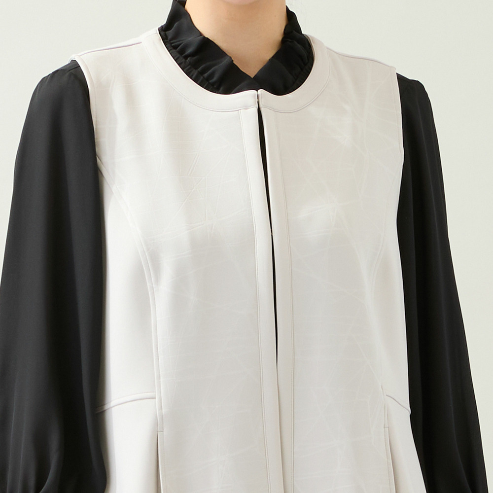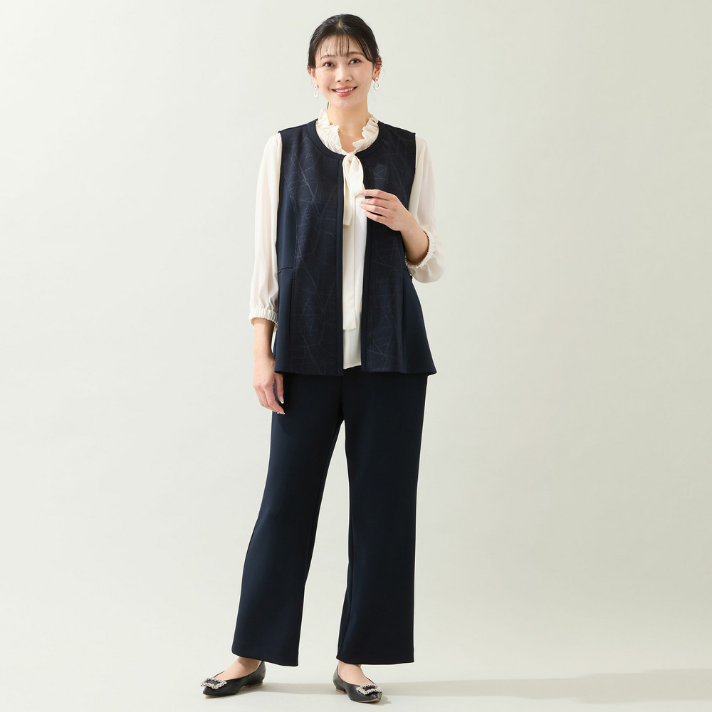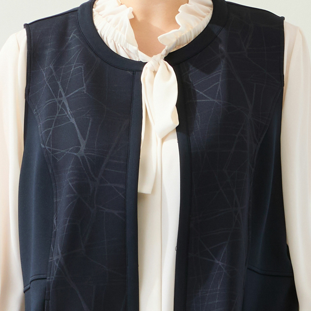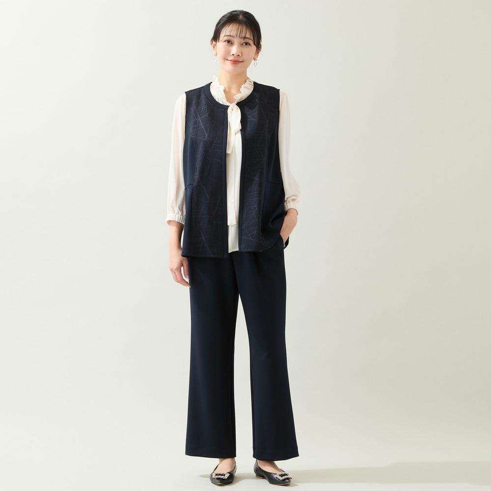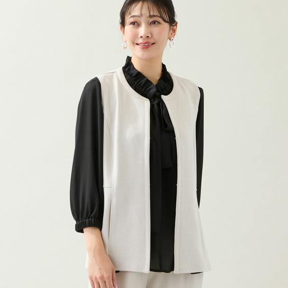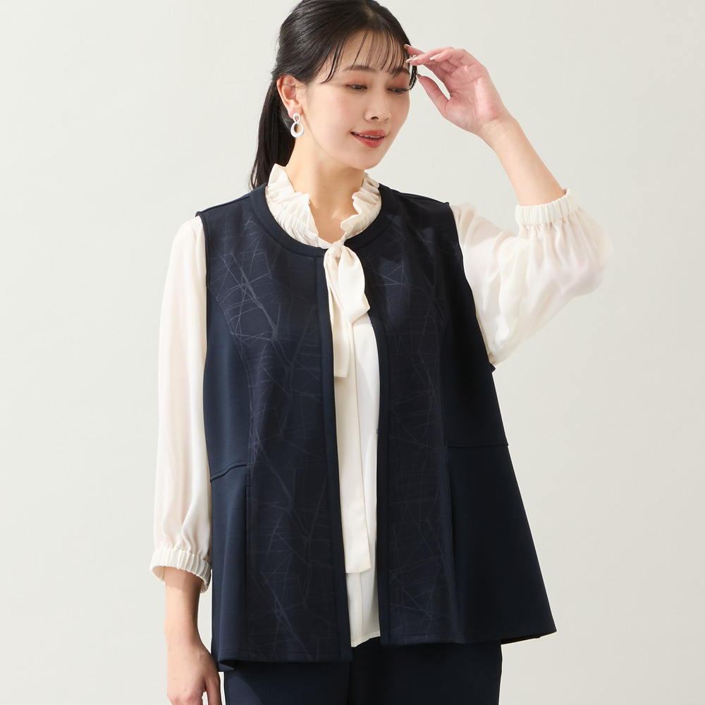 程よいきちんと感を楽しめるベストは、フロントにエンボス加工で柄を入れたデザイン。さり気ない柄がアクセントになっています。