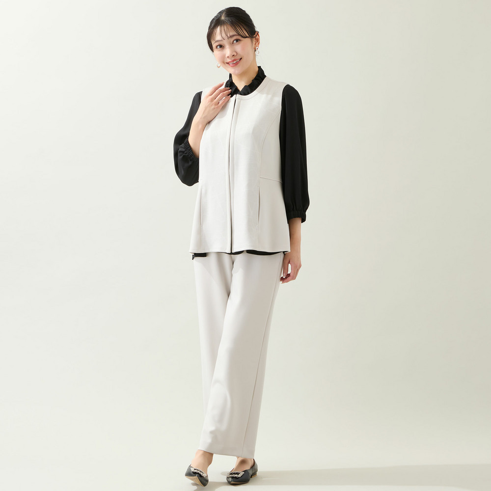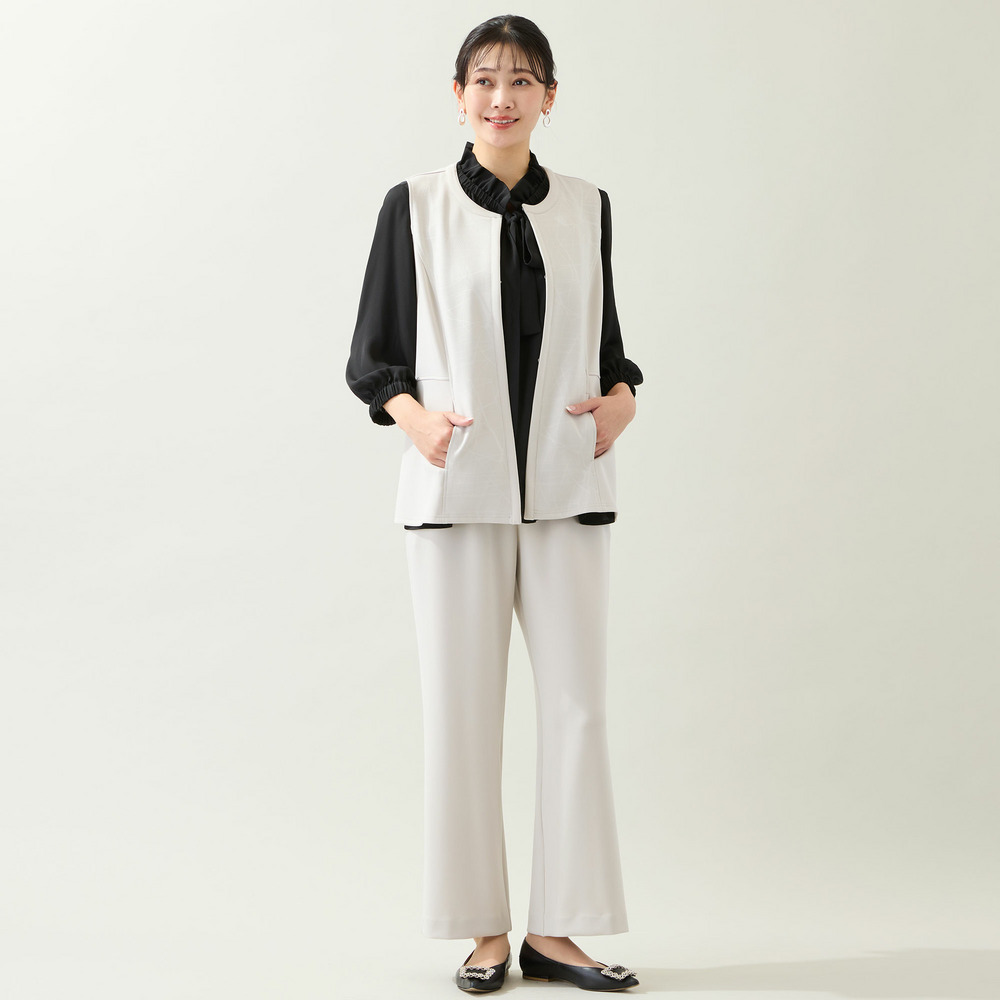 シリーズのパンツとのセットアップスタイルがおすすめです。ジャケットより軽さが出て、今どきのエレガンススタイルをお楽しみいただけます。