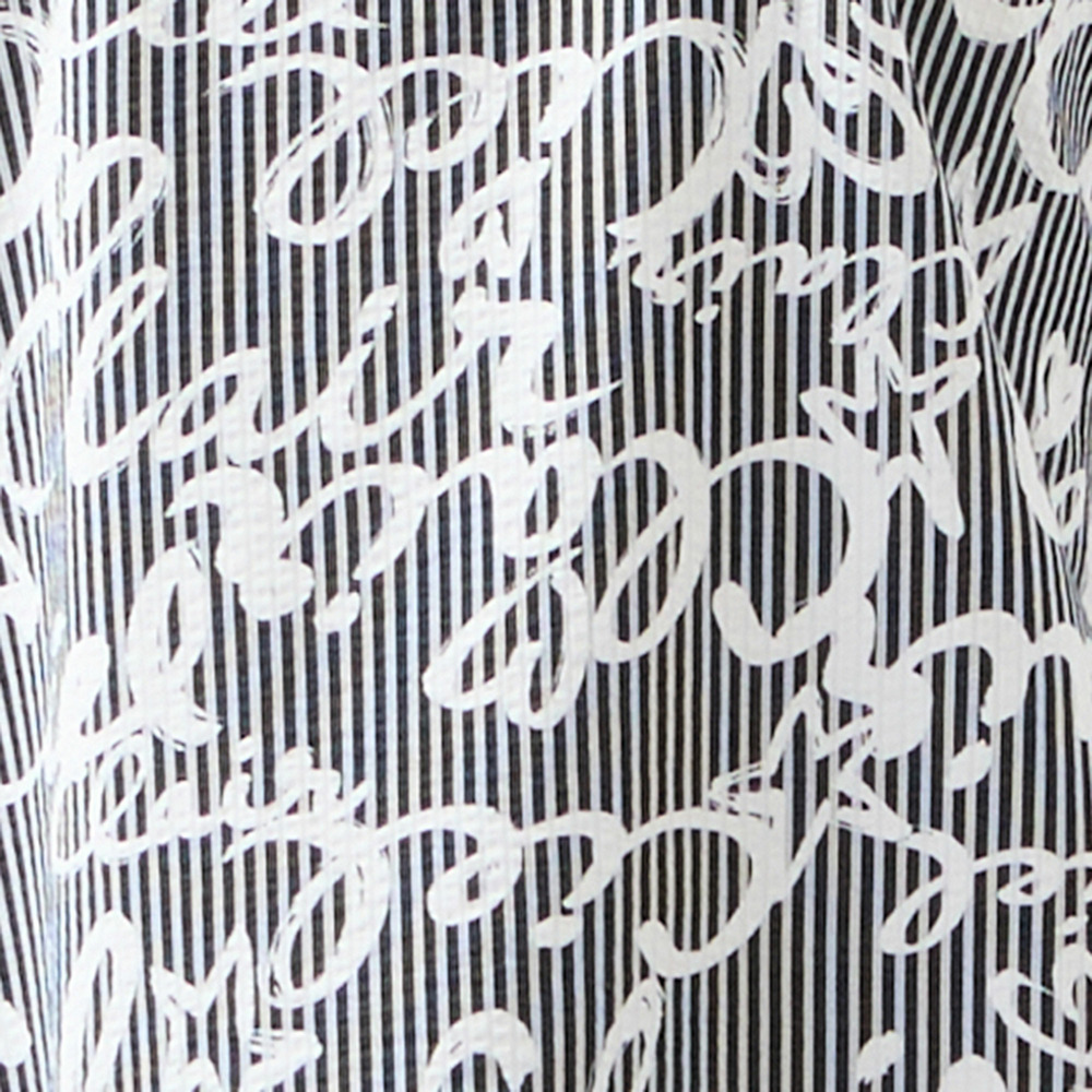 ストライプ組織の上にロゴ風の柄をプリントしたポップな柄が目を惹きます。