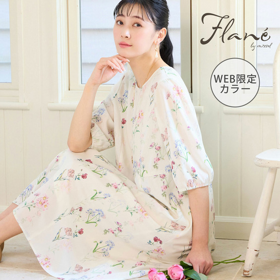 薄手のデシンにフラネオリジナルのボタニカルフラワー柄をプリントしたワンピース。
