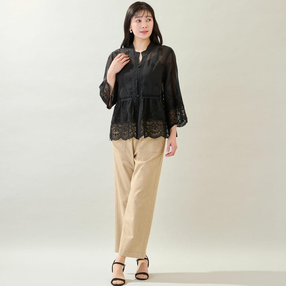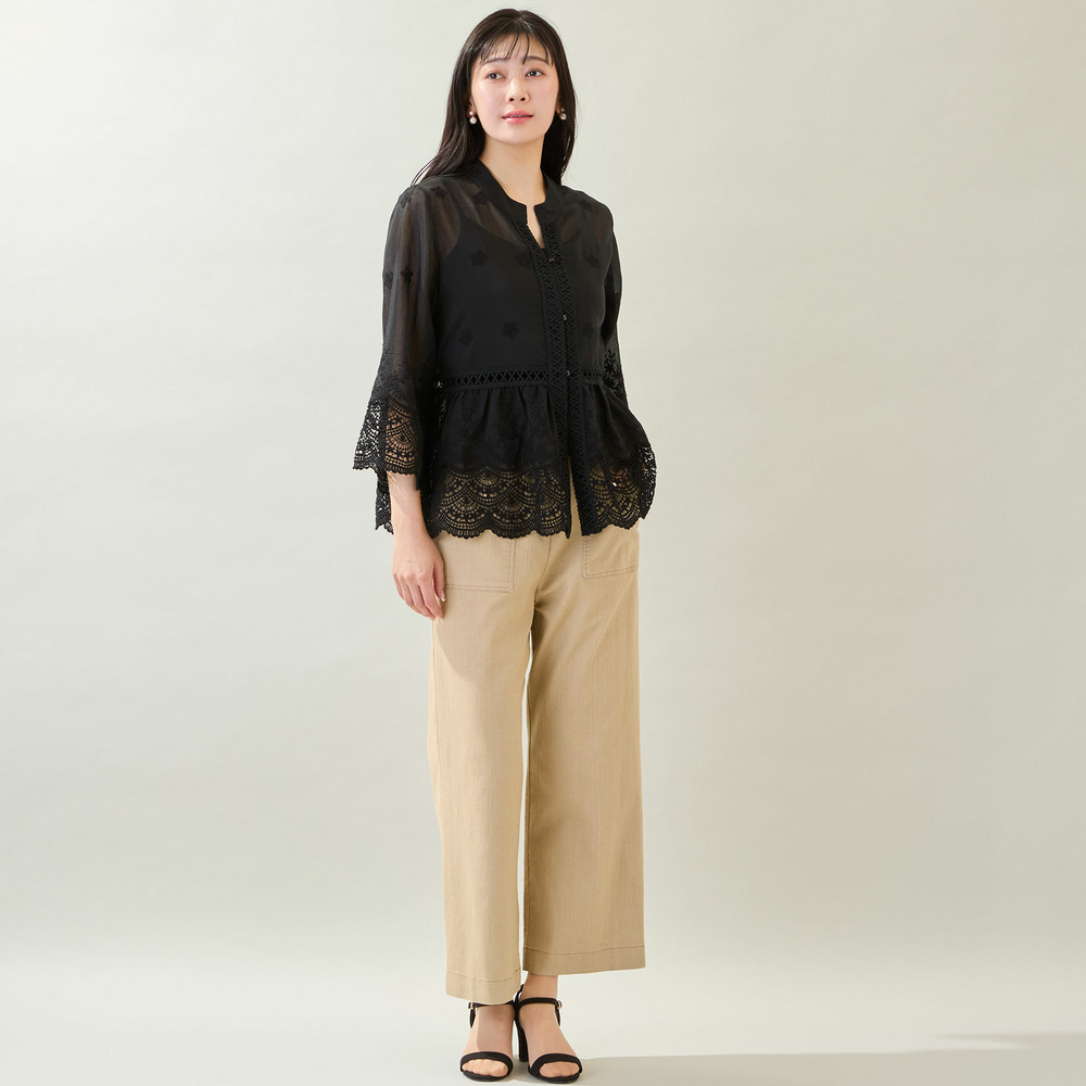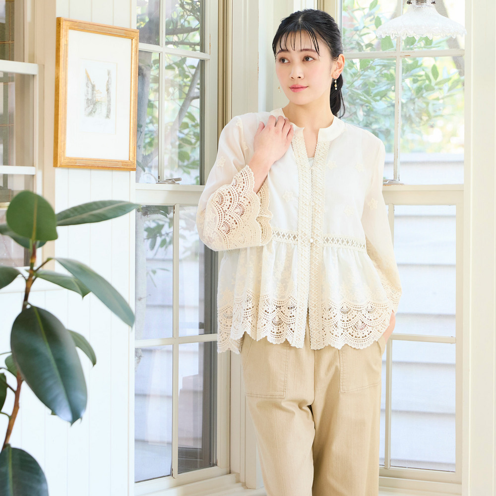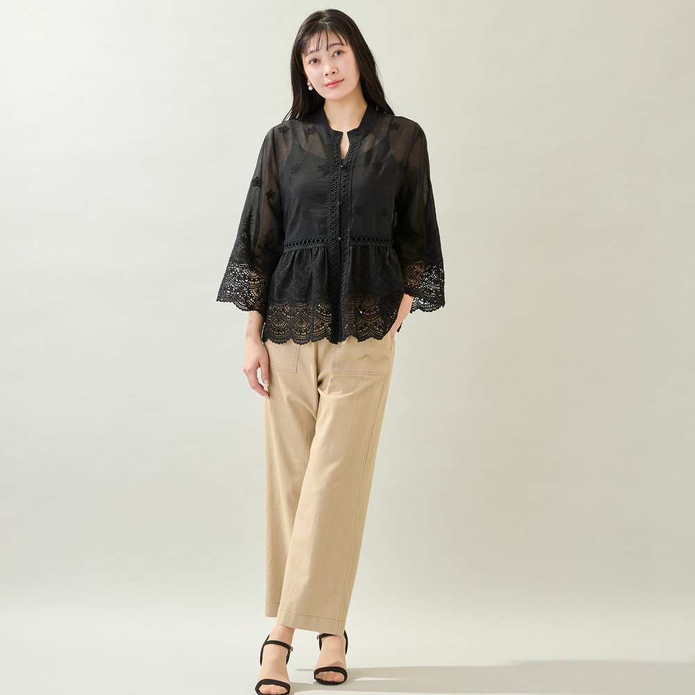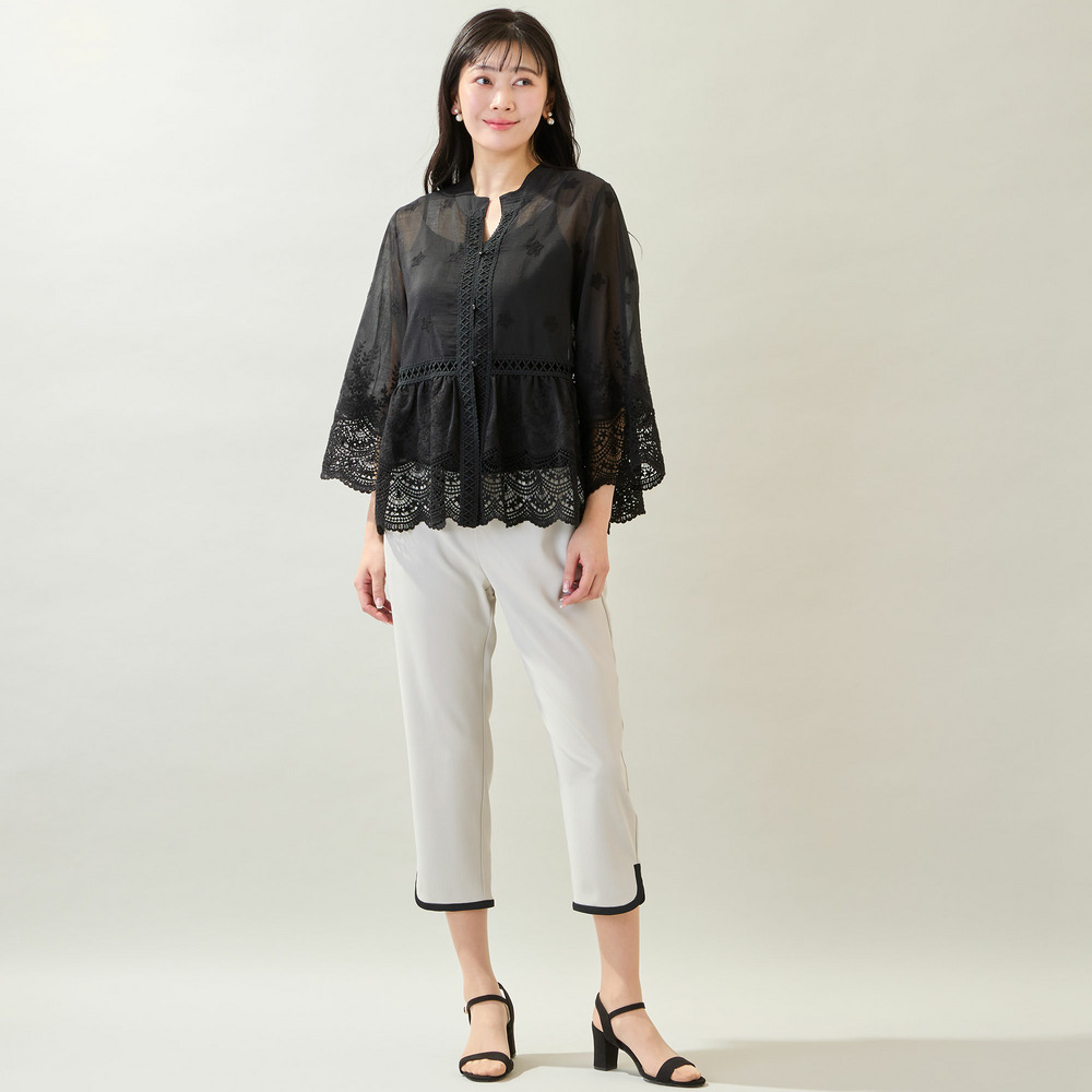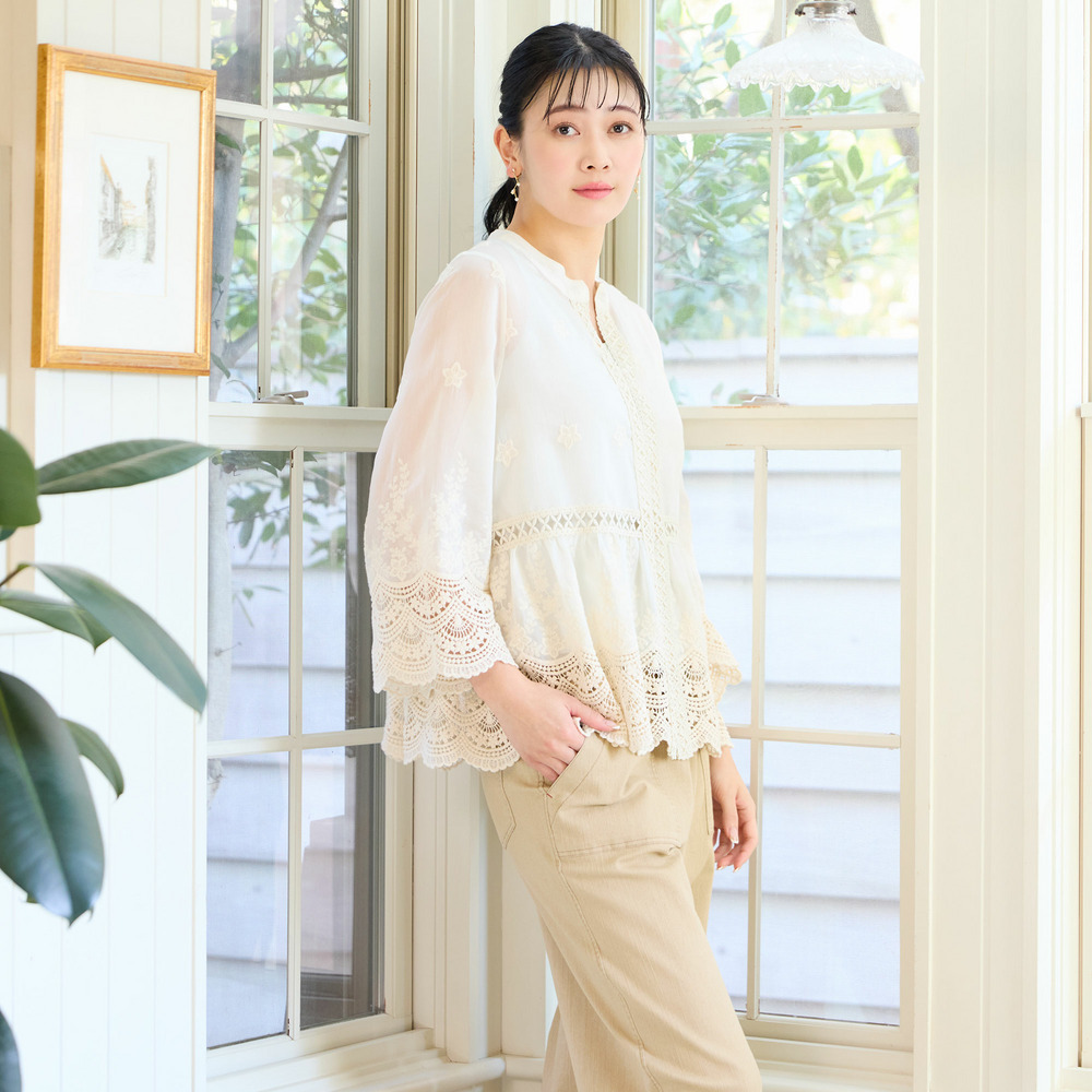 パンツスタイルに甘さを添えてくれる刺繍ブラウスです。