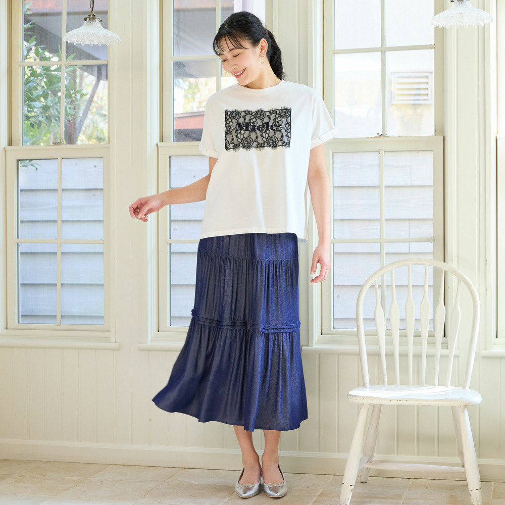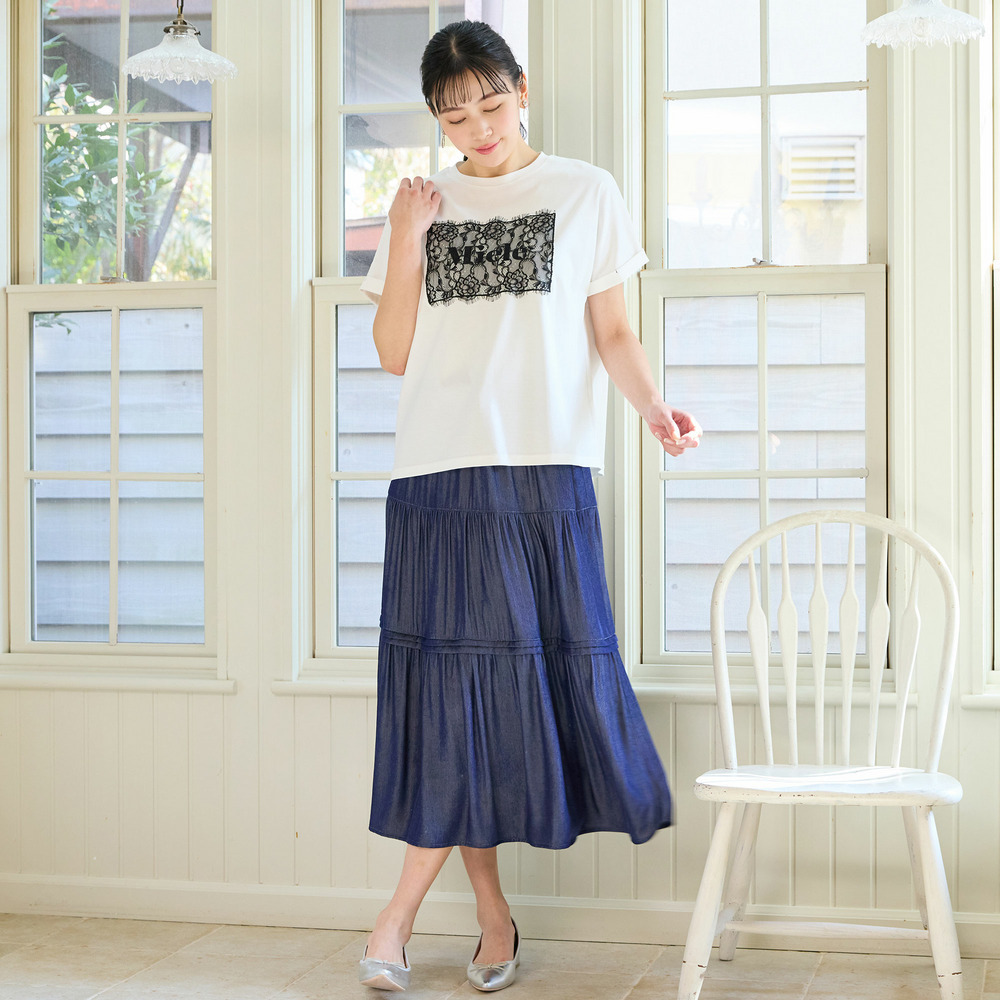 Tシャツやブラウスとのフェミニンな着こなしがおすすめ。