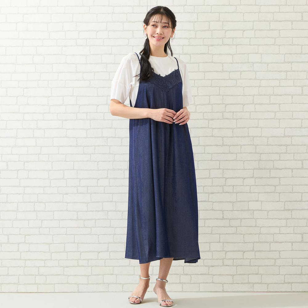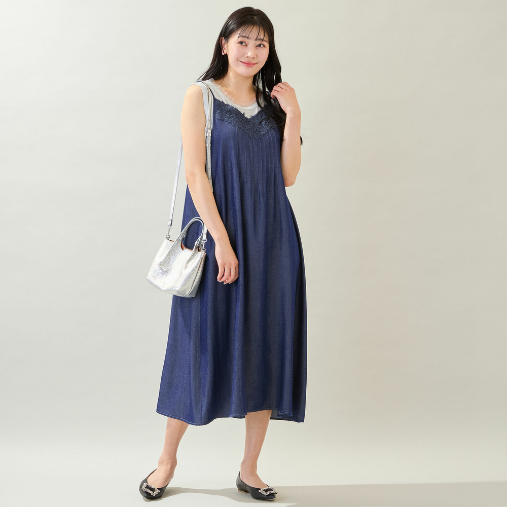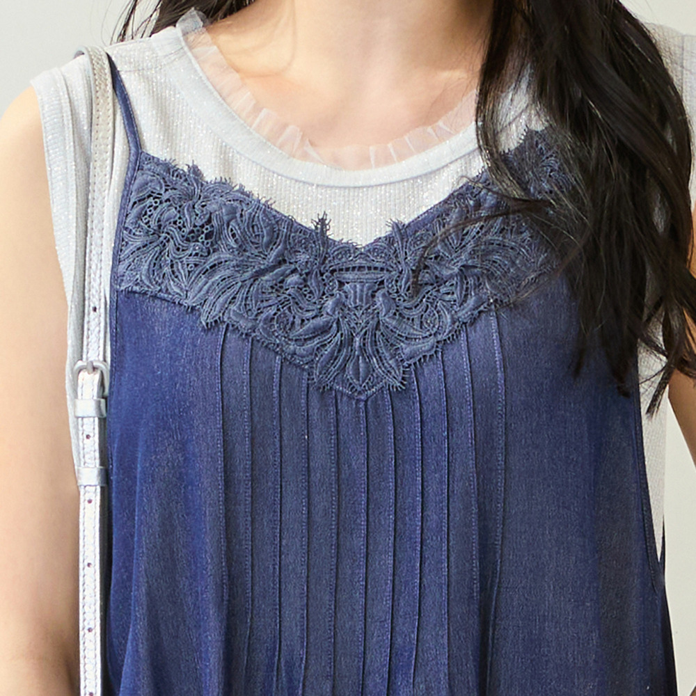 【洗える・体型カバー・M~3Lサイズ】レーストリムキャミワンピース(ネイビー)