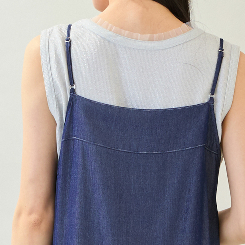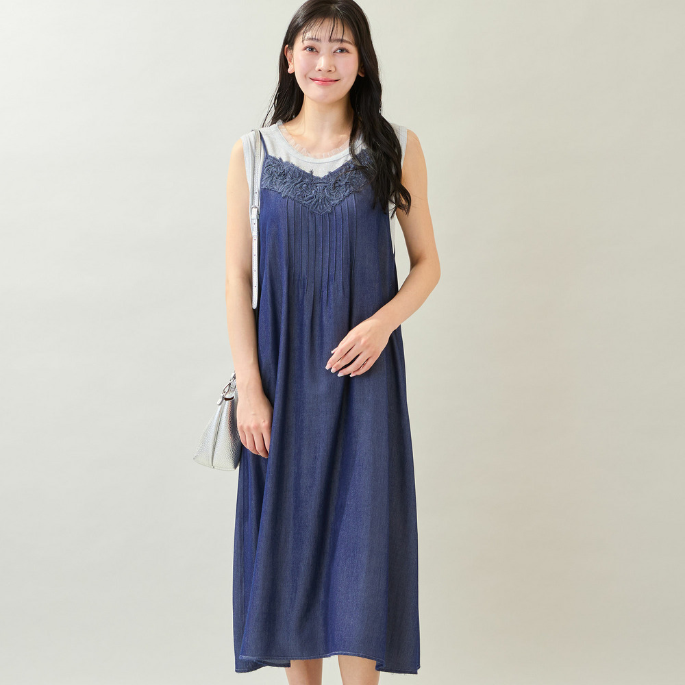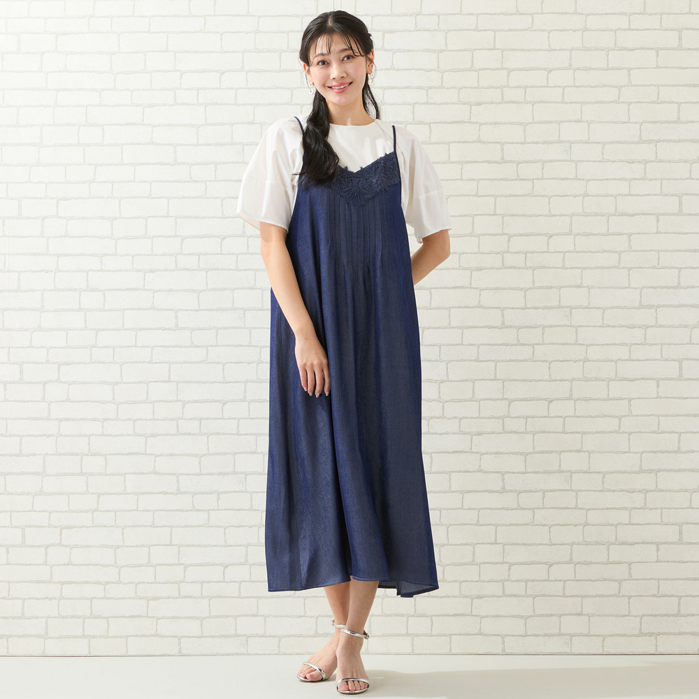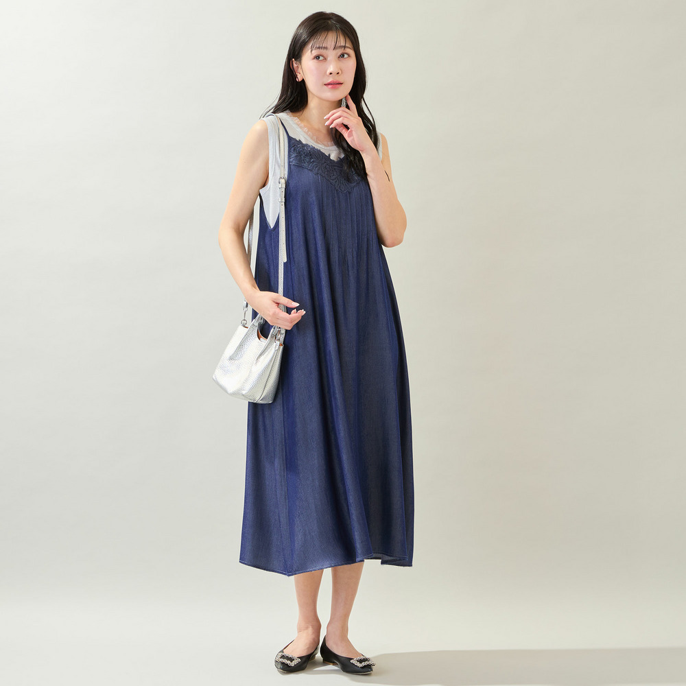 【洗える・体型カバー・M~3Lサイズ】レーストリムキャミワンピース(ネイビー)