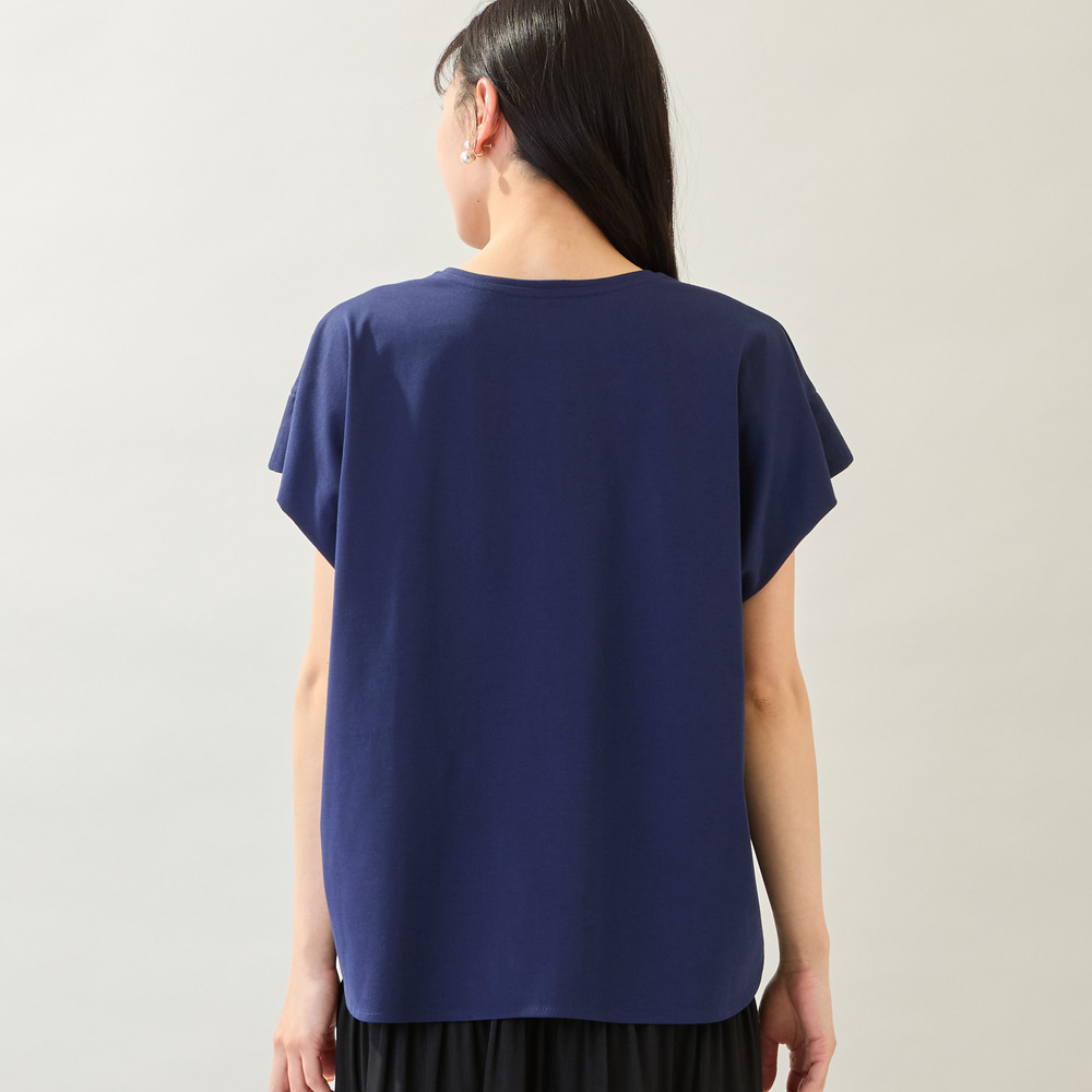 肩を覆うシルエットで一枚でも着やすく、後ろ丈が長いのでヒップラインをカバーできるのも魅力。