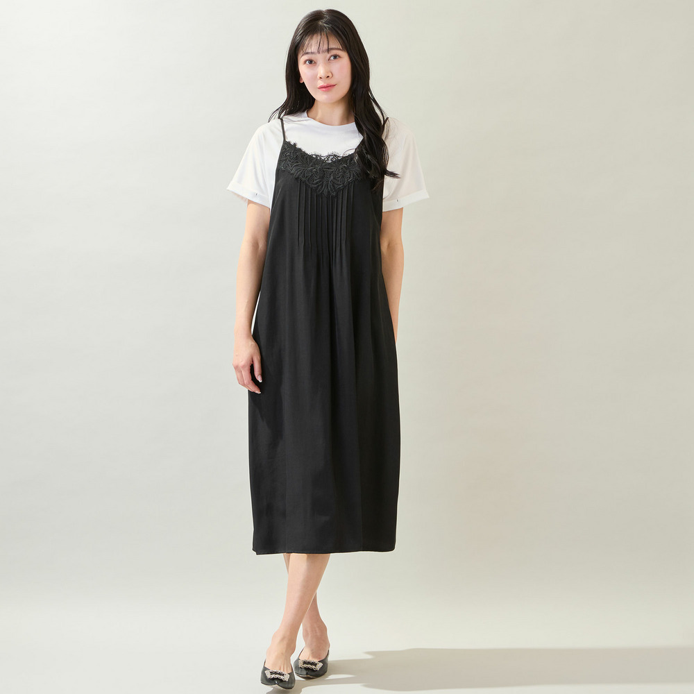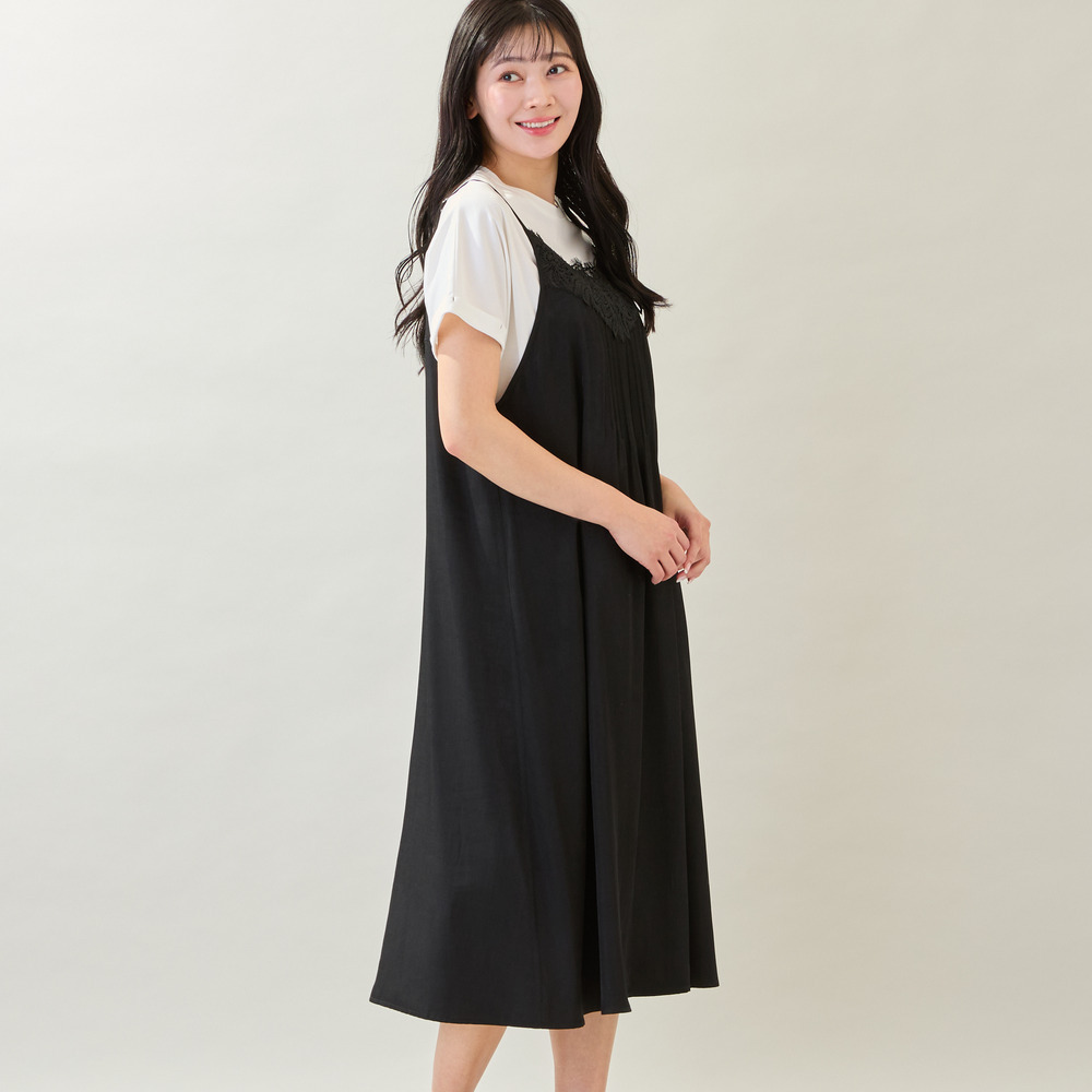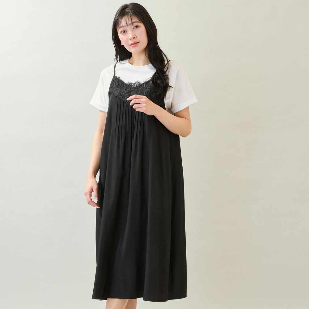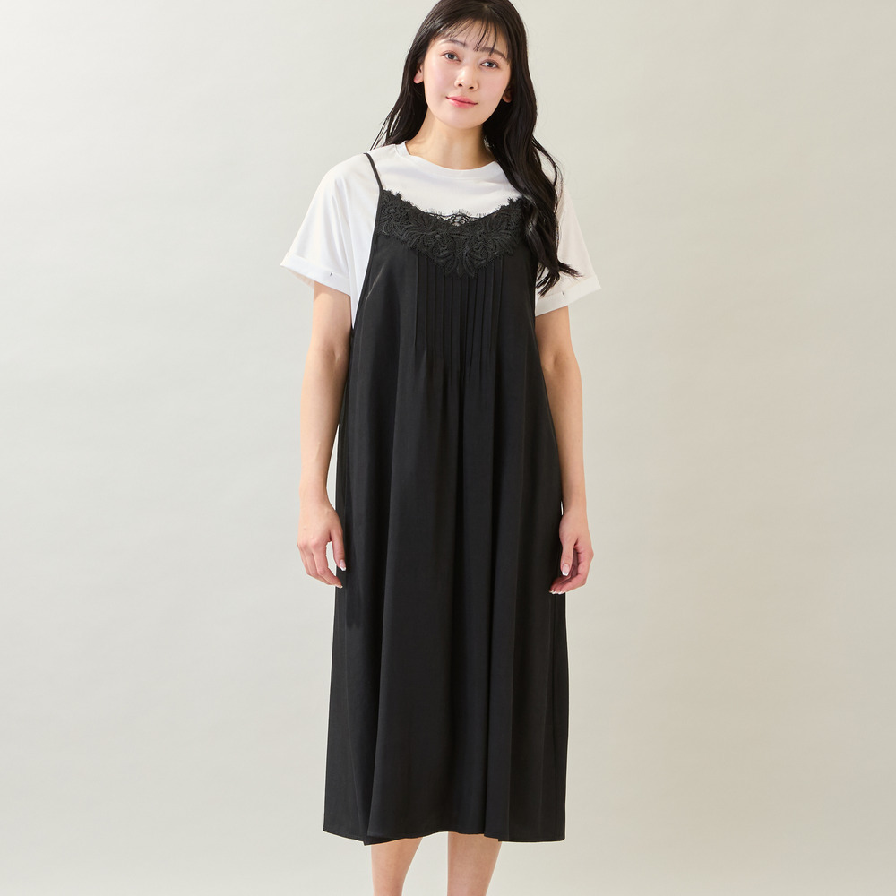 【洗える・体型カバー・M~3Lサイズ】レーストリムキャミワンピース(ブラック)