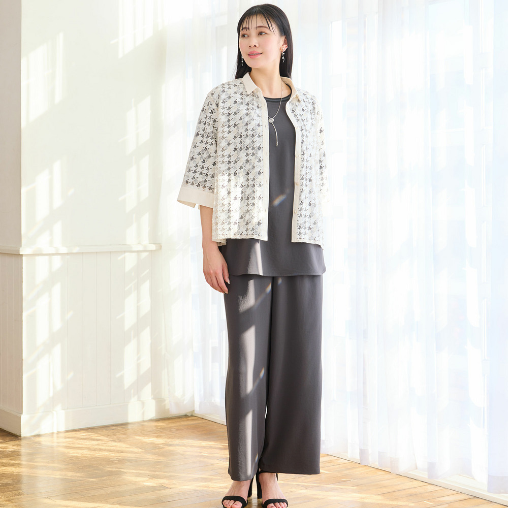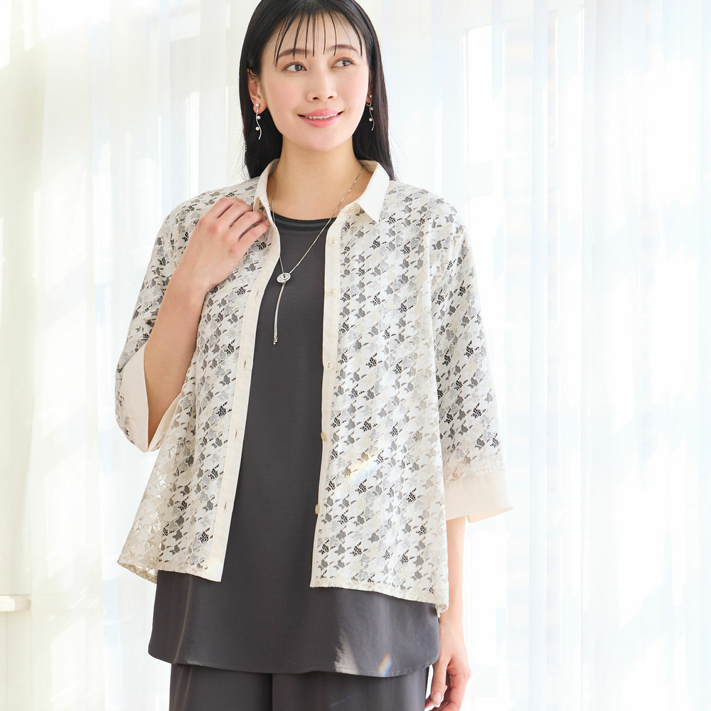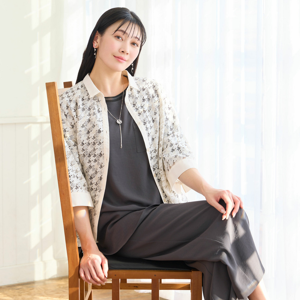 レースのシャツを羽織ればぐっとエレガントな印象に。