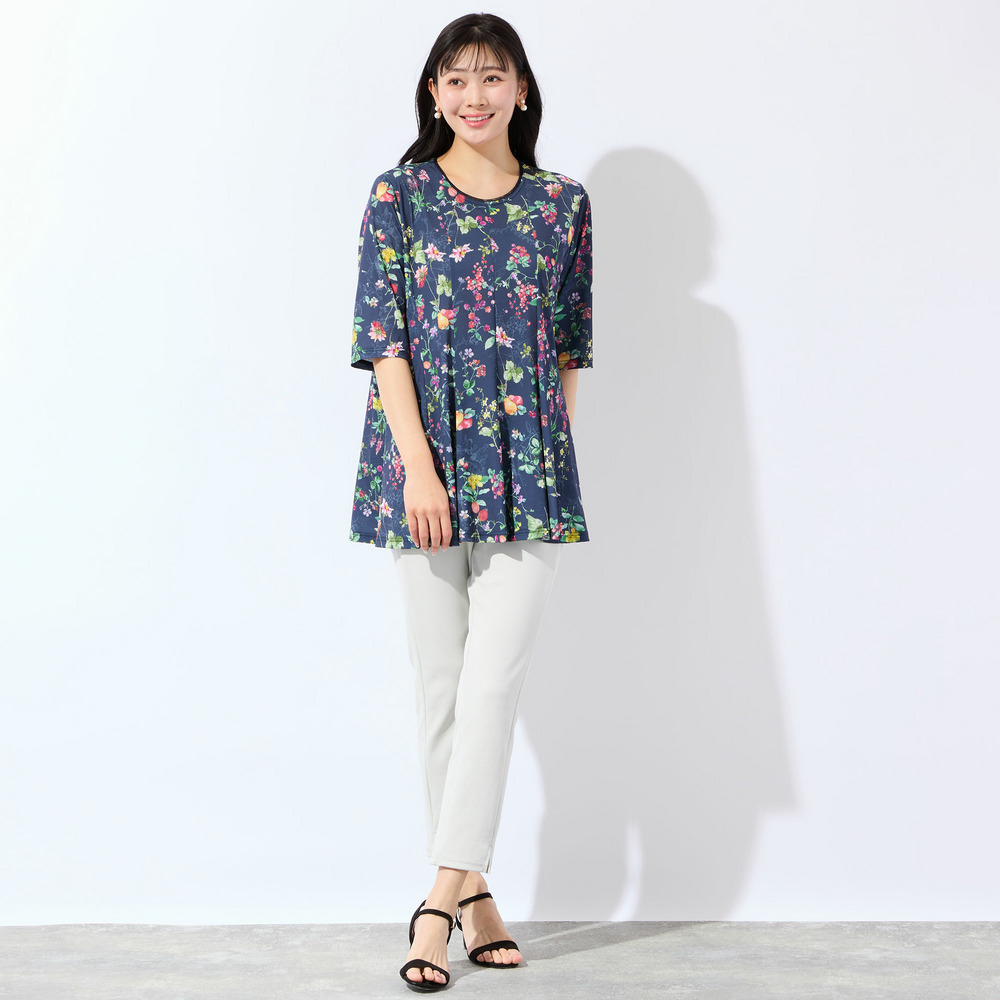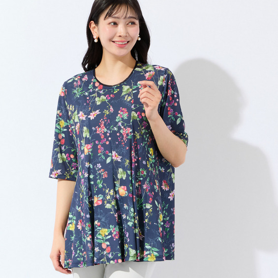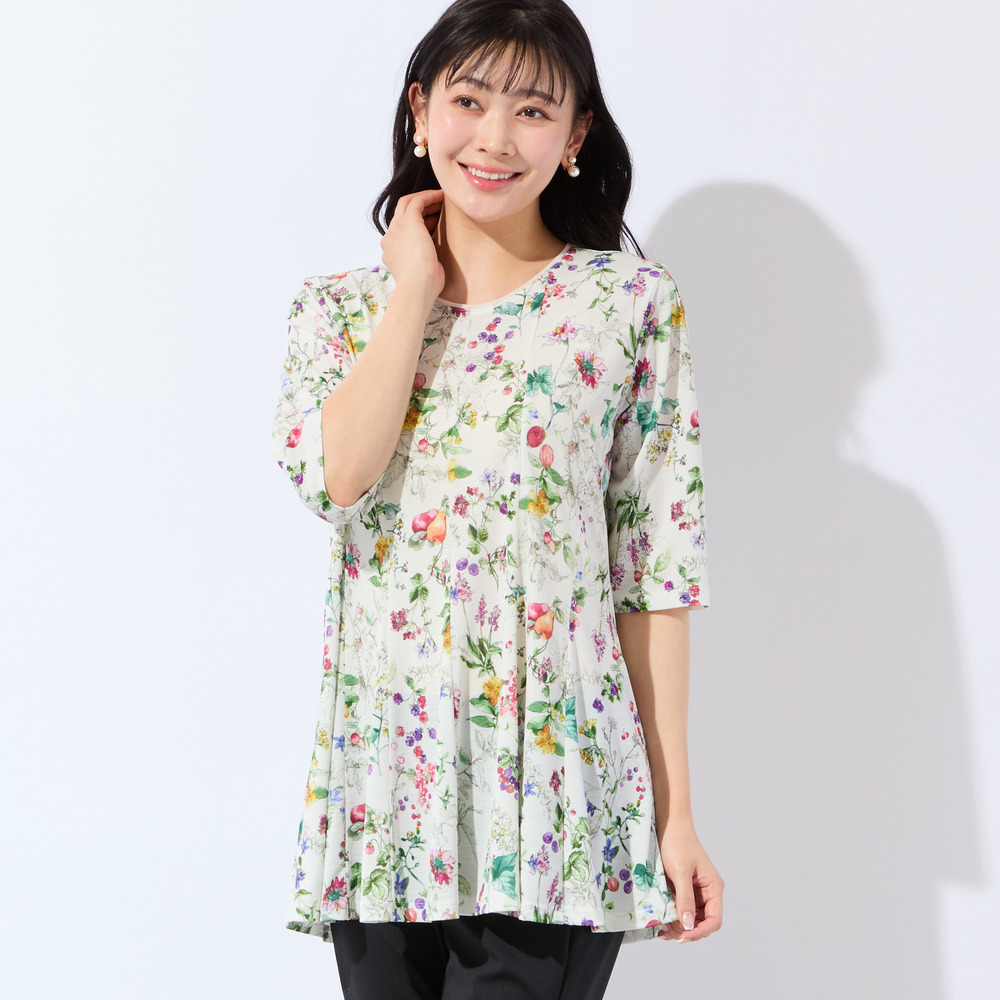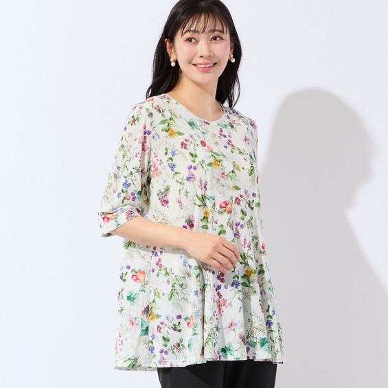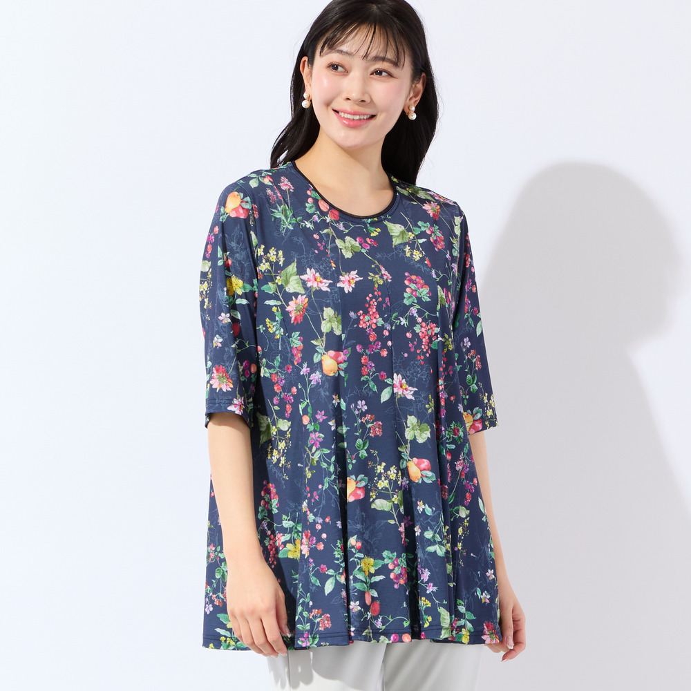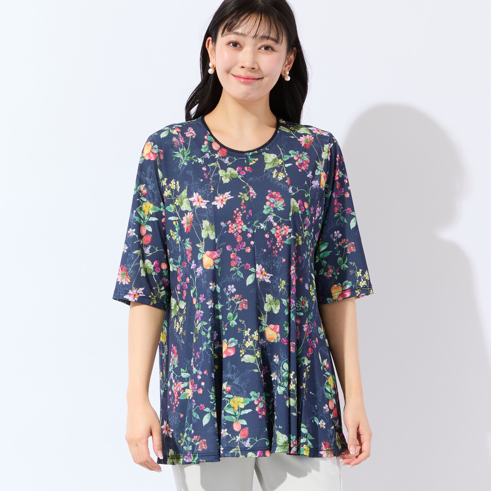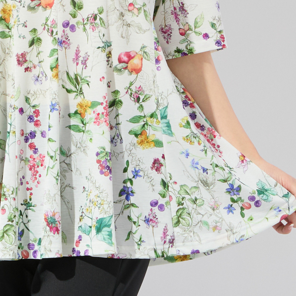 【人気デザイン・洗える・L~4Lサイズ】フルーツ柄フレアチュニック