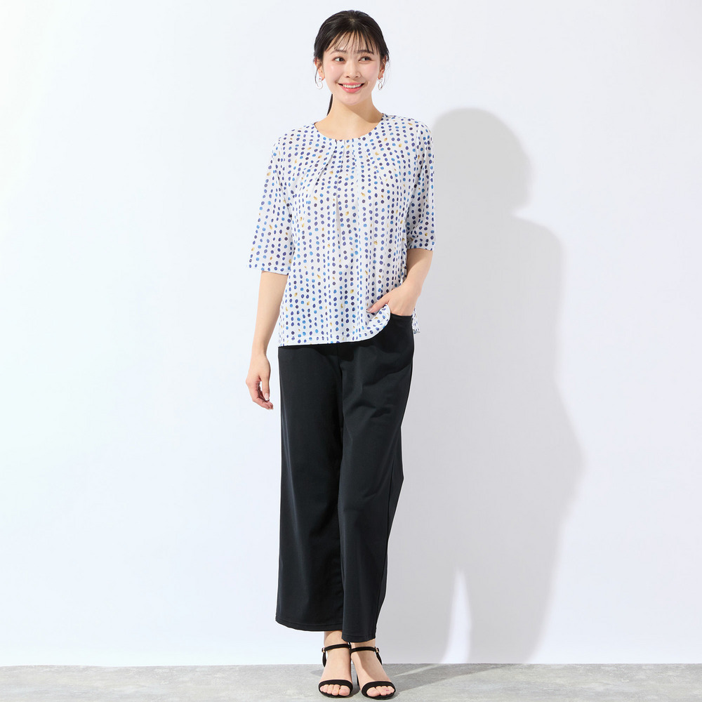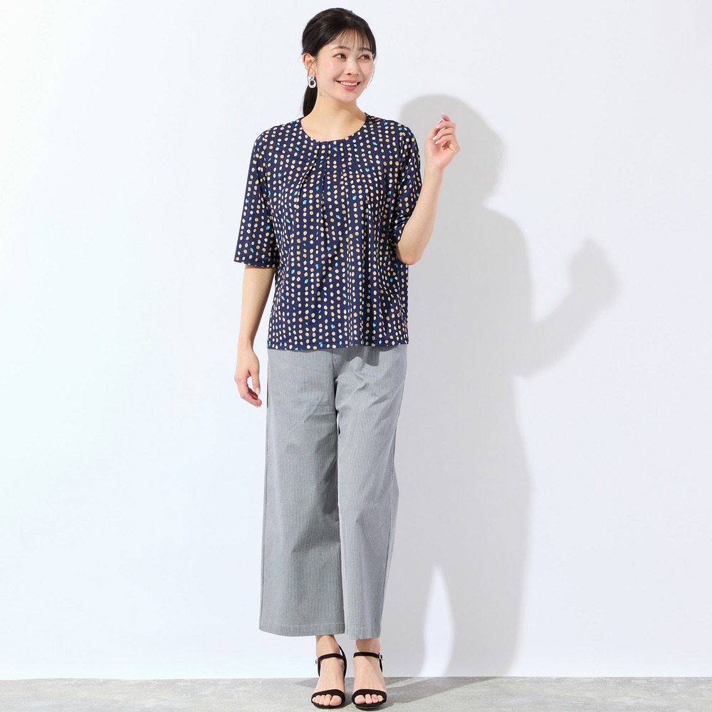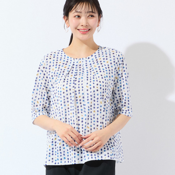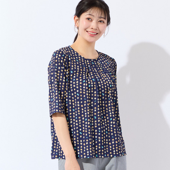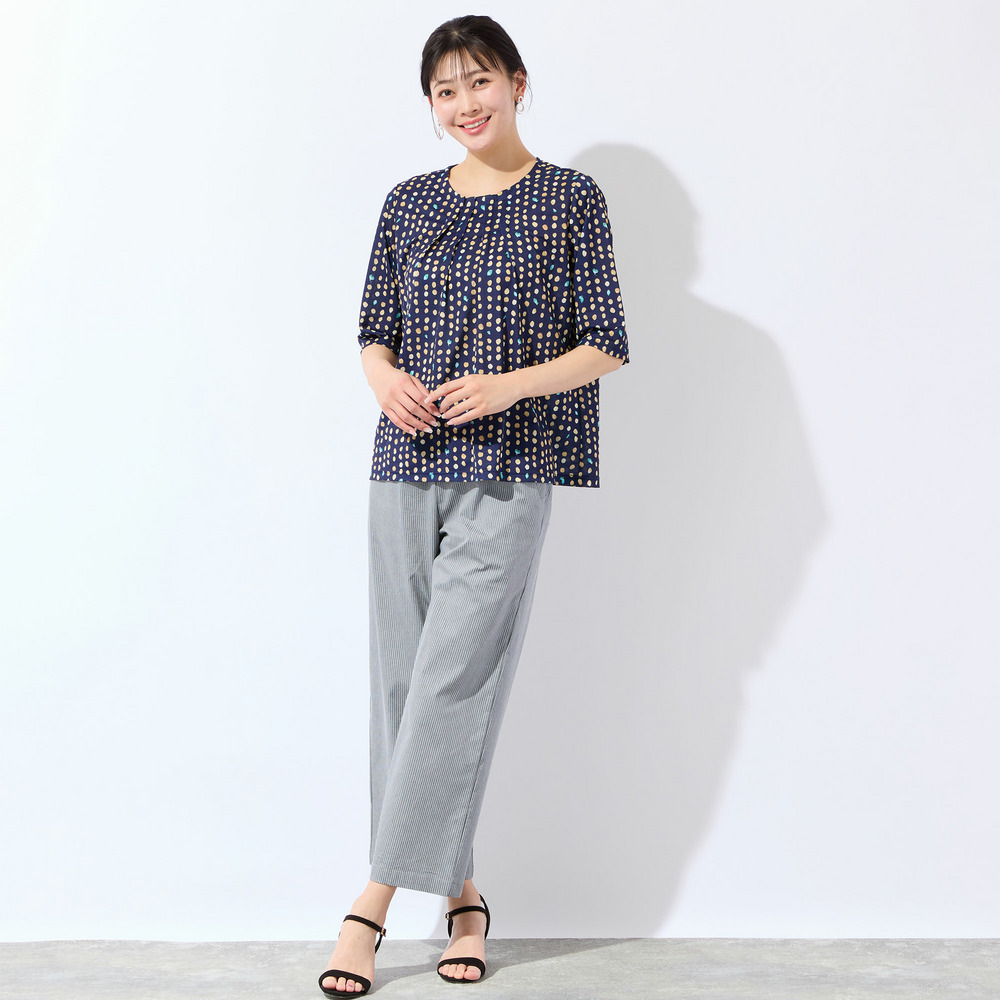 フロントの襟ぐりにタックを入れてアクセントにしました。