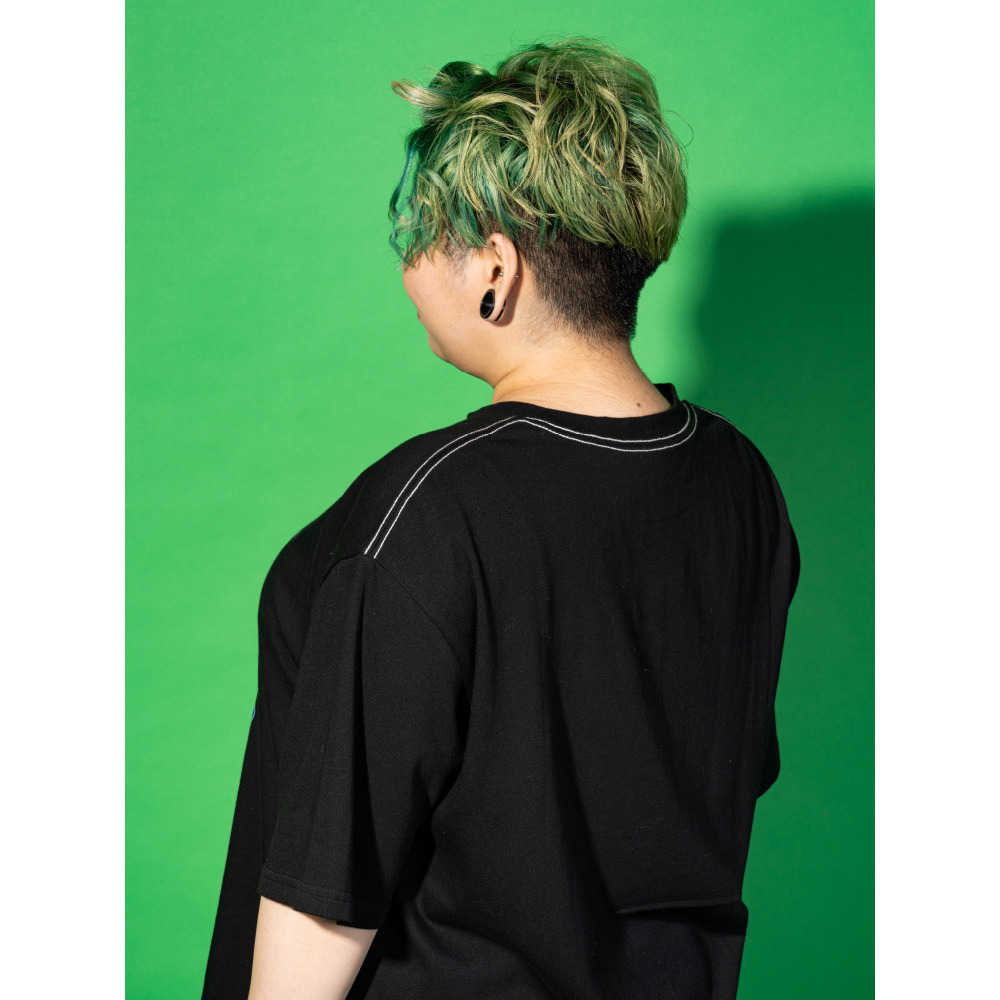 裾のシャツテイルや、アクセントとして襟元に施した配色ステッチがポイント。