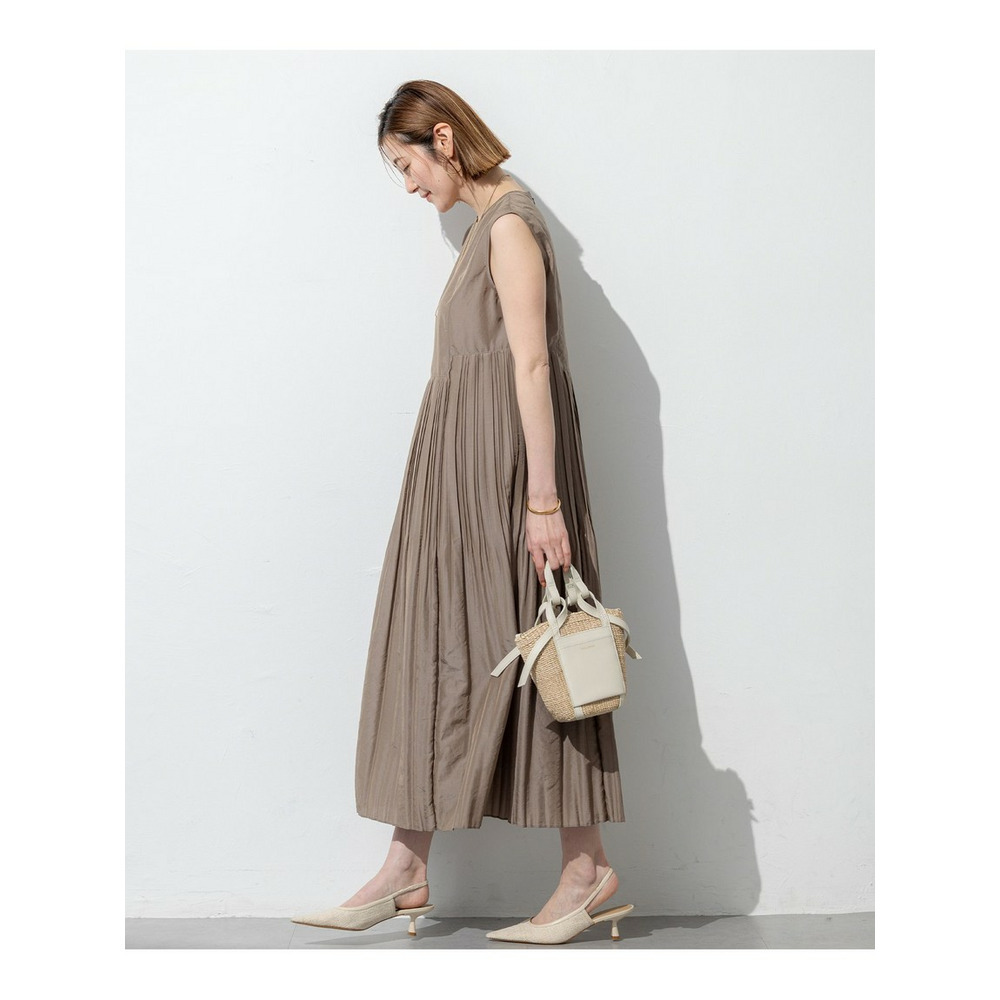 清楚な印象のプリーツをスカート部分に贅沢にあしらったワンピース。上品な艶感としなやかな落ち感のある素材で広がりすぎない上品なボリューム感、ウエスト位置を高くとることでスタイルよくみえるように仕上げています。キレイめにもカジュアルにも使いやすいシンプルなスリーブレスデザインで1枚でも品があり、羽織りアイテムも重ねやすいデザインです。カラーは、爽やかな青味を感じるダークグリーン(#065)、暑い時期にもカジュアルすぎず適度な品を感じるモカ(#034)、清楚な優雅さを引き立てる深みのあるネイビー(#075)の3色展開です。
