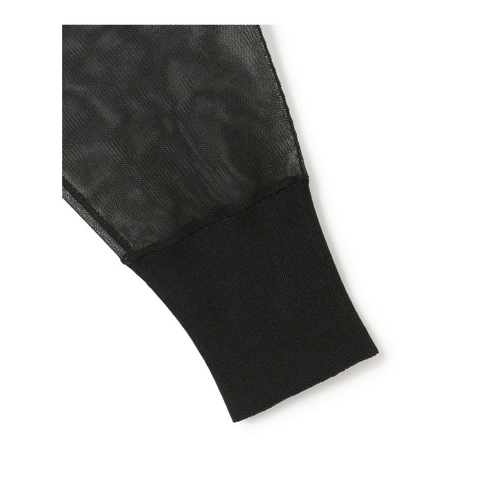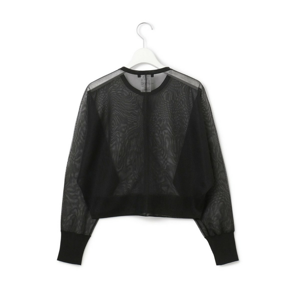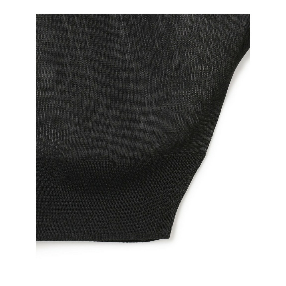 上品なツヤ感と適度なシアー感のある素材です。細い糸を2種使用した編立てで、繊細な印象に仕上げています。少々の張りがあるため肌離れがよく、薄くてもボディーラインを拾いにくい素材感です。暑い時期に冷房対策としても活躍します。ご自宅でお洗濯ができるのも嬉しいポイントです。
