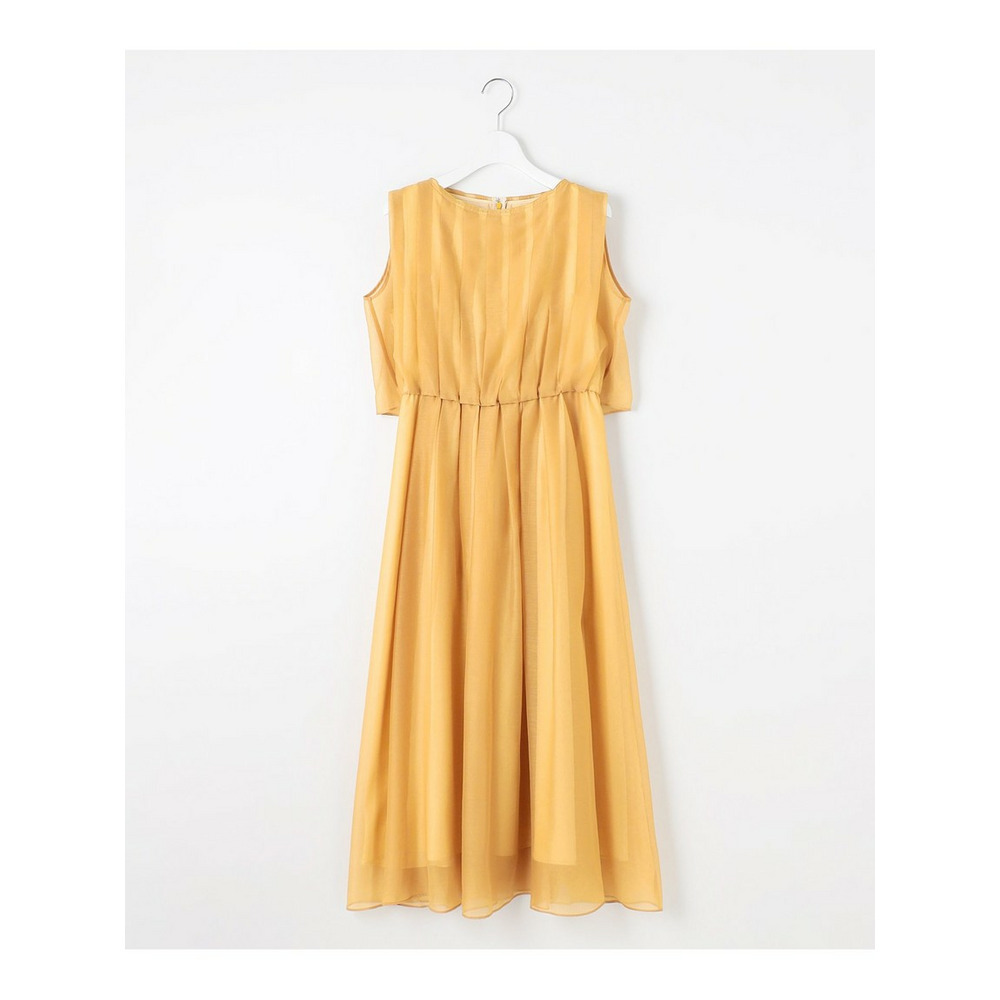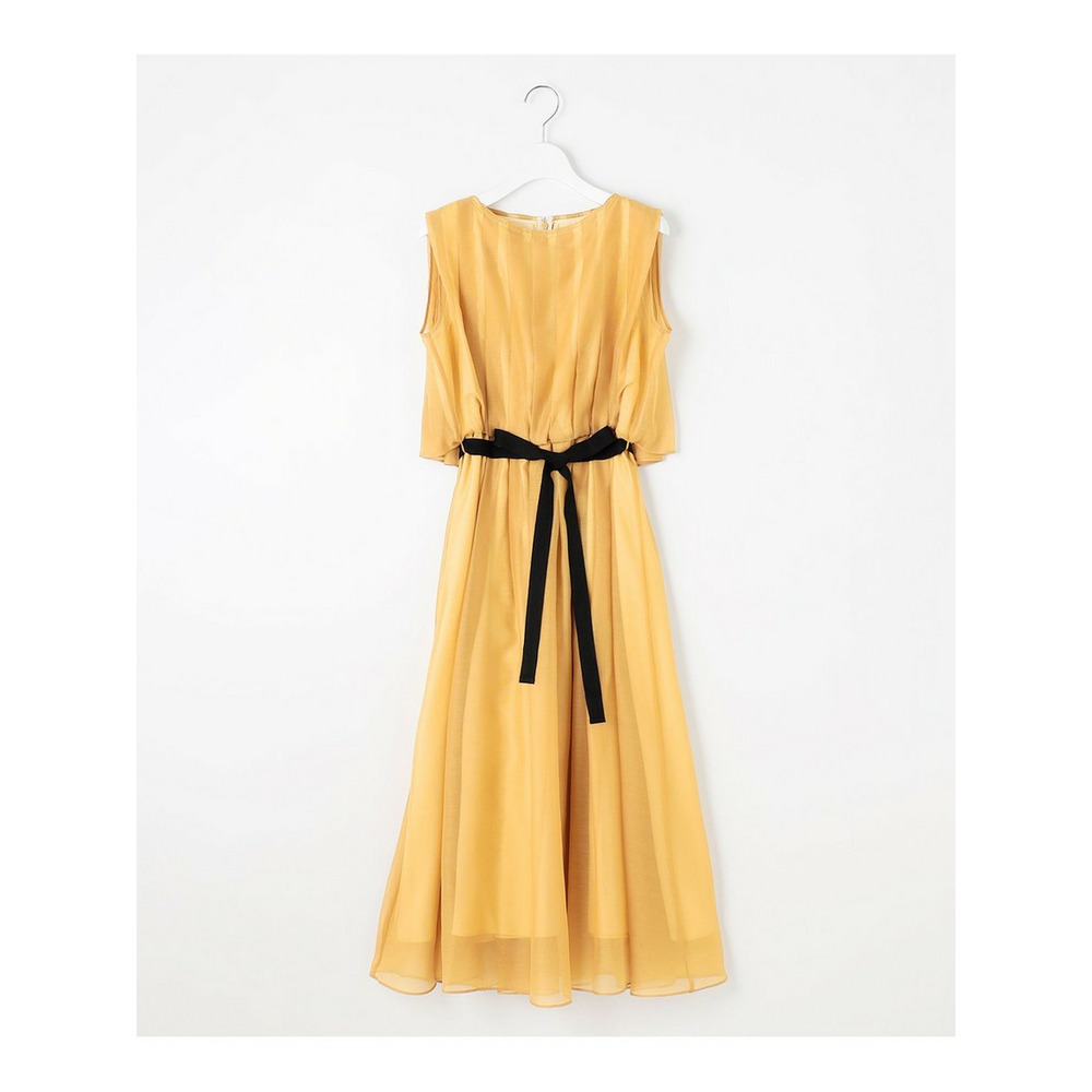 タックのディティールをきかせて程よく甘さを抑えたデザインドレス。バックはトップスをレイヤードしているように見せることでウエストラインをさりげなくカバーします。ウエストベルトはブラックのグログランを使用し、シックな雰囲気をプラスしてくれるアクセントに。視覚的にすっきりとした印象になるよう仕上げています。やわらかな優しい雰囲気のブラウン(#030)と、肌馴染みよく幸福感をくれるイエロー(#040)、清楚な気品が漂うネイビー(#075)の3色展開です。