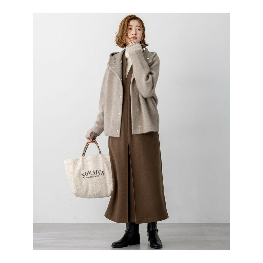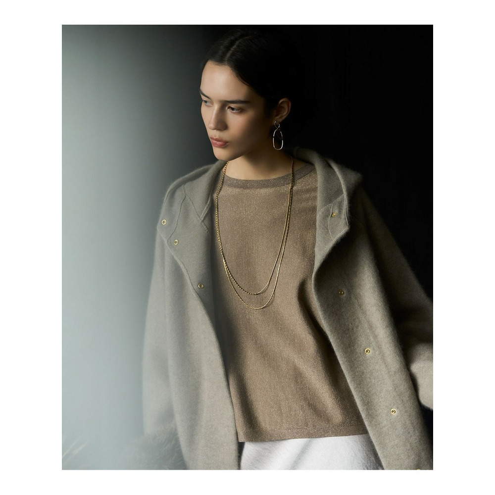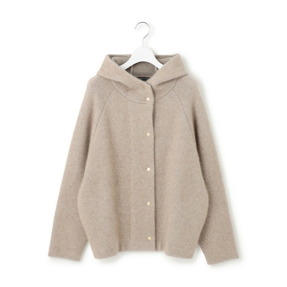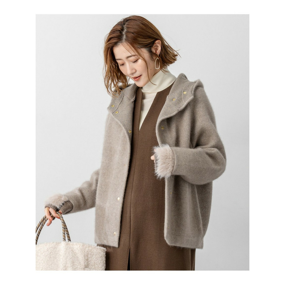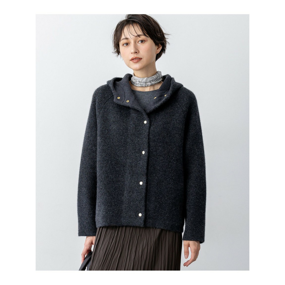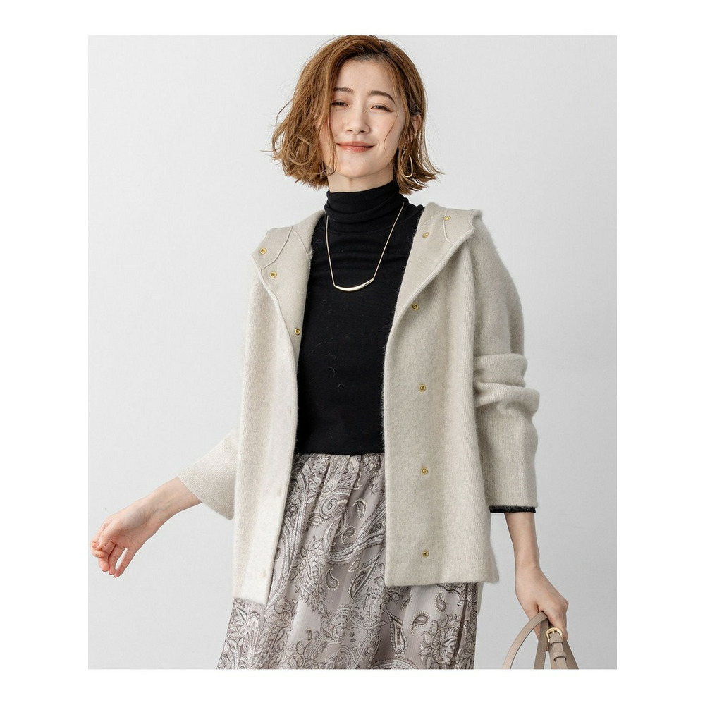 接結編みで仕立てたニットアウターから、新型のフーディーが仲間入り。表側はラクーンウールを使用し、裏側はポリエステルの軽い素材を使用しています。これにより、インナーに毛がつきにくく、袖通しも良いのが特徴です。ゴールドのドットボタンがアクセントになった、ドルマンスリーブデザイン。ややコクーンシルエットになっていて、着用したときに立体感が出るのが特徴です。ポケットも付いているので便利です。カジュアルなフーディーながら、上質な素材感とゴールドのボタンで上品さをキープ。パンツはもちろん、スカートやワンピースとも好相性で、いつものスタイルにトレンド感をプラスしてくれるアイテムです。カラーは、やわらかな印象のアイボリー(#002)、コーデに深みが出るグレー(#004)、ナチュラルに纏えるベージュ(#033)の3色展開です。