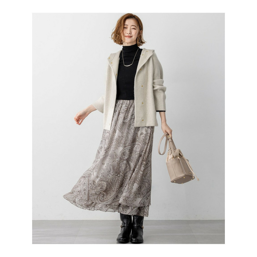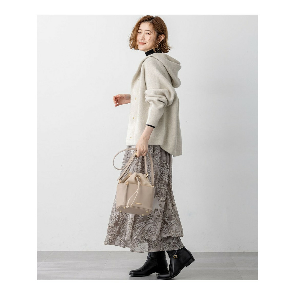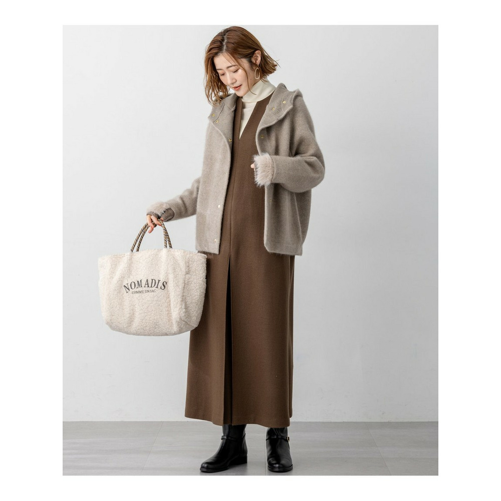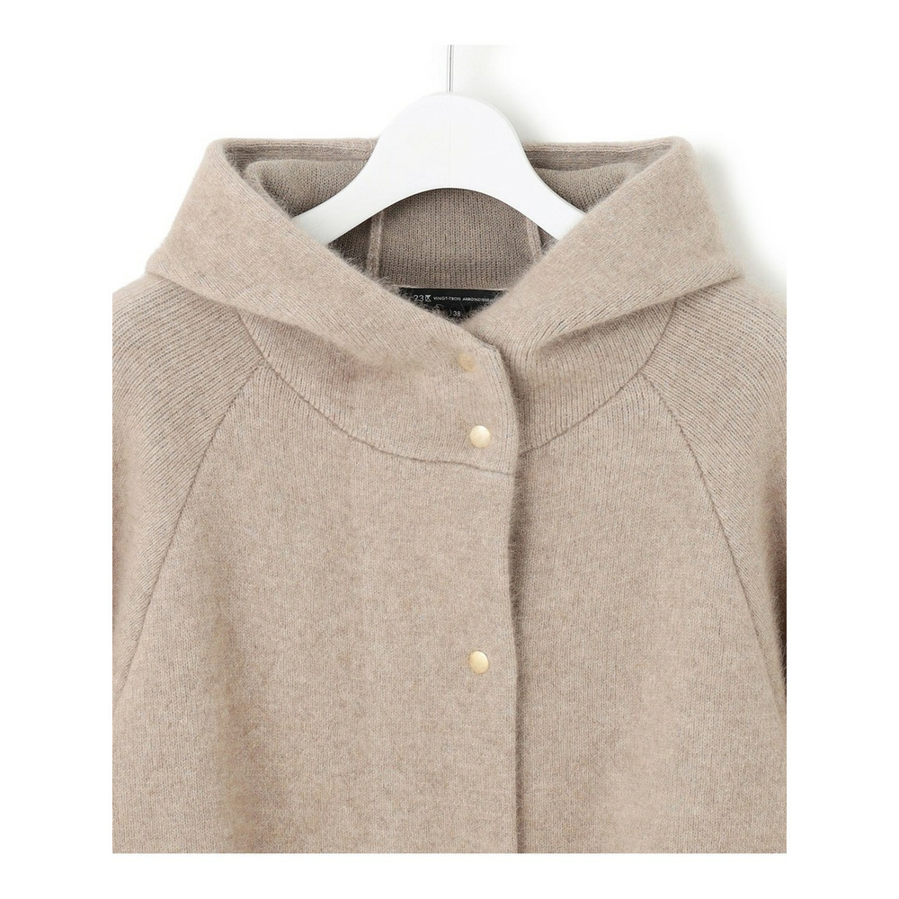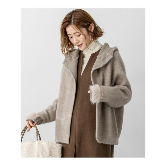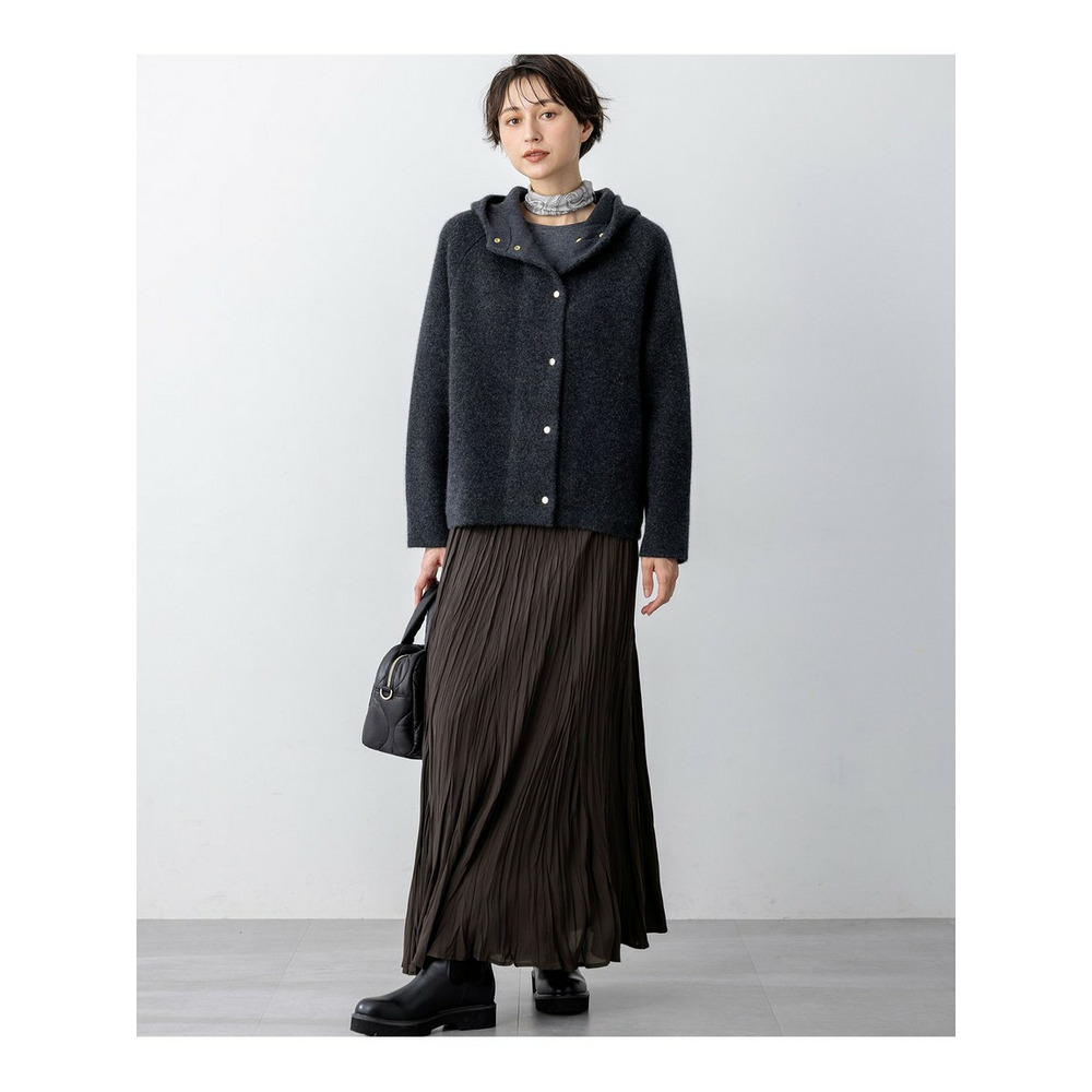 接結編みで仕立てたニットアウターから、新型のフーディーが仲間入り。表側はラクーンウールを使用し、裏側はポリエステルの軽い素材を使用しています。これにより、インナーに毛がつきにくく、袖通しも良いのが特徴です。ゴールドのドットボタンがアクセントになった、ドルマンスリーブデザイン。ややコクーンシルエットになっていて、着用したときに立体感が出るのが特徴です。ポケットも付いているので便利です。カジュアルなフーディーながら、上質な素材感とゴールドのボタンで上品さをキープ。パンツはもちろん、スカートやワンピースとも好相性で、いつものスタイルにトレンド感をプラスしてくれるアイテムです。カラーは、やわらかな印象のアイボリー(#002)、コーデに深みが出るグレー(#004)、ナチュラルに纏えるベージュ(#033)の3色展開です。