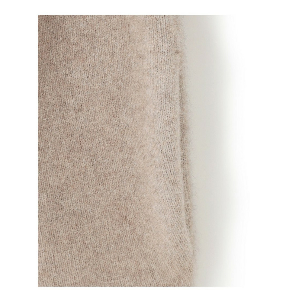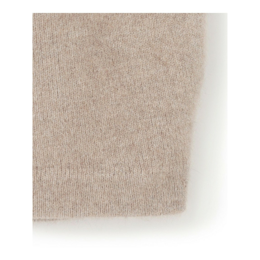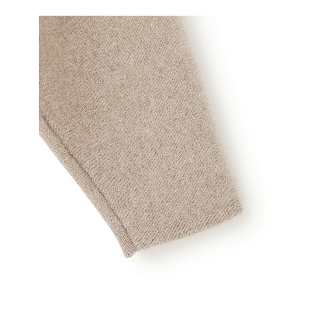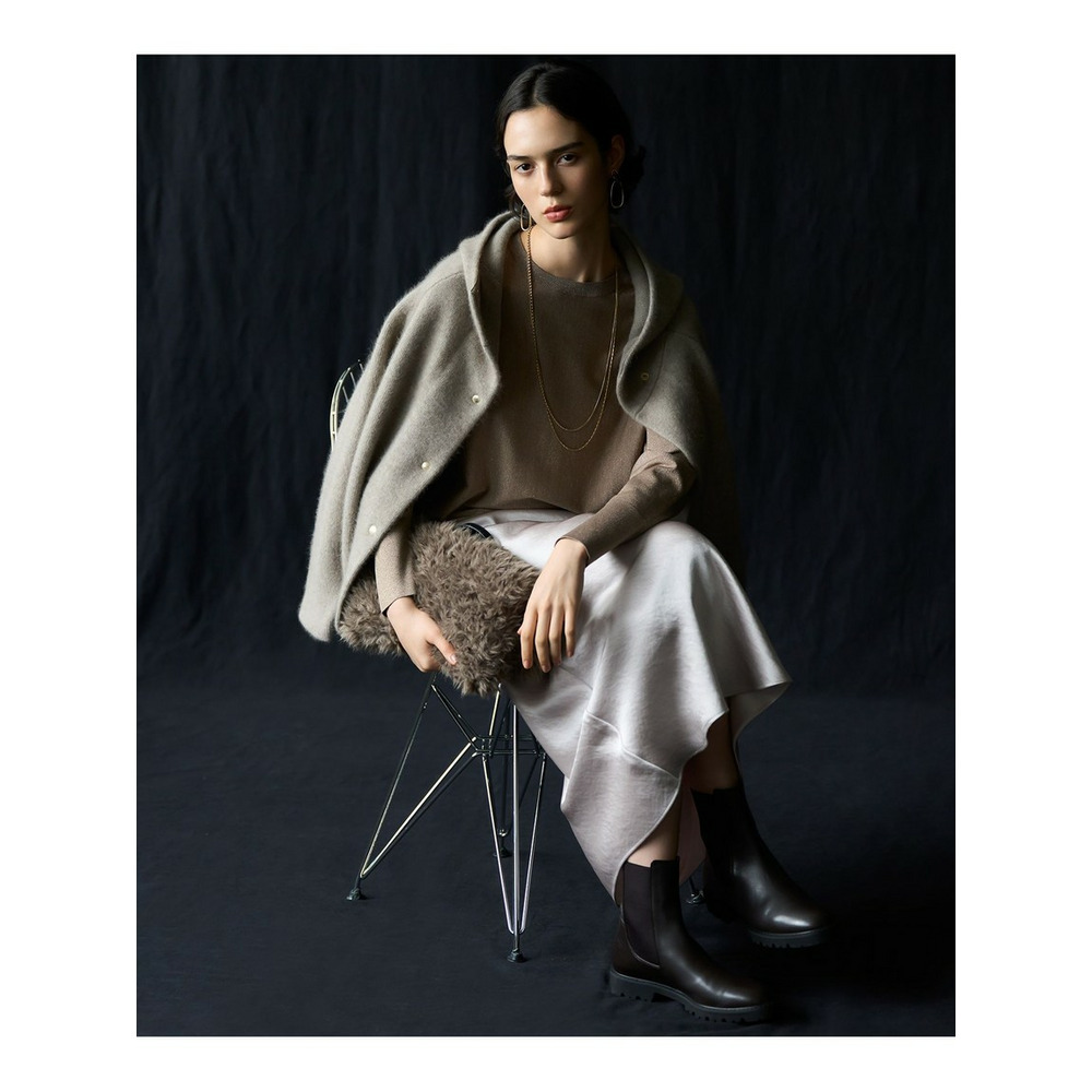 軽くて暖かく、ふわふわと柔らかな肌触りが特徴のチャイニーズラクーンと、スポンジのような質感のポリエステル素材をダブルフェイス風に編み立てています。ファーのような表情感もありながら、裏面にポリエステルを使うことで、インナーに毛がつきにくく、滑らかな着心地を実現しました。
