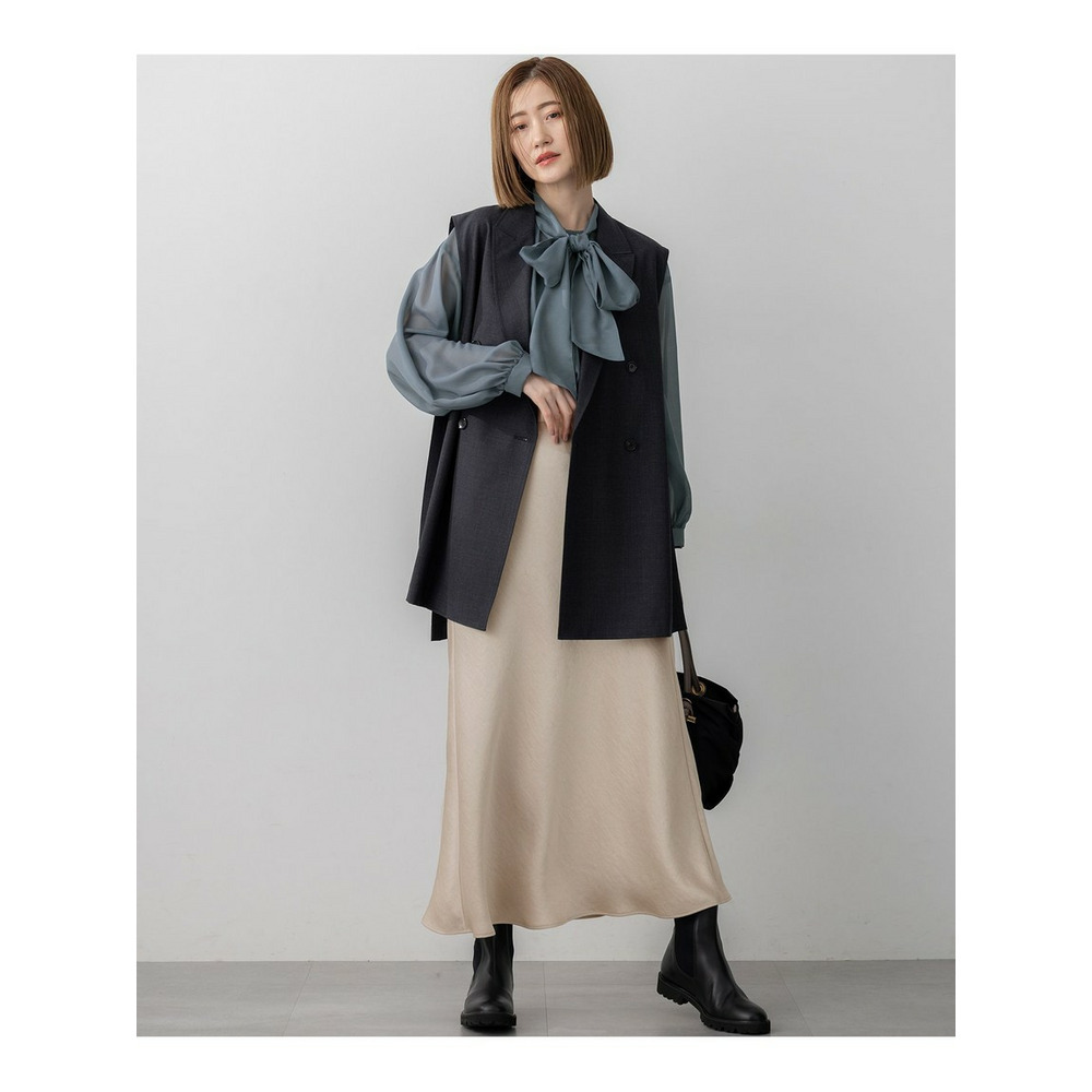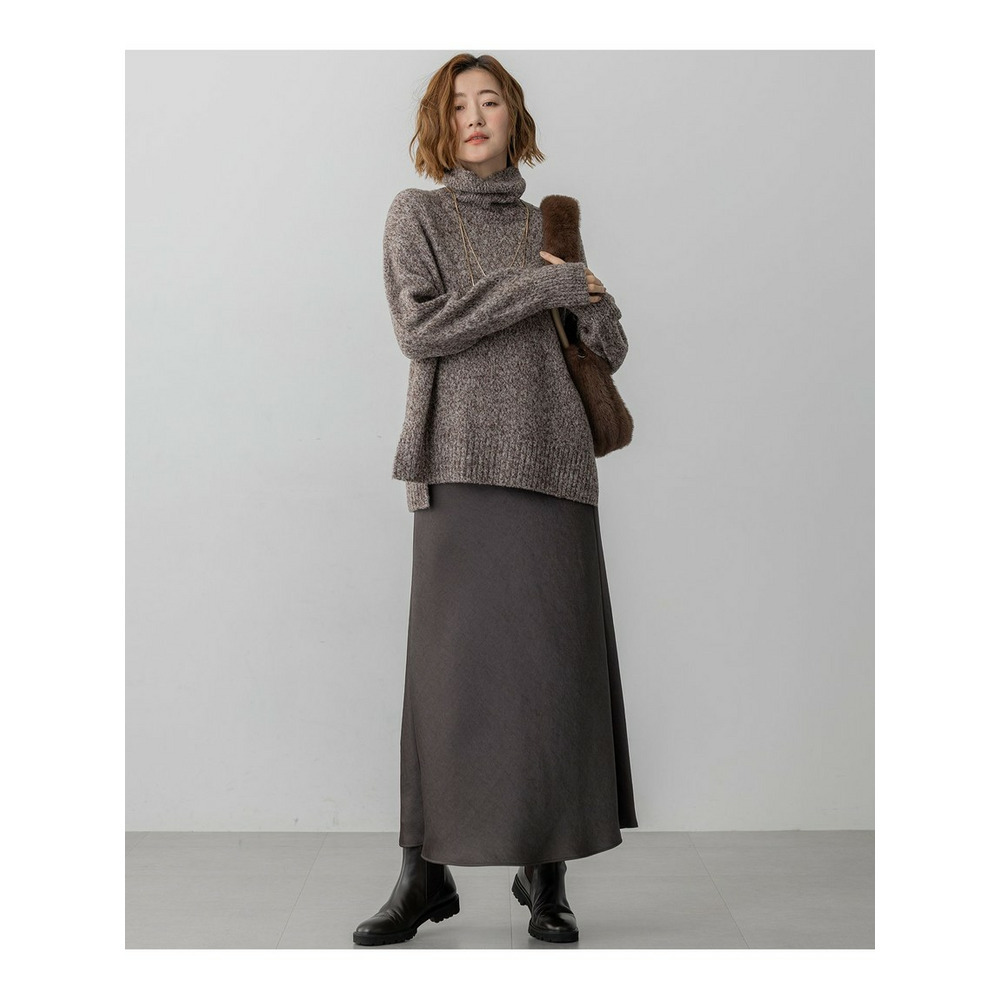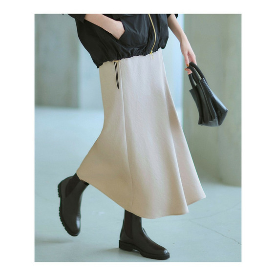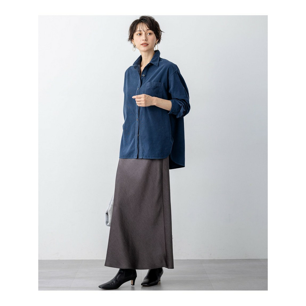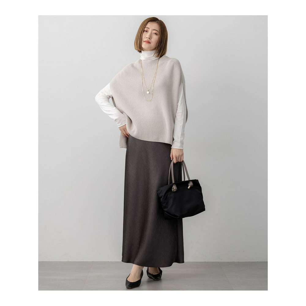 落ち感のあるナロースカート。程よい肉感で体に張り付かず、女性らしいシルエットを作り出してくれます。ウエスト部分はオールゴムで着脱しやすいのも嬉しいポイント。前側のゴムはスッキリと見えるように作っており、トップスをインしてもごわつかないように仕上げています。光沢のあるサテンの質感は、どんなトップスに合わせてもこなれた印象に。オンオフ問わず着用していただけます。カラーは、こなれた印象のグレー(#004)と、柔らかなベージュ(#033)の2色展開です。