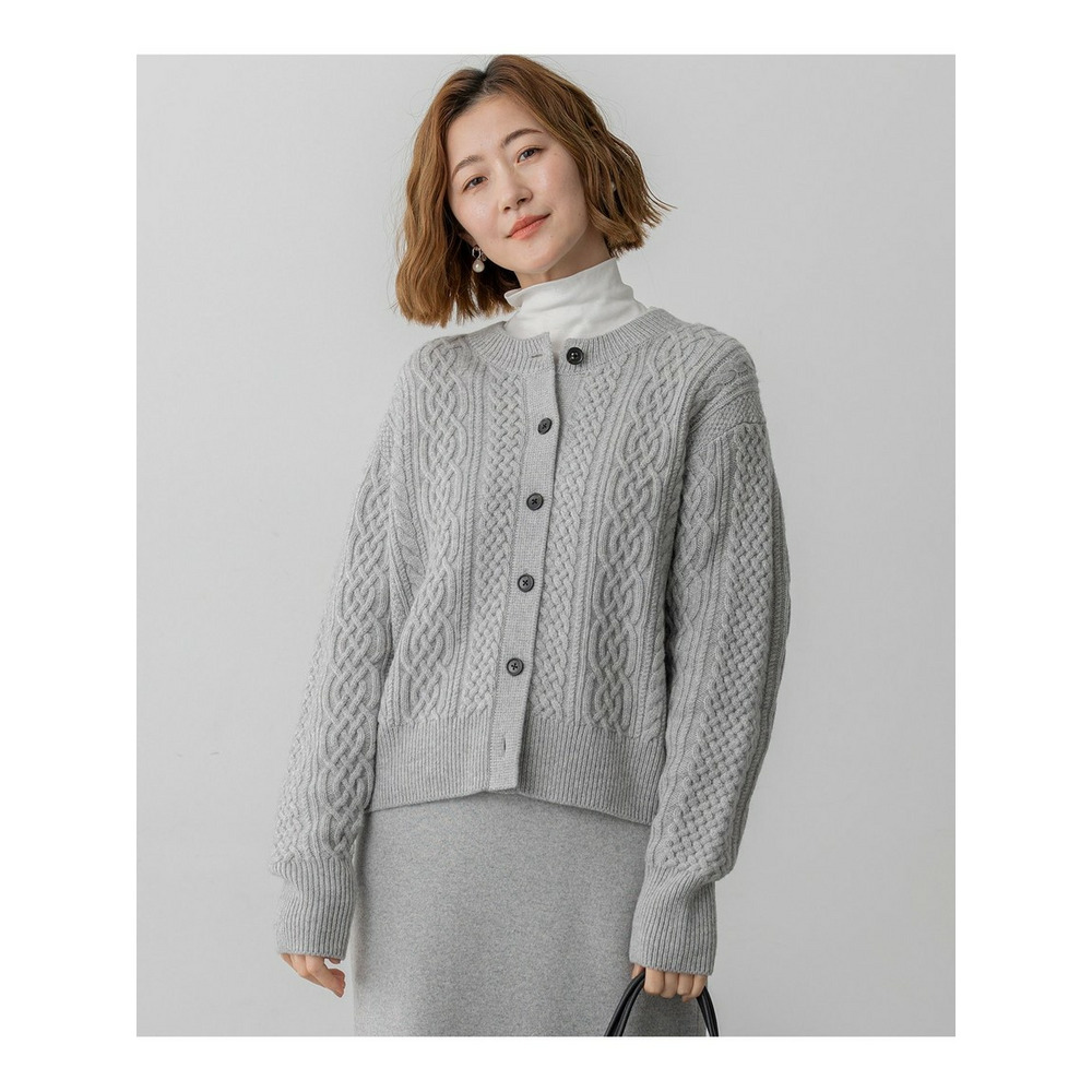 立体感のあるアラン風の編み柄が美しいクルーネックカーディガンです。羽織りとしてはもちろん、ボタンを閉めてプルオーバーのように着るのもおすすめです。程よくコンパクトな丈感と身幅にこだわっているので、どんなボトムスともバランス良く着こなせます。コートの肩掛けやトッピングとしても柄編みが映えるので、様々な着こなしを楽しめます。カラーは、カジュアルスタイルに映えるライトグレー(#003)、印象引き締まるグレー(#004)、やさしい雰囲気のベージュ(#033)、さわやかなライトグリーン(#062)の4色展開です。