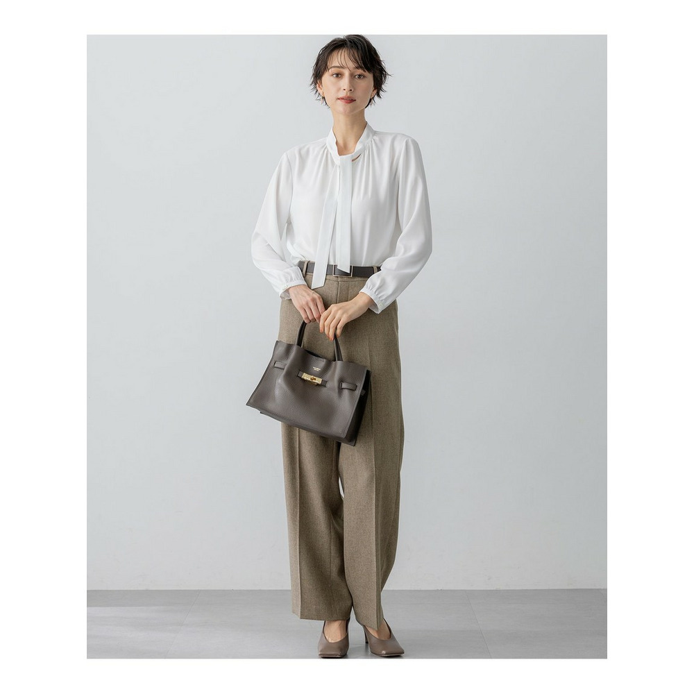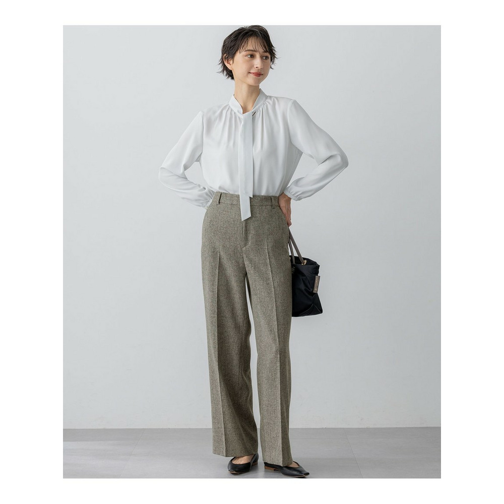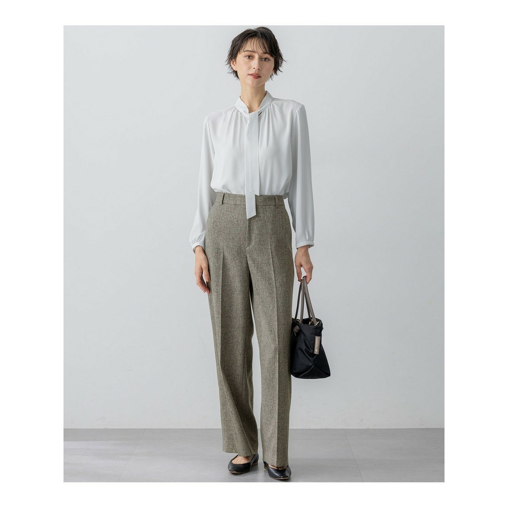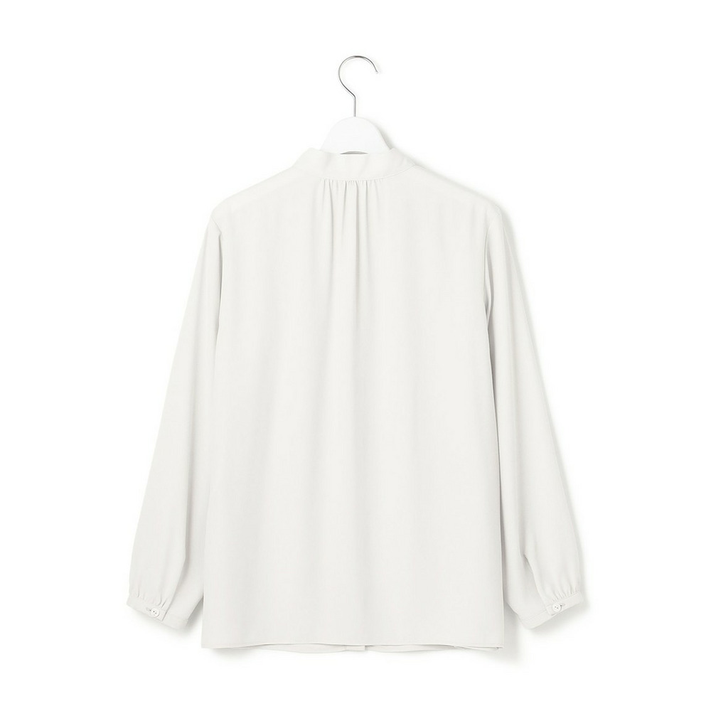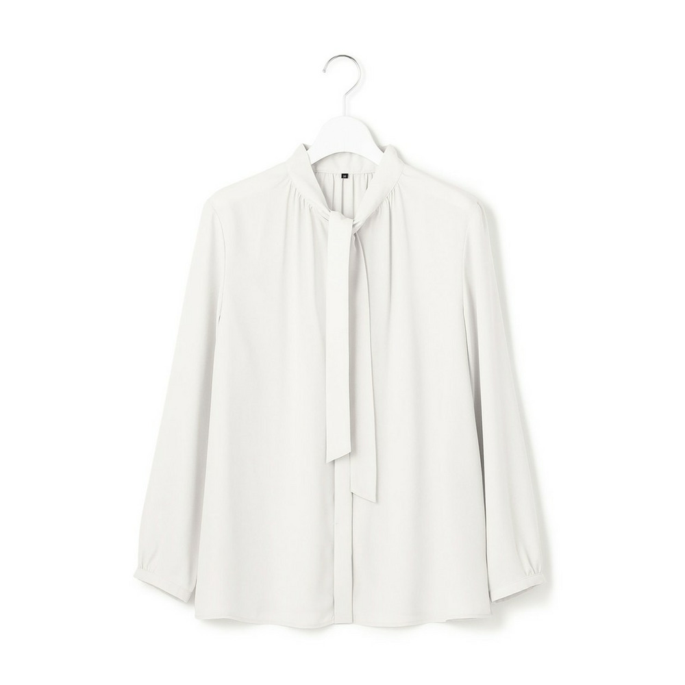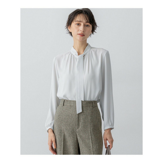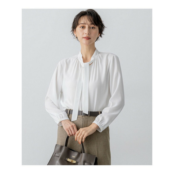 上品な細めのボウタイがポイントのブラウスです。1枚着としてはもちろん、スーツのインナーとしても活躍します。スーツのインナーとしてご着用いただいた際、ボウタイをさらっと1回絡げて頂くとスタイリングに適度なアクセントをプラスしてくれます。着まわしの効く汎用性の高さも魅力です。カラーは、こなれ感のあるライトグレー(#003)と、クリーンな印象のホワイト(#001)の2色展開です。