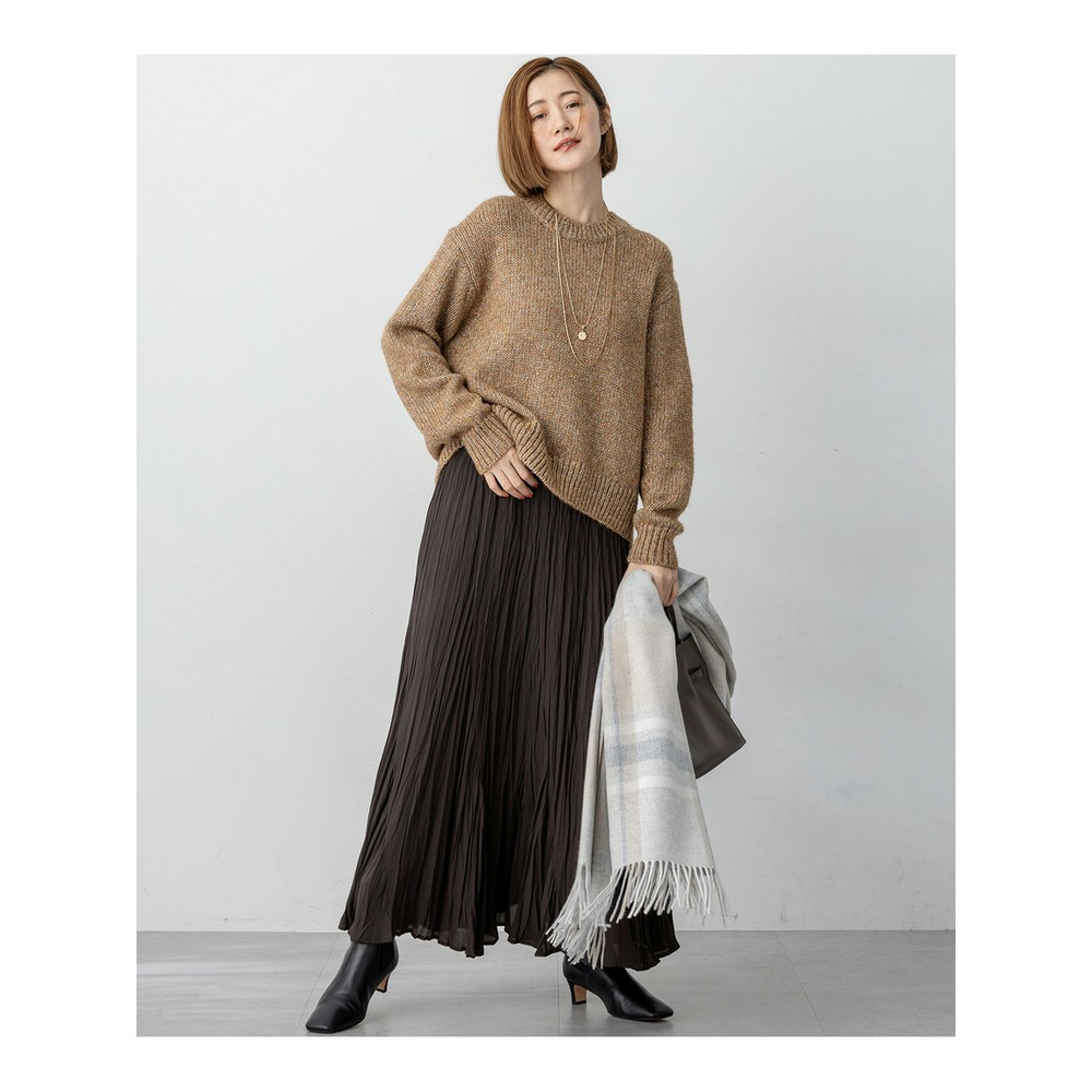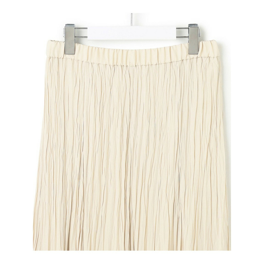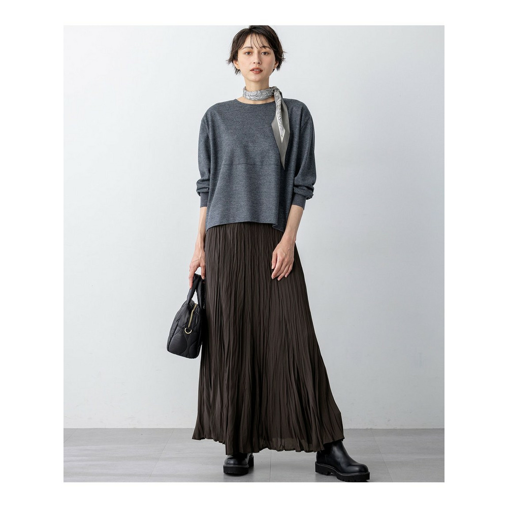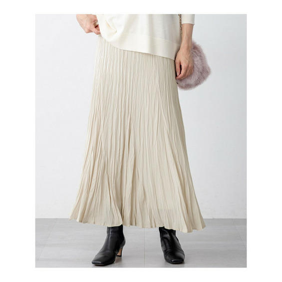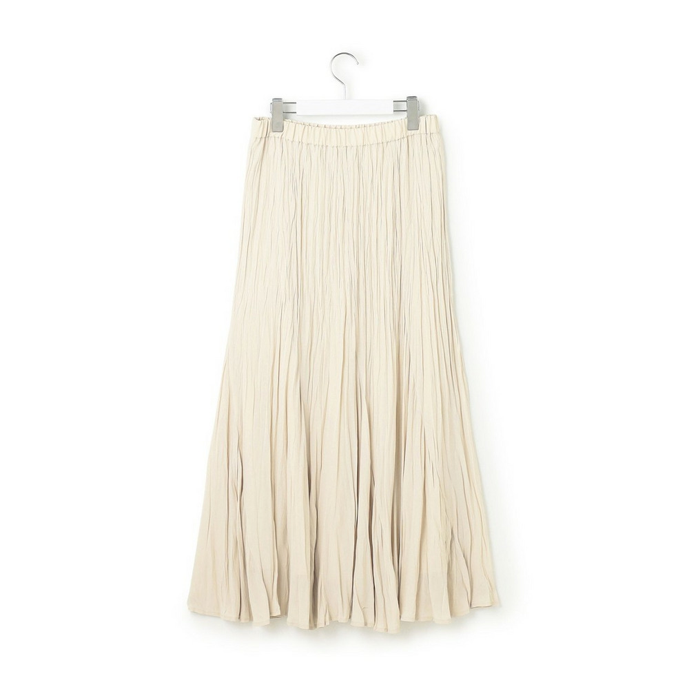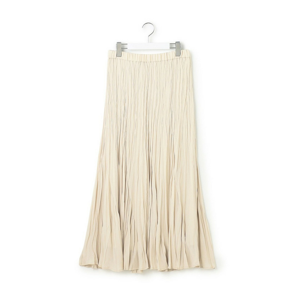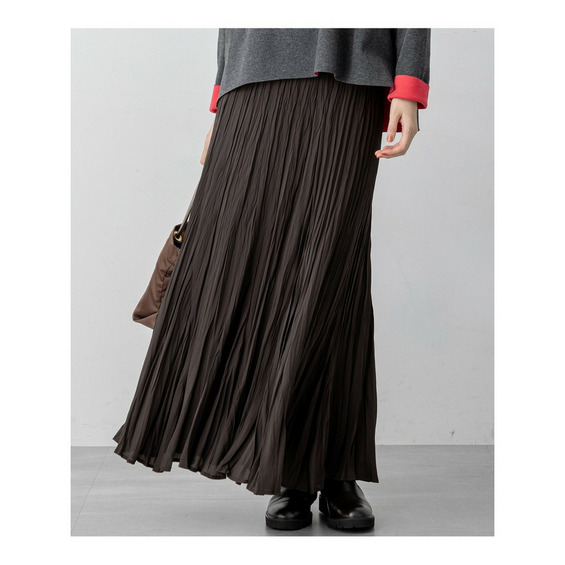 ランダムに絞ったプリーツ加工をかけて陰影のある表情を出したロングスカート。均一なプリーツよりもカジュアルな雰囲気ですが、広がりすぎないナローシルエットで上品な印象に。シワになっても気にならないため、旅行の時にもおすすめです。キレイめからカジュアルまで合わせやすく、ゆるめのニットや、ジャケットでも決まる万能アイテム。カラーは、柔らかなベージュ(#033)と秋らしいダークブラウン(#035)の2色展開です。